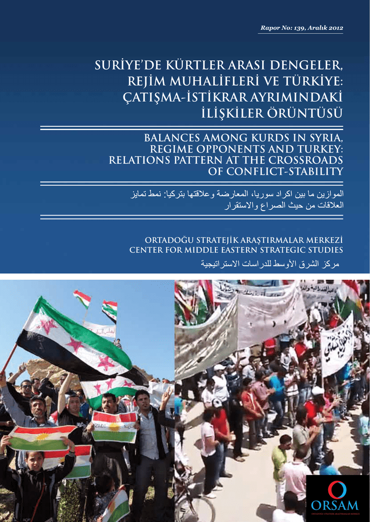 Rapor No: 139, Aralık 2012 SURİYE’DE KÜRTLER ARASI DENGELER, REJİM MUHALİFLERİ VE TÜRKİYE: ÇATIŞMA-İSTİKRAR AYRIMINDAKİ İLİŞKİLER ÖRÜNTÜSÜ BALANCES AMONG KURDS IN SYRIA, REGIME OPPONENTS AND TURKEY: RELATIONS PATTERN AT THE CROSSROADS OF CONFLICT-STABILITY ORTADOĞU STRATEJİK ARAŞTIRMALAR MERKEZİ Ortadoğu Stratejik Araştırmalar Merkezi CENTERCenter FOR MIDDLE EASTERN STRATEGIC for Mıddle Eastern Strategıc STUDIES Studıes مركز الشرق األوسط للدراسات االستراتيجية ORSAM ORTADOĞU STRATEJİK ARAŞTIRMALAR MERKEZİ SURİYE’DE KÜRTLER ARASI DENGELER, REJİM MUHALİFLERİ VE TÜRKİYE: ÇATIŞMA-İSTİKRAR AYRIMINDAKİ İLİŞKİLER ÖRÜNTÜSÜ BALANCES AMONG KURDS IN SYRIA, REGIME OPPONENTS AND TURKEY: RELATIONS PATTERN AT THE CROSSROADS OF CONFLICT-STABILITY ORSAM Rapor No: 139 Aralık 2012 ISBN: 978-605-4615-36-0 $QNDUD7h5.ú<(256$0 !"# $%&'# #(%(!()*) + * )'%) , (#,(, )((,.))) (, /(#&'0*00#((). ORSAM STRATEJİK BİLGİ YÖNETİMİ, ÖZGÜR DÜŞÜNCE ÜRETİMİ ORTADOĞU STRATEJİK ARAŞTIRMALAR MERKEZİ Tarihçe !!" #$%&'()#%&*+, .' + / /+% '.' $ + / 0 0+1./ /// /.' . + /.'' '2 +#.' ./0 . +3 4 2 / ' ./ 0 + !" "#$%& & #'& (& )#%& // /'' / + 5 6 + 7 .'.0 / +)#%&8.// ' //+)#%& 9 %' 7 /' . / +1./ $/' #, / // + www.orsam.org.tr Yrd. Doç.Dr. Serhat Erkmen 1975 İstanbul doğumlu olan Serhat Erkmen, Lisans Eğitimini Ankara Üniversitesi Siyasal Bilgiler Fakültesi Uluslararası İlişkiler Bölümü’nde görmüştür. Yüksek Lisans ve Doktora Çalışmasını Ankara Üniversitesi Sosyal Bilimler Enstitüsü’nde tamamlamıştır. 2000-2008 yılları arasında Avrasya Stratejik Araştırmalar Merkezi’nde Ortadoğu Araştırmacısı olarak görev yapan Erkmen, 2009 yılından bu yana ORSAM Ortadoğu Danışmanı olarak çalışmaktadır. Erkmen aynı zamanda 2009 yılından bu yana Kırşehir Ahi Evran Üniversitesi Uluslararası İlişkiler Bölümü Başkanlığı görevini yürütmektedir. ! " #" $ % &'$ $ %$ " $ $ $ ! $ " ( " " # $ $ " ! $ " ) $ " ( # $ " ! ( " ( %*+, ! ( ". '$ . '$ ( $ $ " / 0$ 0 ( ) # '$ $ ! ( ! (1 ! *'$ $ " ! ' $ ( ! ' . ! $ $ $ 2 % ! . ! ( ( ". ( $ 0 ) $ # . Hasan Kanbolat ORSAM Başkanı 4 ORSAM 5DSRU1R$UDOÜN İçindekiler Takdim ..........................................................................................................................................................4 Özet ..............................................................................................................................................................7 Giriş ..............................................................................................................................................................8 1. Suriye’de Kürt Siyasi Partilerinin Durumu: İşbirliği ve Güç Mücadelesi ..................................9 2. Türkiye ve Suriyeli Kürtler: Yakın Tarih, Akrabalık ve Esinlenme .............................................12 3. Türkiye ve Suriye Kürtleri: Algı Sorunu, Tıkanmışlık ve Bir Arada Yaşama ............................14 4. Suriyeli Kürtler ile Diğer Muhalefet Örgütleri Arasındaki İlişkiler: Düşmanımın Düşmanı Dostumdur ..................................................................................................16 Sonuç ve Öneriler ........................................................................................................................................19 Söyleşiler ........................................................................................................................................................21 1. Kürtçe adı Partiya Azadî ya Kurdî li Sûriyê olan ve kısaca Azadi olarak bilinen Suriye Kürt Özgürlük Partisi’nin Genel Sekreteri Mustafa Cuma ile Görüşme ...............................................................................................................21 2. Irak Kürt Bölgesel Hükümeti Bakan Yardımcısı, Kürt Bölgesel Hükümetinin Suriye Kürtleri Dosyasını Yürüten Yetkili Dr. Hamit Ahmet Derbendi ile Görüşme ........................................................................................24 3. Birleşmiş Milletler Mülteciler Yüksek Komiserliği (UNHCR) Adli Memuru (Legal Officer) Nadjia Hafsa ile Görüşme .............................................................27 4. Kürtçe adı Partiya Azadî ya Kurdî li Sûriyê olan ve kısaca Azadi olarak bilinen Suriye Kürt Özgürlük Partisi’nin Kuzey Irak Temsilcisi Mahmut Ahmet Arabo ile Görüşme ...............................................................................................29 5. Suriye Kürt Islah (Reform) Hareketi (Kürtçe Adı Bizutnava Çaksaci – Arapça Adı Harket-ul Islah) Kuzey Irak Temsilcisi Cedan Ali ile Görüşme ................................................................................32 ORSAM 5DSRU1R$UDOÜN 5 ORSAM Rapor No: 139, Aralık 2012 Hazırlayan: ORSAM Yrd. Doç.Dr. Serhat Erkmen ORTADOĞU STRATEJİK ARAŞTIRMALAR MERKEZİ SURİYE’DE KÜRTLER ARASI DENGELER, REJİM MUHALİFLERİ VE TÜRKİYE: ÇATIŞMA-İSTİKRAR AYRIMINDAKİ İLİŞKİLER ÖRÜNTÜSÜ Özet - Suriye’deki Kürt siyasal yelpazesinde 4 ana eğilim olduğu söylenebilir: PYD ve bağlantılı örgütler, Suriye KDP’si ve uzantısı olan partiler, gençlik hareketleri ve sessiz kitle - İran’da PJAK, Irak’ta PÇDK ne ise Suriye’de PYD odur. Kısacası PYD büyük ölçüde PKK’nın Suriye’deki kanadı gibidir. - 19-23 Temmuz arasında yaşanan süreç, Suriye Kürtleri arasındaki uzlaşma çabalarını en çok etkileyen olay olmuştur. Temmuz ayı başında Erbil’de KUK ile TEV-DEM arasındaki anlaşma sonucunda kurulan Kürt Yüksek Konseyi, Kürtlerin kontrol altına altığı bölgeleri yöneten temel güç durumuna gelmiştir. - Türkiye’de son dönemde artan terör saldırıları Suriye’deki iç savaşın dönemsel bir yansıması mıdır? Yoksa, Suriye’de u