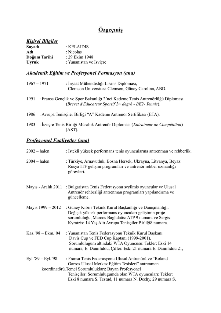 Özgeçmiş Kişisel Bilgiler Soyadı Adı Doğum Tarihi Uyruk : KELAIDIS : Nicolas : 29 Ekim 1948 : Yunanistan ve İsviçre Akademik Eğitim ve Profesyonel Formasyon (ana) 1967 – 1971 : İnşaat Mühendisliği Lisans Diploması, Clemson Universitesi Clemson, Güney Carolina, ABD. 1991 : Fransa Gençlik ve Spor Bakanlığı 2’nci Kademe Tenis Antrenörlüğü Diploması (Brevet d'Educateur Sportif 2 degré - BE2- Tennis). eme 1986 : Avrupa Tenisçiler Birliği “A” Kademe Antrenör Sertifikası (ETA). 1983 : İsviçre Tenis Birliği Müsabık Antrenör Diploması (Entraîneur de Compétition) (AST). Profesyonel Faaliyetler (ana) 2002 – halen : İstekli yüksek performans tenis oyuncularına antrenman ve rehberlik. 2004 – halen : Türkiye, Arnavutluk, Bosna Hersek, Ukrayna, Litvanya, Beyaz Rusya ITF gelişim programları ve antrenör rehber uzmanlığı görevleri. Mayıs - Aralık 2011 : Bulgaristan Tenis Federasyonu seçilmiş oyuncular ve Ulusal Antrenör rehberliği antrenman programları yapılandırma ve güncelleme. Mayıs 1999 – 2012 : Güney Kıbrıs Teknik Kurul Başkanlığı ve Danışmanlığı. Değişik yüksek performans oyuncuları gelişimin proje sorumluluğu, Marcos Baghdatis: ATP 9 numara ve Sergis Kyratzis: 14 Yaş Altı Avrupa Tenisçiler Birliği8 numara. Kas.’98 – Ekm.’04 : Yunanistan Tenis Federasyonu Teknik Kurul Başkanı. Davis Cup ve FED Cup Kaptanı (1999-2001). Sorumluluğum altındaki WTA Oyuncusu: Tekler: Eski 14 numara, E. Daniilidou, Çifler: Eski 21 numara E. Daniilidou 21, Eyl.’89 – Eyl.’98 : Fransa Tenis Federasyonu Ulusal Antrenörü ve “Roland Garros Ulusal Merkez Eğitim Tesisleri” antrenman koordinatörü.Temel Sorumlulukları: Bayan Profesyonel Tenisçiler: Sorumluluğumda olan WTA oyuncuları: Tekler: Eski 8 numara S. Testud, 11 numara N. Dechy, 29 numara S. Pitkowski, 37 numara A. Fusai. Ara sıra eski 3 numara Mary Pierce. Çiftler: Eski 6 numara A. Fusai, eski 8 numara N. Dechy, eski 9 numara S. Testud. Oca.’82 – Ara.’88 : İsviçre Tenis Fedrasyonu Ulusal Antrenörü ve FED Cup Kaptanı. “Lozan Ulusal Eğitim Merkezi” sorumlusu. Merkezde çalışan en iyi oyuncular: Eski ATP 9 numara Marc Rosset, Sorumluluğum altında WTA oyuncuları: Tekler: Eski 27 numara E. Zardo, eski 28 numara C. Jolissaint, eski 48 numara L. Drescher; Çiftler: Eski 26 numara C. Jolissaint, eski 40 numara L. Drescher, FED Cup Takımının aldığı en iyi sonuç: Yarı Final (Zürih 1983), Çeyrek Final (San Francisco 1982 ve Vancouver 1987) 1971 – 1981 : Profesyonel Tenis Oyuncusu. Müsabaka 1977 – 1981 : İsviçre erkekler klasmanı No 2 ve No 9. 1974, 1978 : Yunanistan Erkekler Ulusal Şampiyonluğu. 1974 : Yunanistan Milli Takımı ile Balkan Şampiyonluğu. Ankara, Türkiye. 1973 – 1979 : Yunanistan erkekler klasmanı No 1 ve No 2. 1973-1978 : Wimbledon, Fransa Açık ve Avustralya Açık tecrübesi. 1973 – 1978 : Yunanistan Davis Cup oyuncusu. 1973 – halen : Profesyonel Tensiçiler Birliği (ATP Tur) üyeliği. 1967 – 1971 : ABD Üniversite Ligi, ACC Konferans Şampiyonluğu, 1969. 1964 – 1966 : Yunanistan Gençler Şampiyonluğu. Ekim 2014
