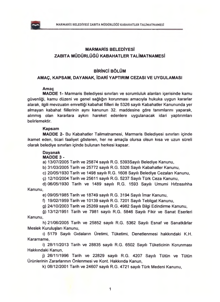 MARM ARİS BELEDİYESİ ZABITA MÜDÜRLÜĞÜ KABAHATLER TALİM ATNAM ESİ MARMARİS BELEDİYESİ ZABITA MÜDÜRLÜĞÜ KABAHATLER TALİMATNAMESİ BİRİNCİ BÖLÜM AMAÇ, KAPSAM, DAYANAK, İDARİ YAPTIRIM CEZASI VE UYGULAMASI Amaç MADDE 1- Marmaris Belediyesi sınırları ve sorumluluk alanları içerisinde kamu güvenliği, kamu düzeni ve genel sağlığın korunması amacıyla hukuka uygun kararlar alarak, ilgili mevzuatın emrettiği kabahat fiilleri ile 5326 sayılı Kabahatler Kanununda yer almayan kabahat fiillerinin aynı kanunun 32. maddesine göre tanımlarını yaparak, alınmış olan kararlara aykırı hareket edenlere uygulanacak idari yaptırımları belirlemektir. Kapsam MADDE 2- Bu Kabahatler Talimatnamesi, Marmaris Belediyesi sınırları içinde ikamet eden, ticari faaliyet gösteren, her ne amaçla olursa olsun kısa ve uzun süreli olarak belediye sınırları içinde bulunan herkesi kapsar. Dayanak MADDE 3 a) 13/07/2005 Tarih ve 25874 sayılı R.G. 5393Sayılı Belediye Kanunu, b) 31/03/2005 Tarih ve 25772 sayılı R.G. 5326 Sayılı Kabahatler Kanunu, c) 20/05/1930 Tarih ve 1498 sayılı R.G. 1608 Sayılı Belediye Cezaları Kanunu, ç) 12/10/2004 Tarih ve 25611 sayılı R.G. 5237 Sayılı Türk Ceza Kanunu, d) 06/05/1930 Tarih ve 1489 sayılı R.G. 1593 Sayılı Umumi Hıfzıssıhha Kanunu, e) 09/05/1985 Tarih ve 18749 sayılı R.G. 3194 Sayılı imar Kanunu, f) 19/02/1959 Tarih ve 10139 sayılı R.G. 7201 Sayılı Tebligat Kanunu, g) 24/10/2003 Tarih ve 25269 sayılı R.G. 4982 Sayılı Bilgi Edindirme Kanunu, ğ) 13/12/1951 Tarih ve 7981 sayılı R.G. 5846 Sayılı Fikir ve Sanat Eserleri Kanunu, h) 21/06/2005 Tarih ve 25852 sayılı R.G. 5362 Sayılı Esnaf ve Sanatkârlar Meslek Kuruluşları Kanunu, ı) 5179 Sayılı Gıdaların Üretimi, Tüketimi, Denetlenmesi hakkındaki K.H. Kararname, i) 28/11/2013 Tarih ve 28835 sayılı R.G. 6502 Sayılı Tüketicinin Korunması Hakkındaki Kanun, j) 26/11/1996 Tarih ve 22829 sayılı R.G. 4207 Sayılı Tütün ve Tütün Ürünlerinin Zararlarının önlenmesi ve Kont. Hakkında Kanun, k) 08/12/2001 Tarih ve 24607 sayılı R.G. 4721 sayılı Türk Medeni Kanunu, 1 MARM ARİS BELEDİYESİ ZABITA MÜDÜRLÜĞÜ KABAHATLER TALİM ATNAM ESİ I) 13/01/2011 Tarih ve 27846 sayılı R.G. 6102 sayılı Türk Ticaret Kanunu, m)19/12/2007 Tarih ve 26735 sayılı R.G. Binaların Yangından Korunması Hakkında Yönetmelik, n) 11/04/2007 Tarih ve 26490 sayılı R.G. Zabıta Yönetmeliği, o) 10/08/2005 Tarih ve 25902 sayılı R.G. İşyeri Açma ve Çalışma Ruhsatlarına İlişkin Yönetmelik, ö) Diğer mevzuat hükümleri, İdari Yaptırım Cezası ve Uygulaması MADDE 4a) Bu talimatnamede belirtilen kabahatler için uygulanan para cezaları, 765 Sayılı Türk Ceza Kanunu’nun Ek 2 maddesini değiştiren 4421 Sayılı Kanun’un 5 inci maddesinde "Kanunlardaki para cezaları, her takvim yılı başından geçerli olmak üzere, o yıl için 213 Sayılı Vergi Usul Kanunu’nun 298 inci maddesi hükümleri uyarınca tespit ve ilan edilen yeniden değerlendirme oranında artırılarak uygulanır" hükmüne istinaden belirlenir. b) Yaptırımlar 5326 Sayılı Kabahatler Kanunu’nun 16 ncı maddesine göre İdari Tedbirler ve idari para cezasından ibaret olup, 32nci maddeye göre sıralanmış olan bu fiilleri işleyenlerden, işledikleri fiil idari para cezasını gerektirmeyenler ve işledikleri fiil idari para cezasını gerektirdiği halde ödemeyenler hakkında tutanak düzenlenir. c) Bu talimatnameye aykırı hareketlerde bulunan gerçek veya tüzel kişilere, kabahat mahallinde düzenlenen tutanakta, her kabahat ayrı ayrı belirtilir veya her kabahate ayrı bir tutanak düzenlenir. Aynı kabahat birden fazla ise kabahatin adı ve sayısı belirtilir. ç) Bir fiil ile birden fazla kabahat işlenmiş ve bu kabahatlere, Kabahatler Kanununda idari Para Cezası belirlenmiş ise fiillerden idari para cezası en ağır olanı uygulanır. d) Kabahatler Kanununda karşılığı para cezası olarak belirlenmiş kabahatlere düzenlenen idari yaptırım tutanaklarında birden fazla kabahat yazılmaz, ayrı ayrı tutanak düzenlenir. e) ilgili imzadan kaçınır ise bu durum tutanakta belirtilerek, 7201 Sayılı Tebligat Kanunu ve 5326 Sayılı Kabahatler Kanunu’nun 25/b-26(2) mad. istinaden tutanağın bir sureti gözü önünde tutanağı düzenleyen memurlarca imzalandıktan sonra, iş yerine veya kabahat mahalline bırakılır. f) Belediye zabıtasınca Kabahat fiili için düzenlenen Durum Tespit idari Yaptırım Karar Tutanakları gerekli kararı vermek üzere Belediye Encümeni’ne, idari Yaptırım Karar Tutanakları ise, 15 (On beş) günlük yasal süre sonunda tutanakta belirtilen para cezasının tahsil edilmesi için Mali Hizmetler Müdürlüğü’ne gönderilir. g) idari para cezasını gerektiren bir kabahat fiilini işlediklerinden dolayı haklarında idari Yaptırım Karar Tutanağı düzenlenen gerçek veya tüzel kişilerce derhal ödeme talebinde bulunulur ise, görevli memurlarca idari para cezasının 3/4 (Dörtte üçü) 2 M ARM ARtS BELEDİYESİ ZABITA MÜDÜRLÜĞÜ KABAHATLER TALİM ATNAM ESİ düzenlenecek Tahsilât Makbuzu karşılığı 5326 Sayılı Kabahatler Kanununun 17-(6) maddesine istinaden tahsil edilir. İKİNCİ BÖLÜM UYULMASI ZORUNLU OLAN VE YASAKLANAN FİİLLERLE İLGİLİ GENEL HÜKÜMLER MADDE 5- Belediye Zabıta Memurlarının görevlerini yaptıkları sırada, talep edilen bilgi ve belgeleri göstermemek, yanlış ve asılsız bildirimde bulunmak, görevlerini engelleyici biçimde zorluk çıkarmak, kamuoyu oluşturmak suretiyle görevlilere müdahalede bulunmak yasaktır. MADDE 6- işyeri sahipleri çalıştırdığı personelin işlemiş olduğu kabahatlerden sorumludur. MADDE 7- işyeri Açma ve Çalışma Ruhsatı almadan faaliyette bulunulamaz. MADDE 8- 394 Sayılı Hafta Tatili Hakkında Kanun gereği Tatil Günleri Çalışma Ruhsatı alması gereken işletmeler, Tatil Gü