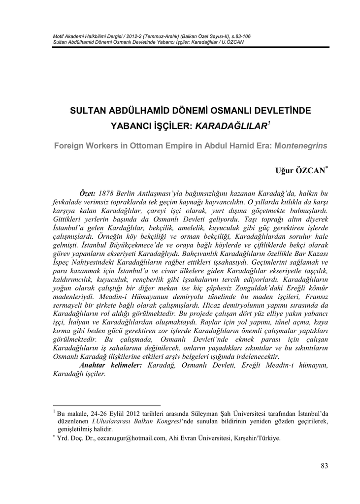 Motif Akademi Halkbilimi Dergisi / 2012-2 (Temmuz-Aralık) (Balkan Özel Sayısı-II), s.83-106 Sultan Abdülhamid Dönemi Osmanlı Devletinde Yabancı İşçiler: Karadağlılar / U.ÖZCAN SULTAN ABDÜLHAMİD DÖNEMİ OSMANLI DEVLETİNDE YABANCI İŞÇİLER: KARADAĞLILAR1 Foreign Workers in Ottoman Empire in Abdul Hamid Era: Montenegrins Uğur ÖZCAN Özet: 1878 Berlin Antlaşması’yla bağımsızlığını kazanan Karadağ’da, halkın bu fevkalade verimsiz topraklarda tek geçim kaynağı hayvancılıktı. O yıllarda kıtlıkla da karşı karşıya kalan Karadağlılar, çareyi işçi olarak, yurt dışına göçetmekte bulmuşlardı. Gittikleri yerlerin başında da Osmanlı Devleti geliyordu. Taşı toprağı altın diyerek İstanbul’a gelen Kardağlılar, bekçilik, amelelik, kuyuculuk gibi güç gerektiren işlerde çalışmışlardı. Örneğin köy bekçiliği ve orman bekçiliği, Karadağlılardan sorulur hale gelmişti. İstanbul Büyükçekmece’de ve oraya bağlı köylerde ve çiftliklerde bekçi olarak görev yapanların ekseriyeti Karadağlıydı. Bahçıvanlık Karadağlıların özellikle Bar Kazası İspeç Nahiyesindeki Karadağlıların rağbet ettikleri işsahasıydı. Geçimlerini sağlamak ve para kazanmak için İstanbul’a ve civar ülkelere giden Karadağlılar ekseriyetle taşçılık, kaldırımcılık, kuyuculuk, rençberlik gibi işsahalarını tercih ediyorlardı. Karadağlıların yoğun olarak çalıştığı bir diğer mekan ise hiç şüphesiz Zonguldak’daki Ereğli kömür madenleriydi. Meadin-i Hümayunun demiryolu tünelinde bu maden işçileri, Fransız sermayeli bir şirkete bağlı olarak çalışmışlardı. Hicaz demiryolunun yapımı sırasında da Karadağlıların rol aldığı görülmektedir. Bu projede çalışan dört yüz elliye yakın yabancı işçi, İtalyan ve Karadağlılardan oluşmaktaydı. Raylar için yol yapımı, tünel açma, kaya kırma gibi beden gücü gerektiren zor işlerde Karadağlıların önemli çalışmalar yaptıkları görülmektedir. Bu çalışmada, Osmanlı Devleti’nde ekmek parası için çalışan Karadağlıların iş sahalarına değinilecek, onların yaşadıkları sıkıntılar ve bu sıkıntıların Osmanlı Karadağ ilişkilerine etkileri arşiv belgeleri ışığında irdelenecektir. Anahtar kelimeler: Karadağ, Osmanlı Devleti, Ereğli Meadin-i hümayun, Karadağlı işçiler. 1 Bu makale, 24-26 Eylül 2012 tarihleri arasında Süleyman Şah Üniversitesi tarafından İstanbul’da düzenlenen I.Uluslararası Balkan Kongresi’nde sunulan bildirinin yeniden gözden geçirilerek, genişletilmiş halidir. Yrd. Doç. Dr., [email protected], Ahi Evran Üniversitesi, Kırşehir/Türkiye. 83 Motif Akademi Halkbilimi Dergisi / 2012-2 (Temmuz-Aralık) (Balkan Özel Sayısı-II) Abstract: Montenegrin people who achieved their independence with the Berlin Treaty were doing stockbreeding as the only source of living in their nonfertile lands. As having faced a famine in those years, Montenegrins started to migrate abroad in order to work and earn money. One of the places they preferred to go was the Ottoman Empire. Montenegrins who came to Istanbul as if its streets were paved with gold worked in physically demanding jobs like watchman, navvy and well-sinker. Most of the watchmen working in some villages and ranches in Büyükçekmece in Istanbul were Montenegrin. Village and forest guarding were firstly coming under Montenegrins. Gardening was also a work area demanded by Montenegrins especially by ones from İspeç town of Bar district. After having gone to Istanbul and the neighbouring countries in order to earn their keep, Montenegrins toiled in works of stone, kerb, well etc. as countrymen. Another place where Montenegrins worked most was the coal mines of Ereğli in Zonguldak. These coalminers were working in railroad tunnels in Meadin-i Humayun under a company capitalized by French. Construction of Hejaz railway was another site of labour where Montenegrins were employed. Nearly 450 foreign workers there were composed of Italian and Montenegrins. They laboured in physically demanding works like tunnel driving and rock breaking for railway construction.In this paper, we will touch on the work areas of Montenegrins who were working to earn a living for their families in the Ottoman Empire and we will address their problems and effects of these problems on Ottoman-Montenegrin relations in the light of some archival documents. Key words: Montenegro, Ottoman Empire, Ereğli Meadin-i Hümayun (Imperial Mines of Ereğli), Montenegrin Workers Giriş Osmanlı Devleti’nde yabancı işçilerin istihdamı çok yeni bir mevzu değildir. İşçi olarak çok farklı ülkelerden gelip, Osmanlı sınırları içinde çalışanlar olmuştur. Ama bunun düzenli bir hale gelmesi 19. yüzyıl ilk çeyreğiyle başlamaktadır. Dış ülkelerden gelen insanlar, taşı toprağı altın Osmanlı topraklarını mekân edinmişlerdir. Çoğunlukla 19.yy çiçeği burnunda bağımsız balkan devletlerinden Anadolu’ya akın eden işçilerin mekân edindiği bu topraklar, Sırp, Macar, Hırvat, Arnavut, İtalyan, Arnavut ve Karadağlı işçilerin ter döktüğü topraklardır. Demiryolunun yapılmaya başlanmasıyla Anadolu’nun ücra köşelerine kadar giden trenler, bir taraftan oralarda inşaatların birer birer yükselmesi ve verimli madenlerin çıkartılarak limanlara taşınması anlamına gelirken, diğer taraftan müthiş bir iş gücü ihtiyacının da beraberinde getirmişti. Abülhamid dönemiyle hız kazanan sanayileşme hamlesi, işgücü ihtiyacını doğururken, ihaleleri alan yabancı devletler, bu madenlerde çalıştırdıkları işçilerle büyük paralar kazanıyorlardı. Göçün terim olarak “dinî, iktisadî, siyasî sosyal ve diğer sebeplerden dolayı insan topluluklarının hayatlarının tamamını veya bir bölümünü geçirmek 84 Sultan Abdülhamid Dönemi Osmanlı Devletinde Yab