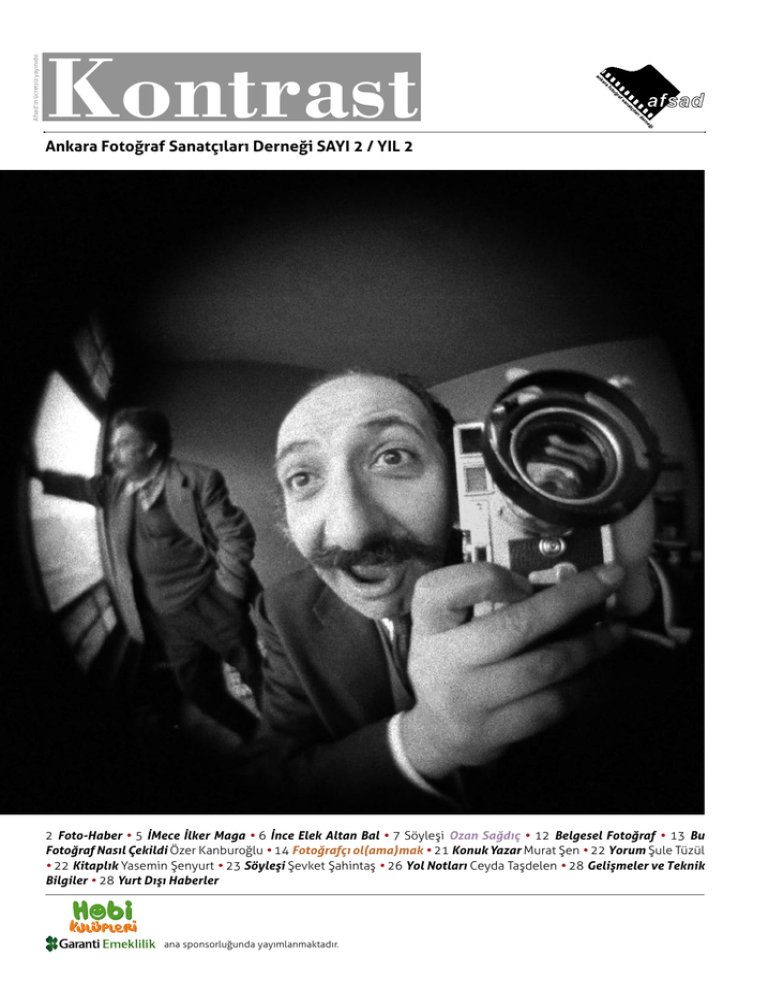 Afsad’ın ücretsiz yayınıdır. Kontrast Ankara Fotoğraf Sanatçıları Derneği SAYI 2 / YIL 2 2 Foto-Haber • 5 İMece İlker Maga • 6 İnce Elek Altan Bal • 7 Söyleşi Ozan Sağdıç • 12 Belgesel Fotoğraf • 13 Bu Fotoğraf Nasıl Çekildi Özer Kanburoğlu • 14 Fotoğrafçı ol(ama)mak • 21 Konuk Yazar Murat Şen • 22 Yorum Şule Tüzül • 22 Kitaplık Yasemin Şenyurt • 23 Söyleşi Şevket Şahintaş • 26 Yol Notları Ceyda Taşdelen • 28 Gelişmeler ve Teknik Bilgiler • 28 Yurt Dışı Haberler ana sponsorluğunda yayımlanmaktadır. Kontrast Başlarken.. Değerli fotoğraf dostları, AFSAD, kurulduğu 1977 yılından bu güne, ülkemiz fotoğraf sanatının eksiklik hissettiği alanlarda, üretkenliğini kullanarak Türkiye fotoğrafına katkılar sunmayı amaç edinmiştir. Fotoğrafçıların örgütlenmesi ve bu alanda dayanışmayı sağlamak için mekân olmanın yanı sıra, kuramsal, bilimsel çalışmaların ilgilileriyle buluşması ve üretilen fotoğrafın günün belgesi sanatsal yaklaşımıyla geniş kitlelerle paylaşılması ve gelecek dönemlere aktarılmasını misyon edinmiştir. Sempozyumların kitaplaşması, yıl sergileri, atölye sergileri ve ulusal yarışmalı sergilerini kataloglaştırarak sabitlenmesi de yine Türkiye fotoğrafına katkı olarak ele alınmış ve bu alanda birçok yayın fotoğraf camiasına sunulmuştur. Yayıncılık alanındaki en önemli üretim ise dergicilik olarak açığa çıkmıştır. 1977 yılında, günün kısıtlı koşullarında hazırlanan, sarı kâğıda basım Fotoğraf Dergisi, sanat başlığındaki fotoğrafa, bugün bile güncelliğini koruyan, katkı sağlayacak bir içeriğe sahiptir. Türkiye’nin en uzun soluklu Fotoğraf Dergisi olan yayınımız, amatör ruh ve profesyonel disiplinle ele alınarak, gerek günün koşulları içerisinde dünya fotoğrafında oluşan tarzlar, üretilen fotoğrafların Türkiyeli fotoğrafçılara tanıtılması, gerekse Türkiye fotoğrafının paylaşmaya değer çalışmalarının diğer fotoğrafçılar ve ilgilileriyle buluşması bakımından önemli bir misyonu yerine getirerek, hissedilen boşluğu doldurmuştur. Bugün ise, ülkemizin yakın tarihindeki fotoğrafın yeni kuşaklarca tanınması ve Türkiye fotoğrafının gelişimini takip etmek için önemli bir kaynaktır. Zaman zaman ekonomik sıkıntıların sonucu olarak yayını aksayan dergimizi Görüntü Duvar Gazetesi olarak sürdürmek ve arşivlemek, Gren başlığında bülteni daha içerikli hâle getirme çabası, sayfa sayısı azaltılarak ve Gazete Kontrast olarak yine geniş kitlelere ulaşma çabası ve genişletilmiş bülten olarak Kontrast’ı yayımlayıp, özellikle dernek içi aktivitelerin geniş tanıtımını sağlayacak bir mecra oluşturmak; aslında derneğimizin dergi yayıncılığı konusunda ne derece motive olduğunun ve ısrarcılığının göstergesidir. Derneğimizin tüm yönetim kadroları, dergi yayıncılığını bırakmamak ve alt yapısını canlı tutmak için çabalarını sürdürmüşlerdir. Elinizde bulunan Kontrast Dergisi, tüm bu sürecin ve alt yapının ürünü olarak; teknolojik değişim ve gelişim sürecinde, geçmiş dönemlere göre çok daha fazla konuşulan, yaygınlaşan fotoğrafın sanat dilini, bu değişim sürecinde yerini bulmaya çalışan yeni fotoğrafçılara ulaştırmak; deneyim ve üretkenliğiyle, Türkiye fotoğrafında sabitlenmiş ustaların yeni nesil fotoğrafçılara rehber olabilmesini sağlamak; fotoğrafın gelişen düşünsel yanını güncellemek, okunurluğunu, tartışılmasını sağlamak; yeni ürün ve tarzları irdelemek, eleştirmek, alkışlamak; günceli yakalamak; fotoğrafı okumak, fotoğrafı okunabilir kılmak için yeniden yayın hayatına başlamıştır. Amatör ruh ve profesyonel disiplinle, dergi yayımcılığında uzmanlaşmış bir kadro ile iki aylık periyotlarla yayımlanacak olan Kontrast Dergi, daha geniş kitlelerle buluşmak üzere yıl boyu ücretsiz olarak ilgilisine ulaştırılacaktır. Dergimizin ana sponsorluğunu üstlenerek, Türkiye fotoğrafı ve sanatına önemli katkı sunan Garanti Emeklilik’e ve reklamlarıyla destekleyen değerli firmalarımıza teşekkür ediyoruz. Günceli değerlendirmek, üretimi desteklemek, değerlendirmek, gelişmek ve geliştirmek üzere; tüm usta fotoğrafçı, yeni fotoğrafçı, fotoğrafçı adayı, yazar, akademisyen, fotoğrafın düşünsel yanına katkı sunan, sunmak isteyen fotoğraf dostlarını, dernek, kulüp yetkililerini, üyelerini, dergi iletişim adreslerinden görüş ve isteklerini derginin yayın kuruluna ulaştırmasını ve katkı sunmalarını beklemekteyiz. AFSAD Ankara Fotoğraf Sanatçıları Derneği Adına Sahibi Gökhan BULUT Yayın Yönetmeni (Sorumlu Müdür) Ceyda TAŞDELEN Yayın Yönetmeni Yardımcısı Şule TÜZÜL Görsel Yönetmen Levent ÇAĞIN Editörler Şirin AYDIN Kamuran FEYZİOĞLU Editör Yardımcıları Nergis AKINCI Elçin POLAT Atakan BAYKOÇAK Reklam ve Abone Sorumlusu Ufuk DURUMAN Yayın Kurulu Ceyda Taşdelen, Şule Tüzül, Şirin Aydın Kamuran Feyzioğlu, Atakan Baykoçak, Ufuk Duruman Yönetim Yeri (Dergi İletişim) AFSAD – Büklüm Sok. No: 22/11 Kavaklıdere – Ankara Tel: 0312 4172115 Faks: 0312 4172116 GSM: 0533 7388208 www.kontrastdergi.com www.afsad.org.tr [email protected] Baskı: Mattek Matbaacılık Basım Yayın Tanıtım San. Tic. Ltd. Sti. Adres: GMK Bulvarı Akyol İshanı No: 83-23 Maltepe - Ankara Tel: 0312 2291502 Basım Tarihi: 01.01.2010 Yayın Türü: Bölgesel ISSN: 1304-1134 Kapak Fotoğrafı: Ozan Sağdıç “Teknik anlamda bütün dijital kurgularım, heyecan ve güçlü fikir duygularına dayanan rüyasal yapıtlara benzeme iddiası taşırlar. Başından beri bütün kurgularım, unutamadığımız rüya parçacıkları gibi, anlamak veya çözümlenmek için değil, izleyicinin kendini fotoğrafta kaybetmesi için tasarlanmıştır.