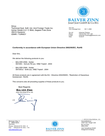 Sirius Technical Syst. Soft. Ind. And Foreign Trade Inc. Ayhan Sokak A-2 / C Blok, Aegean Free Zone 35410 Gaziemir IZMIR / TURKEY Your ref.: Your message from: Our ref.: Phone: E-Mail: Date: 09.11..2006 Johannes Thüsing +49 (0) 2375 915 - 230 [email protected] 12.02.07 Conformity in accordance with European Union Directive 2002/95/EC, RoHS Dear Sirs, We deliver the following products to you: - BALVER ZINN - Solder SN100C - SnCu0,7Ni acc. WBZ TripleX : 2004 - BALVER ZINN - Solder SN100Ce - SnNi acc. WBZ TripleX : 2004 All these products are in agreement with the EU - Directive 2002/95/EC, “Restriction of Hazardous Substances“, RoHS. This concerns also all preceding supplies of these products to you. Best Regards BALVER ZINN Josef Jost GmbH & Co. KG i.V. 2007-02-12 Sirius RoHS.doc 1(1) Blintroper Weg 11 D – 58802 Balve Germany Phone: +49 (0) 23 75 / 915 – 0 Fax: +49 (0) 23 75 / 915 – 114 www.BalverZinn.com Geschäftsführer Josef Jost, Gregor Jost BALVER ZINN HRA 4705 Jost Verwaltung GmbH Amtgericht Arnsberg