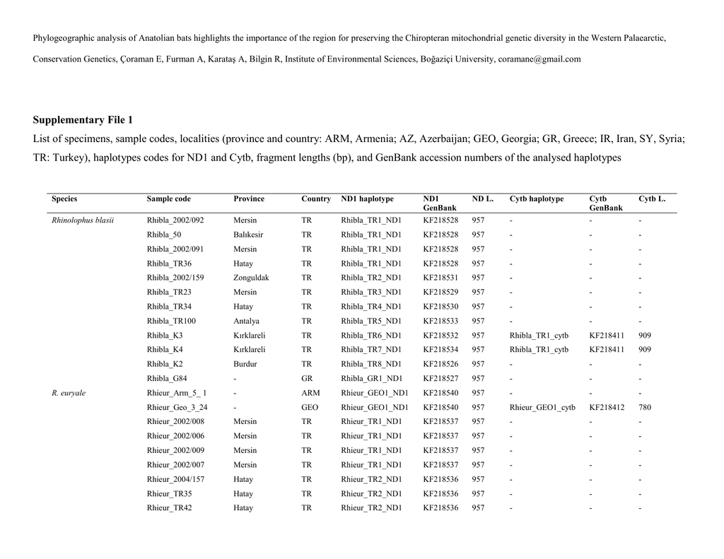 Phylogeographic analysis of Anatolian bats highlights the importance of the region for preserving the Chiropteran mitochondrial genetic diversity in the Western Palaearctic, Conservation Genetics, Çoraman E, Furman A, Karataş A, Bilgin R, Institute of Environmental Sciences, Boğaziçi University, [email protected] Supplementary File 1 List of specimens, sample codes, localities (province and country: ARM, Armenia; AZ, Azerbaijan; GEO, Georgia; GR, Greece; IR, Iran, SY, Syria; TR: Turkey), haplotypes codes for ND1 and Cytb, fragment lengths (bp), and GenBank accession numbers of the analysed haplotypes Species Sample code Province Country ND1 haplotype Rhinolophus blasii Rhibla_2002/092 Mersin TR Rhibla_50 Balıkesir TR Rhibla_2002/091 Mersin Rhibla_TR36 R. euryale ND L. Cytb haplotype Rhibla_TR1_ND1 ND1 GenBank KF218528 Cytb L. - Cytb GenBank - 957 Rhibla_TR1_ND1 KF218528 957 - - - TR Rhibla_TR1_ND1 KF218528 957 - - - Hatay TR Rhibla_TR1_ND1 KF218528 957 - - - Rhibla_2002/159 Zonguldak TR Rhibla_TR2_ND1 KF218531 957 - - - Rhibla_TR23 Mersin TR Rhibla_TR3_ND1 KF218529 957 - - - Rhibla_TR34 Hatay TR Rhibla_TR4_ND1 KF218530 957 - - - Rhibla_TR100 Antalya TR Rhibla_TR5_ND1 KF218533 957 - - - Rhibla_K3 Kırklareli TR Rhibla_TR6_ND1 KF218532 957 Rhibla_TR1_cytb KF218411 909 Rhibla_K4 Kırklareli TR Rhibla_TR7_ND1 KF218534 957 Rhibla_TR1_cytb KF218411 909 Rhibla_K2 Burdur TR Rhibla_TR8_ND1 KF218526 957 - - - Rhibla_G84 - GR Rhibla_GR1_ND1 KF218527 957 - - - Rhieur_Arm_5_ 1 - ARM Rhieur_GEO1_ND1 KF218540 957 - - - Rhieur_Geo_3_24 - GEO Rhieur_GEO1_ND1 KF218540 957 Rhieur_GEO1_cytb KF218412 780 Rhieur_2002/008 Mersin TR Rhieur_TR1_ND1 KF218537 957 - - - Rhieur_2002/006 Mersin TR Rhieur_TR1_ND1 KF218537 957 - - - Rhieur_2002/009 Mersin TR Rhieur_TR1_ND1 KF218537 957 - - - Rhieur_2002/007 Mersin TR Rhieur_TR1_ND1 KF218537 957 - - - Rhieur_2004/157 Hatay TR Rhieur_TR2_ND1 KF218536 957 - - - Rhieur_TR35 Hatay TR Rhieur_TR2_ND1 KF218536 957 - - - Rhieur_TR42 Hatay TR Rhieur_TR2_ND1 KF218536 957 - - - - R. ferrumequinum R. hipposideros Rhieur_2001/155 Zonguldak TR Rhieur_TR3_ND1 KF218538 957 - - - Rhieur_2001/154 Zonguldak TR Rhieur_TR3_ND1 KF218538 957 - - - Rhieur_257 Kocaeli TR Rhieur_TR4_ND1 KF218539 957 - - - Rhieur_2004/257 Kocaeli TR Rhieur_TR4_ND1 KF218539 957 - - - Rhieur_326 Sinop TR Rhieur_TR5_ND1 KF218535 957 - - - Rhieur_2001/141 Denizli TR Rhieur_TR6_ND1 KF218541 957 - - - Rhieur_5_10 Aydın TR - - - Rhieur_TR1_cytb KF218413 780 Rhieur_83 Zonguldak TR - - - Rhieur_TR1_cytb KF218413 780 Rhieur_10 Eskişehir TR - - - Rhieur_TR2_cytb KF218414 780 Rhifer_2004/114 Gaziantep TR Rhifer_TR1_ND1 KF218542 957 Rhifer_TR1_cytb KF218415 Rhifer_2003/060 Balıkesir TR Rhifer_TR1_ND1 KF218542 957 - - - Rhifer_2004/310 Karabük TR Rhifer_TR1_ND1 KF218542 957 - - - Rhifer_2004/299 Zonguldak TR Rhifer_TR1_ND1 KF218542 957 - - - Rhifer_2003/032 Kars TR Rhifer_TR2_ND1 KF218544 957 Rhifer_TR6_cytb KF218418 803 Rhifer_105 Eskişehir TR Rhifer_TR3_ND1 KF218550 957 Rhifer_TR4_cytb KF218417 803 Rhifer_119 Tekirdağ TR Rhifer_TR4_ND1 KF218551 957 Rhifer_TR1_cytb KF218415 803 Rhifer_2002/157 Mardin TR Rhifer_TR5_ND1 KF218548 957 Rhifer_TR2_cytb KF218419 803 Rhifer_2002/174 Niğde TR Rhifer_TR6_ND1 KF218549 957 Rhifer_TR5_cytb KF218416 803 Rhifer_2002/068 Van TR Rhifer_TR7_ND1 KF218546 957 - - - Rhifer_2003/076 Çanakkale TR Rhifer_TR8_ND1 KF218543 957 - - - Rhifer_2004/158 Hatay TR Rhifer_TR9_ND1 KF218545 957 Rhifer_TR3_cytb KF218420 803 Rhifer_2004/170 Şanlıurfa TR Rhifer_TR10_ND1 KF218547 957 - - - Rhihip_2003/061 Balıkesir TR Rhihip_TR1_ND1 KF218563 957 - - - Rhihip_2004/294 Zonguldak TR Rhihip_TR1_ND1 KF218563 957 - - - Rhihip_2004/301 Zonguldak TR Rhihip_TR1_ND1 KF218563 957 - - - Rhihip_2004/325 Sinop TR Rhihip_TR1_ND1 KF218563 957 - - - Rhihip_2002/127 Bursa TR Rhihip_TR1_ND1 KF218563 957 - - - Rhihip_A1 Kocaeli TR Rhihip_TR1_ND1 KF218563 957 Rhihip_TR7_cytb KF218423 800 Rhihip_A4_Çal Trabzon TR Rhihip_TR1_ND1 KF218563 957 Rhihip_TR2_cytb KF218422 800 Rhihip_A2_Porsuk Kocaeli TR Rhihip_TR1_ND1 KF218563 957 - - - Rhihip_A4_Porsuk Kocaeli TR Rhihip_TR1_ND1 KF218563 957 - - - Rhihip_210 Kırklareli TR Rhihip_TR1_ND1 KF218563 957 - - - Rhihip_214 Kırklareli TR Rhihip_TR1_ND1 KF218563 957 Rhihip_TR2_cytb KF218422 800 Rhihip_T1 Isparta TR Rhihip_TR2_ND1 KF218561 957 - - - Rhihip_100 Isparta TR Rhihip_TR2_ND1 KF218561 957 - - - Rhihip_211 Kırklareli TR Rhihip_TR3_ND1 KF218555 957 Rhihip_TR5_cytb KF218424 800 Rhihip_213 Kırklareli TR Rhihip_TR3_ND1 KF218555 957 - - - Rhihip_2003/025 Erzincan TR Rhihip_TR4_ND1 KF218558 957 Rhihip_TR1_cytb KF218426 800 Rhihip_2002/150 Şanlıurfa TR Rhihip_TR4_ND1 KF218558 957 Rhihip_TR3_cytb KF218427 800 Rhihip_2004/350 Trabzon TR Rhihip_TR4_ND1 KF218558 957 - - - Rhihip_A5_Çal Trabzon TR Rhihip_TR4_ND1 KF218558 957 Rhihip_TR1_cytb KF218426 800 Rhihip_A6_Çal Trabzon TR Rhihip_TR4_ND1 KF218558 957 - - - Rhihip_A3_Çal Trabzon TR Rhihip_TR4_ND1 KF218558 957 - - - Rhihip_88 Eskişehir TR Rhihip_TR5_ND1 KF218554 957 Rhihip_TR6_cytb KF218425 800 Rhihip_212 Kırklareli TR Rhihip_TR6_ND1 KF218553 957 - - - Rhihip_2001/162 Karabük TR Rhihip_TR7_ND1 KF218562 957 - - - Rhihip_2002/175 Niğde TR Rhihip_TR8_ND1 KF218552 957 Rhihip_TR4_cytb KF218421 800 Rhihip_2003/048 Ordu TR Rhihip_TR9_ND1 KF218557 957 - - - Rhihip_2003/051 Sivas TR Rhihip_TR10_ND1 KF218556 957 - - - Rhihip_2003/103 Zonguldak TR Rhihip_TR11_ND1 KF218560 957 - - - Rhihip_2003/136 Antalya TR Rhihip_TR12_ND1 KF218559 957 - - - Rhimeh_6_3 İzmir TR Rhimeh_TR1_ND1 KF218565 957 Rhimeh_TR1_cytb KF218428 812 Rhimeh_G47 - GR Rhimeh_TR1_ND1 KF218565 957 Rhimeh_TR1_cytb KF218428 812 Rhimeh_G92 - GR Rhimeh_GR1_ND1 KF218564 957 - - - Myoalc_702 Kırklareli TR Myoalc_TR1_ND1 KF218451 957 - - - Myoalc_703 Kırklareli TR Myoalc_TR1_ND1 KF218451 957 - - - Myoaur_100927 Iğdır TR Myoaur_TR1_ND1 KF218453 832 - - - Myoaur_2006/074 - IR Myoaur_IR1_ND1 KF218452 650 - - - M. bechsteinii Myobec_2001/142 Artvin TR Myobec_TR1_ND1 KF218454 8
