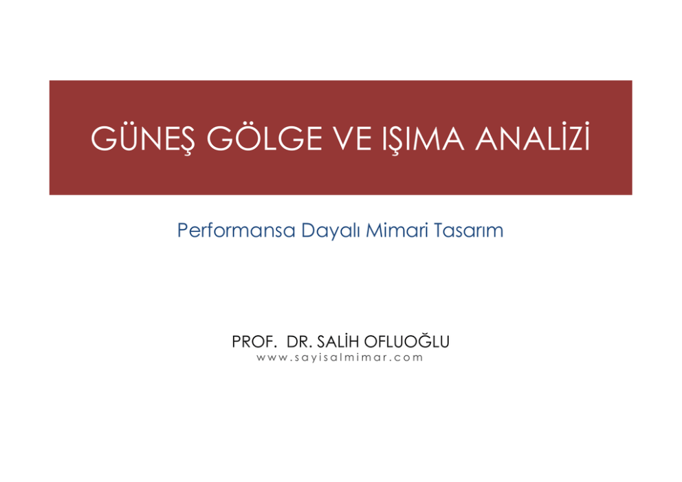 GÜNEŞ GÖLGE VE IŞIMA ANALİZİ Performansa Dayalı Mimari Tasarım PROF. DR. SALİH OFLUOĞLU www.sayisalmimar.com Sunum Özeti 1. Bölüm: Güneşin rotası, konumu ve bazı önemli tarihler 2. Bölüm: Binalar için solar stratejiler 3. Bölüm: Güneş ışınımı ile Fotovoltaik yollu enerji üretimi PERFORMATIF TASARIM - PROF. DR. SALIH OFLUOĞLU -02- 1. Bölüm 1. Bölüm: Güneşin rotası, konumu ve bazı önemli tarihler 2. Bölüm: Binalar için solar stratejiler 3. Bölüm: Güneş ışınımı ile Fotovoltaik yollu enerji üretimi PERFORMATIF TASARIM - PROF. DR. SALIH OFLUOĞLU -03- Yüksek performanslı bina için solar stratejiler • Işık kaynağı olarak güneş: • Doğal ışık kullanımı • Işığa erişim ve gölge etkisi • Güneşin ışınım (radyasyon) etkisi: • Isı kazanımı ve ısıdan korunma • PV ile enerji üretimi PERFORMATIF TASARIM - PROF. DR. SALIH OFLUOĞLU -04- Güneş ışığına erişim hakkı • Işık hakkı ve güneş kabuğu • Işık hakkı ve güneş erişimi yoğun şehir dokusunda önemlidir. Güneş kabuğu, bina çevresinde yapının çevreye gölge bırakmayacağı hayali sınırlar tanımıdır. • Güneşe erişim hakkı ile ilgili türkiye’de yasal bir düzenşeme yoktur. Bazı ülkelerde bu hak korunmuştur (örnek İngiltere, ancient lights/right to light: Prescription Act 1832). DESIGN TOGETHER YARIŞMASIPERFORMATIF ÖN EĞİTİM PROGRAMI TASARIM - -PROF. PROF.DR. DR.SALIH SALIHOFLUOĞLU OFLUOĞLU-05-5- Güneş rotası ve önemli tarihler • Güneş rotası • Önemli zamanlar: Gün dönümleri (Solstice) (Gölge oluşturma ve ışık miktarında en ekstrem zamanlar) Yaz / Kış gün dönümü Ekinoks zamanları (Güneş rotasında ortalama zamanlar) Arsanın enlemi İlkbahar / Sonbahar Ekinoksu 21 Aralık Kış Gündönümü 21 Haziran Yaz Gündönümü Yaz Gün Dönümü 21 Haziran Sonbahar Ekinoksu 21 Eylül Kış Gün Dönümü 21 Aralık İlkbahar Ekinoksu 21 Mart DESIGN TOGETHER YARIŞMASIPERFORMATIF ÖN EĞİTİM PROGRAMI TASARIM - -PROF. PROF.DR. DR.SALIH SALIHOFLUOĞLU OFLUOĞLU-06-6- Güneşin konumu • Güneş konumunu altitude ve azimuth olarak bilmek: • İrtifa (altitude) güneşi yer düzlemiyle yaptığı düşey açıdır (0<x<90) • Azimut güneş ve gerçek kuzey arasındaki açıdır (180<x<180 kuzeyden saat yönünde pozitiftir) PERFORMATIF TASARIM - PROF. DR. SALIH OFLUOĞLU -07- Mevsimsel ve günlük güneş etkisi • Mevsimsel etkiler: • Kış ayları: Pasif olarak binayı ısıtmak için güneşin etkisini arttırmak Yaz ayları: Pasif olarak binayı soğutmak için güneşin etkisini azaltmak Günlük etkiler: Sabah: Alçakta olan güneşin ısısını kazanma ve kamaşmayı önleme Öğle: Gün ortası yüksek güneş ısısından oluşacak aşırı ısınma ve soğutma yükünü azaltmak, farklı yerler ısıyı kazanma ve enerji üretme Öğleden sonra: Aşırı ısınma ve kamaşmadan kaçınma DESIGN TOGETHER YARIŞMASIPERFORMATIF ÖN EĞİTİM PROGRAMI TASARIM - -PROF. PROF.DR. DR.SALIH SALIHOFLUOĞLU OFLUOĞLU-08-8- 2. Bölüm 1. Bölüm: Güneşin rotası, konumu ve bazı önemli tarihler 2. Bölüm: Binalar için solar stratejiler 3. Bölüm: Güneş ışınımı ile Fotovoltaik yollu enerji üretimi PERFORMATIF TASARIM - PROF. DR. SALIH OFLUOĞLU -09- Binanın yönü Görsel ve ısısal konfor için binanın uzun yüzeyinin batı-doğu yönünde olması istenir. Bu yönlenme tutarlı bir şekilde günışığı alınımı ve uzun yön boyunca da kamaşmayı kontrol etme imkanı verir. • Güney ve Kuzey cephelerine gelen solar ışınım Doğu ve Batı cephelerine gelen solar ışınım • Binanın farklı yüzlerinde gelen yıllık güneş ışınımı- Batı-doğu yüzleri güneş gün boyunca hareketli olduğu için çok değişken, kuzey ve güneyde daha tutarlıdır. Solar yönlenme açısından iyilik sırası : 2 / 3 / 1 DESIGN TOGETHER YARIŞMASIPERFORMATIF ÖN EĞİTİM PROGRAMI TASARIM - -PROF. PROF.DR. DR.SALIH SALIHOFLUOĞLU OFLUOĞLU-010-10- Bina rengi Beyaz çatı koyu renkli çatılara göre %50; Beyaz duvar renkli çatılara göre %35 daha az ısı kazanımına yol açar. DESIGN TOGETHER YARIŞMASIPERFORMATIF ÖN EĞİTİM PROGRAMI TASARIM - -PROF. PROF.DR. DR.SALIH SALIHOFLUOĞLU OFLUOĞLU-011-11- Bina biçimi ve kütlesi • Yapının şekli ve boyutu ısısal konfor sağlanması ve günışığı elde edilmesinde önemlidir. • Büyük ve geniş yapılarda ise boşluklar sağlayarak gün ışığı arttırılır. • Daha iyi ışık alımı için ince uzun bina tasarımı tercih edilir. İnce ve özellikle yüksek binalarda ışınıma bağlı ısınma daha az olur; çünkü çatı alanları daha azdır. DESIGN TOGETHER YARIŞMASIPERFORMATIF ÖN EĞİTİM PROGRAMI TASARIM - -PROF. PROF.DR. DR.SALIH SALIHOFLUOĞLU OFLUOĞLU-012-12- Pencere boyutları ve yerleşimi • Güneye bakan yüzeylerde geniş pencereler ve ısısal kütleli (malzemeler) ile güneş ısı kazanımı sağlanır. • Gün doğuşu ve batımında sıcaklığı dengelemek için doğuda daha fazla cam, batıda ise küçük camlar ve gece ısısını yaymak için ısı tutan malzemeler seçilir. • Gelişmiş camlar günışığını ısısından ayırabilir. Az güneş gören cephelerde dahi, yüksek yalıtımlı camlarlar az ısı kaybıyla günışığı elde edebilirler. DESIGN TOGETHER YARIŞMASIPERFORMATIF ÖN EĞİTİM PROGRAMI TASARIM - -PROF. PROF.DR. DR.SALIH SALIHOFLUOĞLU OFLUOĞLU-013-13- Güneş kırıcılar ve ışık rafları • Bu elemanlar, gün ışığı seviyesini ve güneş ısısı kazanımını kontrol ederler. Yazın (güneşin açışı dik) güneşi engeller ve kışın (güneşin açışı eğik) izin verir. • Kırıcılar pencereden gelen doğrudan güneş ısısı ve kamaşmasını önlemek için kullanılır. İç Kırıcılar güneş ısı geçişini önleyemezse de kamaşmayı önler ve ışık dağılımını dengeli yapar. • En sık kar
