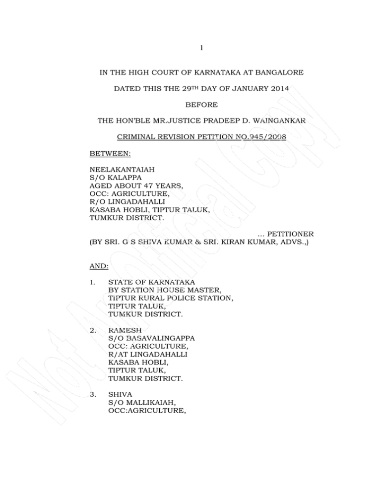1 IN THE HIGH COURT OF KARNATAKA AT BANGALORE DATED THIS THE 29TH DAY OF JANUARY 2014 BEFORE THE HON’BLE MR.JUSTICE PRADEEP D. WAINGANKAR CRIMINAL REVISION PETITION NO.945/2008 BETWEEN: NEELAKANTAIAH S/O KALAPPA AGED ABOUT 47 YEARS, OCC: AGRICULTURE, R/O LINGADAHALLI KASABA HOBLI, TIPTUR TALUK, TUMKUR DISTRICT. ... PETITIONER (BY SRI. G S SHIVA KUMAR & SRI. KIRAN KUMAR, ADVS.,) AND: 1. STATE OF KARNATAKA BY STATION HOUSE MASTER, TIPTUR RURAL POLICE STATION, TIPTUR TALUK, TUMKUR DISTRICT. 2. RAMESH S/O BASAVALINGAPPA OCC: AGRICULTURE, R/AT LINGADAHALLI KASABA HOBLI, TIPTUR TALUK, TUMKUR DISTRICT. 3. SHIVA S/O MALLIKAIAH, OCC:AGRICULTURE, 2 R/AT LINGADAHALLI KASABA HOBLI, TIPTUR TALUK, TUMKUR DISTRICT. 4. MANJUNATHA S/O MALLIKARJUNA, OCC:AGRICULTURE, R/AT LINGADAHALLI KASABA HOBLI, TIPTUR TALUK, TUMKUR DISTRICT. 5. BASAVALINGAPPA S/O BORAPPA, OCC:AGRICULTURE, R/AT LINGADAHALLI KASABA HOBLI, TIPTUR TALUK, TUMKUR DISTRICT. 6. MAHALINGAPPA S/O KALAPPA OCC:AGRICULTURE, R/AT LINGADAHALLI KASABA HOBLI, TIPTUR TALUK, TUMKUR DISTRICT. 7. MALLIKARJUNA S/O SIDDAPPA, OCC:AGRICULTURE, R/AT LINGADAHALLI KASABA HOBLI, TIPTUR TALUK, TUMKUR DISTRICT. 8. CHANNABASAMMA W/O MAHALINGAPPA OCC:AGRICULTURE, R/AT LINGADAHALLI KASABA HOBLI, TIPTUR TALUK, 3 TUMKUR DISTRICT. 9. BHAGYAMMA W/O SHIVAPPA OCC:AGRICULTURE, R/AT LINGADAHALLI KASABA HOBLI, TIPTUR TALUK, TUMKUR DISTRICT. 10. MALLAMMA W/O BASAVALINGAPPA, OCC:AGRICULTURE, R/AT LINGADAHALLI KASABA HOBLI, TIPTUR TALUK, TUMKUR DISTRICT. ... RESPONDENTS (BY SMT. B.P. ROOPA, HCGP FOR R1; R4 ABATED; R2, R3, R5 TO R10 SERVED AND UNREPRESENTED) THIS CRIMINAL REVISION PETITION IS FILED U/S.397 R/W 401 CR.P.C PRAYING TO SET ASIDE THE ORDER DT.9.1.08 PASSED IN S.C.NO.205/06 BY THE FTCI, TUMKUR. THIS CRIMINAL REVISION PETITION COMING ON FOR ORDERS THIS DAY, THE COURT MADE THE FOLLOWING:- ORDER Learned counsel for the petitioner has filed a memo seeking to dismiss the petition as withdrawn. 2. Memo is taken on record. 4 3. In view of the memo field by the learned counsel for the petitioner, the petition is dismissed as withdrawn. In view of the disposal of the revision petition, Misc.Crl.No.2435/2010 for permission dismissed. Sd/JUDGE PMR is also