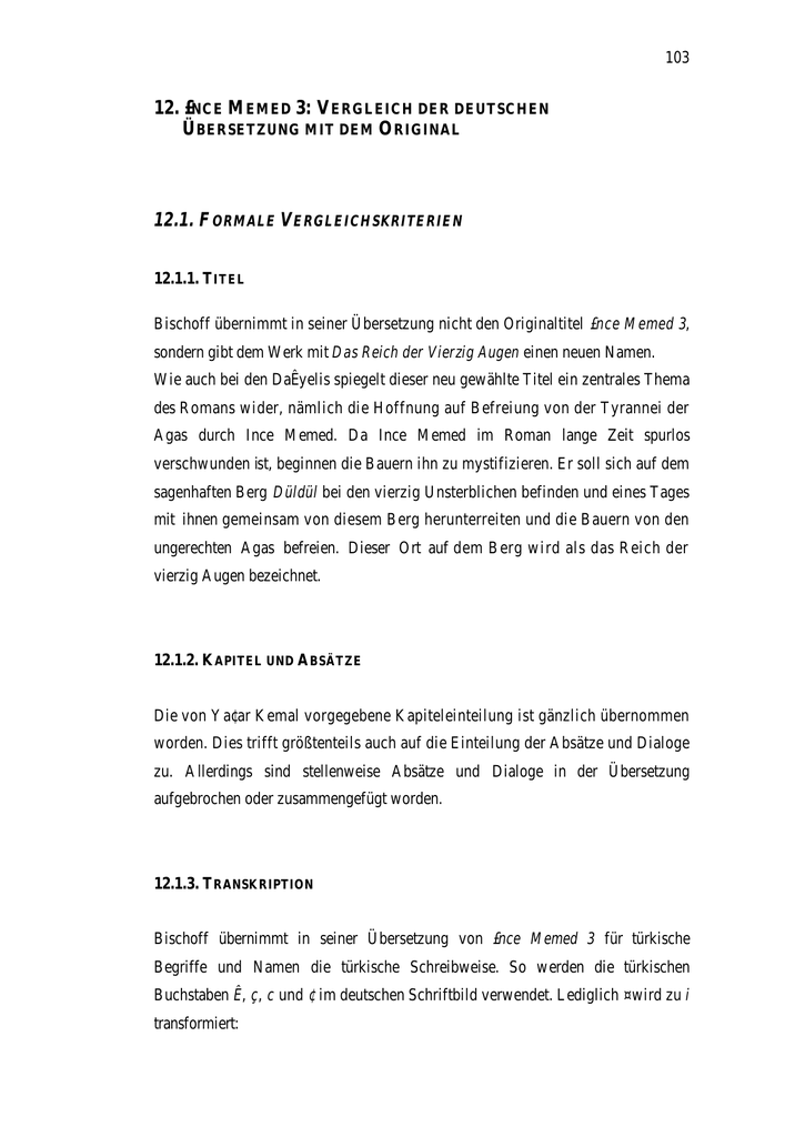 103 12. £NCE MEMED 3: VERGLEICH DER DEUTSCHEN ÜBERSETZUNG MIT DEM ORIGINAL 12.1. FORMALE VERGLEICHSKRITERIEN 12.1.1. TITEL Bischoff übernimmt in seiner Übersetzung nicht den Originaltitel £nce Memed 3, sondern gibt dem Werk mit Das Reich der Vierzig Augen einen neuen Namen. Wie auch bei den DaÊyelis spiegelt dieser neu gewählte Titel ein zentrales Thema des Romans wider, nämlich die Hoffnung auf Befreiung von der Tyrannei der Agas durch Ince Memed. Da Ince Memed im Roman lange Zeit spurlos verschwunden ist, beginnen die Bauern ihn zu mystifizieren. Er soll sich auf dem sagenhaften Berg Düldül bei den vierzig Unsterblichen befinden und eines Tages mit ihnen gemeinsam von diesem Berg herunterreiten und die Bauern von den ungerechten Agas befreien. Dieser Ort auf dem Berg wird als das Reich der vierzig Augen bezeichnet. 12.1.2. KAPITEL UND ABSÄTZE Die von Ya¢ar Kemal vorgegebene Kapiteleinteilung ist gänzlich übernommen worden. Dies trifft größtenteils auch auf die Einteilung der Absätze und Dialoge zu. Allerdings sind stellenweise Absätze und Dialoge in der Übersetzung aufgebrochen oder zusammengefügt worden. 12.1.3. TRANSKRIPTION Bischoff übernimmt in seiner Übersetzung von £nce Memed 3 für türkische Begriffe und Namen die türkische Schreibweise. So werden die türkischen Buchstaben Ê, ç, c und ¢ im deutschen Schriftbild verwendet. Lediglich ¤ wird zu i transformiert: 104 £nce Memed (K3 157 Z 35)1 YobazoÊlu (K3 220 Z 2-3) Mara¢ (K3 342 Z 9) †içeklideresi (K3 194 Z 6-7) †ukorova (K3 8 Z 23) YüreÊir (K3 10 Z 2) Y¤lankale (K3 Z 31) Akçasaz (K3 240 Z 32) Homanl¤ (K3 240 Z 11) Ceyhan (K3 239 Z 22) K¤z¤lba¢ (K3 600 Z 7) » » » » » » » » » » » Ince Memed (CB 160 Z 16)2 YobazoÊlu (CB 224 Z 14) Mara¢ (CB 350 Z 3) †içeklidere (CB 198 Z 1) †ukorova (CB 6 Z 18) YüreÊir (CB 8 Z 1) Yilankale (CB 14 Z 5) Akçasaz (CB 244 Z 16) Homanli (CB 244 Z 28) Ceyhan (CB 244 Z 15) Kizilba¢ (CB 624 Z 9) Allerdings verwendet Bischoff diese Methode bei den Buchstaben ¢, c und Ê nicht immer konsequent, da sich einige wenige Beispiele finden, in denen er sie gemäß der Aussprache ins Deutsche niederschreibt: in¢allah (K3 206 Z 30) cilpirti (K3 239 Z 9) ma¢allah (K3 471 Z 28) Padi¢ah (K3 306 Z 12) cin (K3 251 Z 30) Ömer Naci Pa¢a (K3 173 Z 10) K¤sac¤k Hac¤ (K3 249 Z 10) Hac¤ Musa (K3 121 Z 3) Ferhat Hoca (K3 220 Z 2) Hac¤bekta¢¤ Veli (K3 289 Z 22) Mahmut AÊa (K3 122 Z 26) ¢erbet (K3 383 Z 35) » » » » » » » » » » » » inschallah (CB 210 Z 16) Dschilpirti (CB 244 Z 2-3) Maschallah (CB 488 Z 3) Padischah (CB 312 Z 23) Dschinn (CB 256 Z 35) Ömer Naci Pascha (CB 176 Z 21) Hadschi der Kurze (CB 254 Z 12-13) Hadschi Musa (CB 121 Z 8-9) Ferhat Hodscha (CB 224 Z 14) Hadschi Bektaschi Veli (CB 295 Z 5) Mahmut Aga (CB 122 Z 30) Scherbett (CB 395 Z 3) Während die ersten drei Beispiele eine wirkliche Inkonsequenz hinsichtlich der Übertragungsmethode darstellen, sind die restlichen nach der lexikalisierten Schreibweise des Duden-Fremdwörterbuches umgeformt worden und stellen somit eine Anpassung an die deutschen Rechtschreibnormen dar. Wie auch bei der DaÊyeli-Übersetzung von £nce Memed 2 wird die Aussprache dieser im Deutschen nicht existierenden Buchstaben an keiner Stelle erklärt, so daß es für den deutschsprachigen Leser nicht möglich ist, die mit diesen Buchstaben geschriebenen Eigennamen und Begriffe korrekt auszusprechen. Um dieses Defizit auszugleichen, wäre es hilfreich, die Aussprache dieser Buchstaben in Form eines Glossars zu erklären. Man stellt fest, daß Bischoff dieselbe Transkriptionsmethode wie die DaÊyelis in ihrer Überarbeitung der Brandsschen Übersetzung von £nce Memed 1 und in ihrer 1 2 K3 steht für folgendes Werk: Kemal, Ya¢ar. £nce Memed 3. £stanbul: Toros Yay¤nlar¤ 7 1993, 691 S.. CB wird als Kürzel für folgende deutsche Übersetzung von £nce Memed 3 verwendet: Kemal, Ya¢ar. Das Reich der Vierzig Augen. übers. von Cornelius Bischoff. Zürich: Unionsverlag 5 1997, 718 S.. 105 Übersetzung von £nce Memed 2 verwendet hat. Der Vorteil dieser einheitlichen Transkriptionsmethode der im Unionsverlag erschienen Bände von £nce Memed ist darin zu sehen, daß sich der Leser nicht von Band zu Band an ein anderes Schriftbild gewöhnen muß. 12.1.4. EIGENNAMEN Ya¢ar Kemal gibt den Personen in £nce Memed 3 - wie auch denen in £nce Memed 1 und 2 - häufig Beinamen, die gewisse Eigenschaften und Charakteristika dieser Personen darstellen. Bischoff übersetzt diese als appositionelle Beifügung ins Deutsche, so daß sie auch dem deutschen Leser verständlich sind. Er praktiziert somit dieselbe Methode, die die DaÊyelis in der Übersetzung von £nce Memed 2 und in ihrer Überarbeitung von der Brandschen £nce Memed 1-Übersetzung angewendet haben. Dies erscheint insofern vorteilhaft, als daß sich der Leser, der vermutlich bereits vorher die ersten beiden Bände gelesen hat, nicht an neue Namen bereits bekannter Protagonisten gewöhnen muß. Als Beispiele für die Übersetzung von Eigennamen sollen folgende Textstellen dienen: Kerti¢ Ali Onba¢¤ (K 117 Z 3) As¤m †avu¢ (K 118 Z 1) Kara £brahim (K3 119 Z 36-37) Köstebek Bekir (K3 121 Z 14) Taz¤ Tahsin (K3 326 Z 6) Sar¤ †avu¢ (K3 123 Z 27) Kürt Zaro (K3 249 Z 10) Deli Kenan (K3 249 Z 11) Koca Osman (K3 175 Z 9) Sar¤ Ümmet (K3 157 Z 9) » » » » » » » » » » Gefreiter Ali die Echse (CB 117 Z 4) Unteroffizier Asim (CB 118 Z 3) Ibrahim der Schwarze (CB 120 Z 4) Bekir der Maulwurf (CB 121 Z 20) Tahsin der Windhund (CB 333 Z 14) der Blonder Sergeant (CB 123 Z 33) Zaro der Kurde (CB 254 Z 12) Kenan der Verrückte (CB 254 Z 13) Osman der Mächtige (CB 178 Z 15) Ümmet der Blonde (CB 159 Z 31) Die einzige Abweichung von dieser Methode stellt folgendes Beispiel dar: £nce Memed (K3 157 Z 35) » Ince Memed (CB 160 Z 16) Diese Abweichung läßt sich daher erklären, daß in den ersten beiden Bänden der Name £nce Memed immer als Ince Memed wi