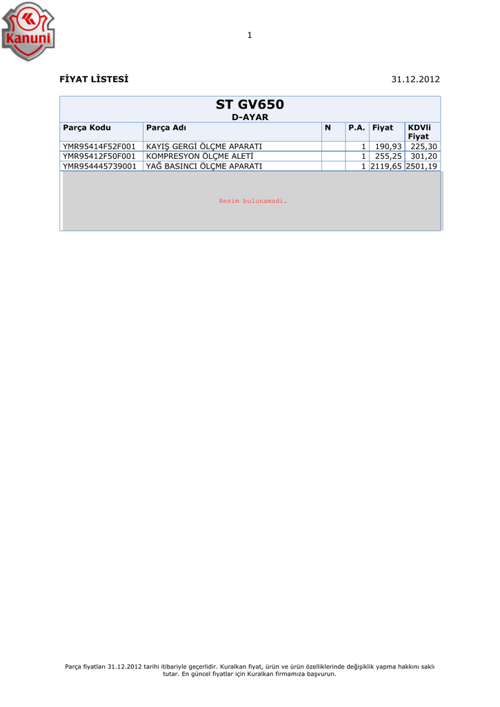 1 FİYAT LİSTESİ 31.12.2012 ST GV650 D-AYAR Parça Kodu Parça Adı N YMR95414F52F001 YMR95412F50F001 YMR954445739001 KAYIŞ GERGİ ÖLÇME APARATI KOMPRESYON ÖLÇME ALETİ YAĞ BASINCI ÖLÇME APARATI P.A. Fiyat KDVli Fiyat 1 190,93 225,30 1 255,25 301,20 1 2119,65 2501,19 Resim bulunamadi. Parça fiyatları 31.12.2012 tarihi itibariyle geçerlidir. Kuralkan fiyat, ürün ve ürün özelliklerinde değişiklik yapma hakkını saklı tutar. En güncel fiyatlar için Kuralkan firmamıza başvurun. 2 ST GV650 D-MONTAJ APARATI Parça Kodu Parça Adı N YMR955455754001 YMR955194448001 YMR955194449001 YMR95515S88S001 KRANK MİLİ MONTAJ APARATI MOTOR MONTAJ APARATI (36 MM) MOTOR MONTAJ APARATI (30 MM) SÜBAP YAYI SIKIŞTIRMA APARATI EKİ P.A. Fiyat 1 1 1 1 50,45 14,18 11,08 15,11 KDVli Fiyat 59,53 16,73 13,07 17,83 Resim bulunamadi. Parça fiyatları 31.12.2012 tarihi itibariyle geçerlidir. Kuralkan fiyat, ürün ve ürün özelliklerinde değişiklik yapma hakkını saklı tutar. En güncel fiyatlar için Kuralkan firmamıza başvurun. 3 ST GV650 D-SÖKME Parça Kodu Parça Adı N YMR950441734001 YMR950442735001 YMR950443736002 YMR95045897S001 YMR95045892S001 YMR95045891S001 YMR950458758001 YMR95045890S001 YMR95014S87S001 ROTOR MİLİ SÖKME APARATI ROTOR SABİTLEME ANAHTARI ROTOR SÖKME APARATI RULMAN SÖKME APARATI TEKERLEK RULMAN SÖKME APARATI 20-35mm RULMAN SÖKME APARATI 17mm RULMAN SÖKME APARATI RULMAN SÖKME APARATI 10mm YAĞ CONTASI SÖKME APARATI P.A. Fiyat 1 1 1 1 1 1 1 1 1 207,35 331,25 38,50 16,08 47,09 45,56 31,63 42,63 17,33 KDVli Fiyat 244,67 390,88 45,43 18,97 55,57 53,76 37,32 50,30 20,45 Resim bulunamadi. Parça fiyatları 31.12.2012 tarihi itibariyle geçerlidir. Kuralkan fiyat, ürün ve ürün özelliklerinde değişiklik yapma hakkını saklı tutar. En güncel fiyatlar için Kuralkan firmamıza başvurun. 4 ST GV650 D-TAKMA Parça Kodu Parça Adı N YMR951454753001 YMR95145996S001 YMR95145995S001 YMR95145993S001 YMR95145994S001 KRANK MİLİ TAKMA APARATI RULMAN TAKMA APARATI ÇAP RULMAN TAKMA APARATI ÇAP RULMAN TAKMA APARATI ÇAP RULMAN TAKMA APARATI ÇAP 50mm 46.5mm 31.5mm 32mm P.A. Fiyat 1 1 1 1 1 35,25 17,80 18,80 11,55 10,66 KDVli Fiyat 41,60 21,00 22,18 13,63 12,58 Resim bulunamadi. Parça fiyatları 31.12.2012 tarihi itibariyle geçerlidir. Kuralkan fiyat, ürün ve ürün özelliklerinde değişiklik yapma hakkını saklı tutar. En güncel fiyatlar için Kuralkan firmamıza başvurun. 5 ST GV650 M-ELEKTRİK AKSAMI Parça Kodu Parça Adı YME001A05A05019 YME001T05646006 YME001T05T59004 YME001L61M62002 YME001A06A06402 YME001A06A06302 YME001A17A17001 YME001A17A17901 YME00159S39U002 YME00157D26G001 YME001A01A01064 YME001A0127G001 YME001A04A04030 YME001A16A16006 YME001A22A22053 YME001A09A09039 YME00148B998001 YME001A13A13012 YME00152B17B001 YME001A19A19006 YME001A1431B001 YME001A14A14001 YME00164B30B301 YME00164B30B001 YME001A21A21003 YME001A21744001 YME001A18A18004 YME00158S29U001 AKÜ AKÜ KABLOSU EKSİ ( - ) AKÜ KABLOSU AKÜ BANT ATEŞLEME BOBİNİ ÖN ATEŞLEME BOBİNİ ARKA BUJİ BAŞLIĞI BUJİ BAŞLIĞI ORTA DIAGNOSTIC CİHAZI KABLO SENSÖR KABLO TAKIMI KABLO TAKIMI KÜÇÜK KONJEKTÖR KONJEKTÖR BAĞLANTI SACI KONTAK KORNA MARŞ MOTOR KABLOSU MARŞ OTOMATİĞİ MARŞ OTOMATİĞİ TERMİNAL SOMUNU M6 MOTOR KONTROL ÜNİTESİ ROLE 12V 30A ROLE ROLE BAĞLANTI SACI ARKA ROLE BAĞLANTI SACI SİGORTA KUTUSU SİGORTA KUTUSU (30A) SİNYAL OTOMATİĞİ STOP EK KABLOSU 6 SOKET N P.A. Fiyat 31 3 32 30 7 8 13 12 45 37 33 5 25 38 43 4 1 2 15 16 17 23 22 19 20 21 36 1 124,24 1 22,16 1 11,73 1 4,43 1 155,58 1 155,58 1 1,20 1 16,05 1 1652,50 1 138,33 1 580,25 1 95,00 1 164,14 1 4,85 1 166,64 1 28,65 1 11,73 1 41,03 1 0,34 1 2477,63 1 13,36 1 13,48 1 7,69 1 3,44 1 6,83 1 6,49 1 21,06 1 11,08 KDVli Fiyat 146,60 26,15 13,84 5,23 183,58 183,58 1,42 18,94 1949,95 163,23 684,70 112,10 193,69 5,72 196,64 33,81 13,84 48,42 0,40 2923,60 15,76 15,91 9,07 4,06 8,06 7,66 24,85 13,07 Parça fiyatları 31.12.2012 tarihi itibariyle geçerlidir. Kuralkan fiyat, ürün ve ürün özelliklerinde değişiklik yapma hakkını saklı tutar. En güncel fiyatlar için Kuralkan firmamıza başvurun. 6 Parça fiyatları 31.12.2012 tarihi itibariyle geçerlidir. Kuralkan fiyat, ürün ve ürün özelliklerinde değişiklik yapma hakkını saklı tutar. En güncel fiyatlar için Kuralkan firmamıza başvurun. 7 ST GV650 M-ALTERNATÖR Parça Kodu Parça Adı YMM002A24A24024 YMM002A26A26021 YMM002457757004 YMM002A25A25017 ALTERNATÖR ROTOR ROTOR KAMASI STATÖR N P.A. Fiyat 1 3 7 2 1 1 1 1 483,78 188,91 1,69 256,46 KDVli Fiyat 570,86 222,91 1,99 302,62 Parça fiyatları 31.12.2012 tarihi itibariyle geçerlidir. Kuralkan fiyat, ürün ve ürün özelliklerinde değişiklik yapma hakkını saklı tutar. En güncel fiyatlar için Kuralkan firmamıza başvurun. 8 ST GV650 M-DEBRİYAJ AKSAMI Parça Kodu Parça Adı YMM003A30A30001 YMM003A29K52001 YMM003A29K51003 YMM003A35A35001 YMM003Z23W74004 YMM00381332A001 YMM00381433A001 YMM003A33A33004 YMM00381534A001 YMM00381637A002 YMM003A31A31002 YMM003A32A32001 YMM003230238003 YMM003A34A34002 YMM00381738A002 YMM00381839A001 YMM003A44A44902 YMM003A44A44002 YMM003A43A43003 YMM003L23M24005 YMM003T16T70002 DEBRİYAJ ARA SACI DEBRİYAJ BALATASI KALIN DEBRİYAJ BALATASI INCE DEBRİYAJ BASKI FLANŞI DEBRİYAJ BASKI PULU DEBRİYAJ BASKI RULMAN KARŞILIĞI DEBRİYAJ BASKI YAY TAPASI DEBRİYAJ BASKI YAYI DEBRİYAJ DİP PULU DEBRİYAJ DİP SEKMANI DEBRİYAJ DİŞLİ VE TASI DEBRİYAJ GÖBEĞİ DEBRİYAJ GÖBEK BURCU DEBRİYAJ GÖBEK MİLİ DEBRİYAJ GÖBEK PULU DEBRİYAJ GÖBEK SOMUNU DEBRİYAJ İTME ÇUBUĞU ORTA DEBRİYAJ İTME ÇUBUĞU DEBRİYAJ TASI PULU TRİGER KAYIŞ KASNAĞI TRİGER KAYIŞI N P.A. Fiyat 10 9 25 16 15 11 18 17 26 27 1 3 28 12 2 5 7 6 4 30 29 1 1 1 1 1 1 1 1 1 1 1 1 1 1 1 1 1 1 1 1 1 11,59 43,75 76,64 36,45 0,73 16,33 0,66 2,56 9,09 16,26 335,53 57,96 18,29 1,00 2,50 7,58 31,86 4,90 13,36 145,80 941,64 KDVli Fiyat 13,68 51,63 90,44 43,01 0,86 19,2