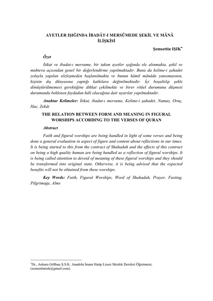 AYETLER IġIĞINDA ĠBADÂT-I MERSÛMEDE ġEKĠL VE MÂN ĠLĠġKĠSĠ ġemsettin IġIK Özet Ġtikat ve ibadat-ı mersume, bir takım ayetler ıĢığında ele alınmakta, Ģekil ve muhteva açısından genel bir değerlendirme yapılmaktadır. Buna da kelime-i Ģahadet yoluyla yapılan sözleĢmeden baĢlanılmakta ve bunun kâmil mânâda yansımasının, kiĢinin dıĢ dünyasına yaptığı katkılara değinilmektedir. Ġçi boĢaltılıp Ģekle dönüĢtürülmemesi gerektiğine dikkat çekilmekte ve birer ritüel durumuna düĢmesi durumunda beklenen faydadan hâli olacağına dair uyarılar yapılmaktadır. Anahtar Kelimeler: Ġtikat, ibadat-ı mersume, Kelime-i Ģahadet, Namaz, Oruç, Hac, Zekât THE RELATION BETWEEN FORM AND MEANING IN FIGURAL WORSHIPS ACCORDING TO THE VERSES OF QURAN Abstract Faith and figural worships are being handled in light of some verses and being done a general evaluation in aspect of figure and content about reflections in our times. It is being started to this from the contract of Shahadah and the effects of this contract on being a high quality human are being handled as a reflection of figural worships. It is being called attention to devoid of meaning of these figural worships and they should be transformed into original state. Otherwise, it is being advised that the expected benefits will not be obtained from these worships. Key Words: Faith, Figural Worships, Word of Shahadah, Prayer, Fasting, Pilgrimage, Alms Dr., Ankara GölbaĢı ġ.S.K. Anadolu Ġmam Hatip Lisesi Meslek Dersleri Öğretmeni, ([email protected]). Dr. ġemsettin IĢık GiriĢ Ġnsan, yapısı itibariyle maddî ve manevî ihtiyaçlarını karĢılamaya muhtaç bir varlık olarak yaratılmıĢtır. Bu yönü onu, her iki alanda da tatmin olma yollarını aramaya sevk etmiĢtir. Bu bağlamda Yüce Allah, gaybî konuların baĢında gelen zâtı ve kudreti konusunda kulunun her hangi bir yanılgıya düĢmemesi için kâinat kitabında yer alan kevnî ayetleri derin bir tefekkür eĢliğinde okumaya1 ve yapacağı değerlendirilmeyi akıl, bilgi ve muhakeme üçgeni içinde yapmaya davet etmektedir.2 Hatta bu hususta kiĢinin sağlıklı bir sonuca ulaĢabilmesi için Ģekillenmesinde rol oynayan kültürel mirası da gözden geçirmesi gerektiğini beyan etmektedir.3 Bu sayede, sahip olunan inanç ve tezahürü mahiyetindeki ibadetlerin niye ve niçin yapılmakta olduğu yeniden değerlendirilmiĢ olmakta ve anlamı buharlaĢmıĢ semboller hâline dönüĢmekten korunmasına dair dikkatler çekilmektedir. Bundan dolayı yaygın Ģekliyle Ġslam’ın Ģartları olarak bilinen ve her birisi ayrı bir çalıĢma konusu oluĢturabilecek kadar bir geniĢliğe sahip olan Kelime-i Ģahadet ve ibadat-ı mersumeyi, bir bütünlük teĢkil etmesi ve zihinlerde daha rahat bir Ģekilde arzulanan mânânın ma’kes bulması için birlikte ele alma yoluna gidilmiĢtir. ġurası unutulmamalıdır ki iman, ne sadece bir duygu veya bir faaliyet ve ne de itirazsız bir Ģekilde her Ģeyi körü körüne kabul etme ameliyesidir. O, yalın anlamda bir bilgi olmadığı gibi aynı zamanda Yaratıcıyı kavrama ve Ondan gereği veçhile ittikaya yönelik bir muhakeme ve gönül iĢidir. Bunun hilafına olarak tetkik ve bilgiden uzak olan yöneliĢler, kabuk ve Ģekilde meydana gelen değiĢikliğin ötesine çok fazla nüfuz edemeyecektir. Bundan dolayı Kur’an-ı Kerim, aklı muhatap alıp ilim ve düĢünceye önem vermektedir. Getirdiği esasları da ilme ve aklî ilkelere havale etmektedir. Dolayısıyla onu, aklın ve ilmin prensiplerine göre anlamak gerekmektedir.4 Buna rağmen zaman zaman görülen manzara, aklı ve muhakemeyi bırakıp körü körüne atalar kültüne sarılma Ģeklinde tezahür etmiĢtir.5 Bu da imanın ve ibadetin yozlaĢmasına, batıl ve hurafelerin nüfuz etmesine zemin hazırlamıĢtır. Oysaki iman, çeĢitli zorluklara karĢı metanet göstermeyi 6 ve takva merkezli bir davranıĢ olarak dıĢ âleme yansımayı gerektirmektedir.7 Bu durumda iman, kökü kalpte; uzantıları ile bütün vücudu saran bir ağaç gibi tezahür etmektedir. Kur’an-ı Kerim de 1 -Bkz. Bakara: 2/164; A. Imran: 3/190-192; Rad: 13/3; ĞaĢiye: 88/17-20. -Bkz. Tâhâ: 20/128; Rad: 13/4; Ankebut: 29/43; A’raf: 7/179. 3 -Bkz. Bakara: 2/170; Lokman: 31/21. 4 -Atay, Hüseyin, Kur’an’a Göre AraĢtırmalar I-III, Atay Yay., Ank., 1997, c. 1, s. 12. 5 -Bkz. Bakara: 2/170; Lokman: 31/21. 6 -Bkz. Ankebut: 29/2-3. 7 -Bkz. Bakara: 2/82; Yûnus: 10/4; Hud: 11/23; Kehf: 18/107; Asr: 103/3. 2 GümüĢhane Üniversitesi Ġlahiyat Fakültesi Dergisi 2015/4, c. 4, sayı: 7 2 Ayetler IĢığında Ġbadât-ı Mersûmede ġekil ve Mânâ ĠliĢkisi bunu, “güzel bir söz kökü yerde sabit, dalları gökte olan güzel bir ağaca benzer”8 demek suretiyle Allah inancını tasvir etmektedir.9 Bu durumun muhalifi ise amelsiz bir inancın, köksüz bir ağaca benzemesidir. Bu bakımdan Ģüphe ve isyandan salim olmayan bir imanın, itibarı da ibadete yansıması da pek makbul sayılmayacaktır. Ġmamı Gazali’nin Ġhyâu Ulûmiddîn’den mülhem olarak, dinî hayat hakkında Ģöylece bir hülasada bulunma10 mümkün görünmektedir: a- Taklit basamağı b- Tahkik basamağı c- Tatbik (bilginin iman ile bütünleĢip amele dönüĢme) basamağı Bu sınıflandırmaya göre, yakın çevresinden gördüğünü itirazsız ve tahkiksiz bir Ģekilde yapmaya baĢlayan kiĢi, dinî hayatın taklit basamağında; derin bir araĢtırmaya giriĢen tahkik basamağında; imanından ve amelinden engin bir derecede zevk almaya baĢlayan tatbik basamağında yer almaktadır. Görülüyor ki, her ne kadar kalp ile tasdik ve dil ile ikrar, zahiren imanın rüknünün tamamlandığını gösteriyorsa da onun dıĢında koruyucu bir fanus durumunda olan amel, tahkikten uzaklaĢtığı zaman haricî sızıntılarla yüz yüze gelmiĢ olacaktır. Bu radde din ile kültürünün birbirine karıĢtırılması ve bundan