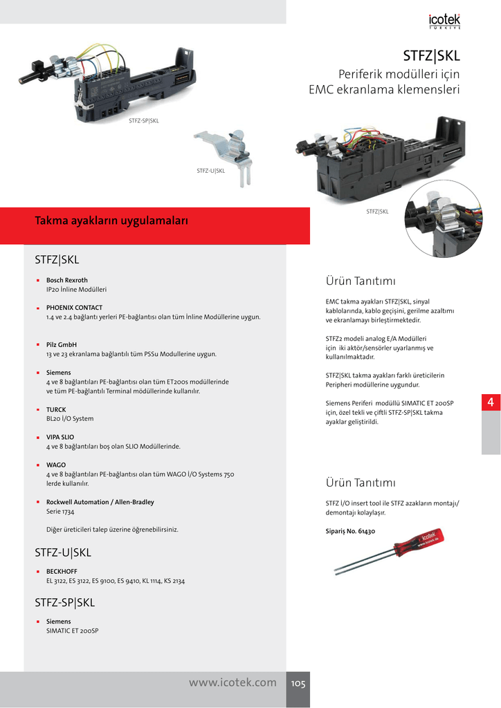 STFZ|SKL Periferik modülleri için EMC ekranlama klemensleri STFZ-SP|SKL STFZ-U|SKL STFZ|SKL Takma ayakların uygulamaları STFZ|SKL Ürün Tanıtımı Bosch Rexroth IP20 İnline Modülleri PHOENIX CONTACT 1.4 ve 2.4 bağlantı yerleri PE-bağlantısı olan tüm İnline Modüllerine uygun. EMC takma ayakları STFZ|SKL, sinyal kablolarında, kablo geçişini, gerilme azaltımı ve ekranlamayı birleştirmektedir. Pilz GmbH 13 ve 23 ekranlama bağlantılı tüm PSSu Modullerine uygun. STFZ2 modeli analog E/A Modülleri için iki aktör/sensörler uyarlanmış ve kullanılmaktadır. Siemens 4 ve 8 bağlantıları PE-bağlantısı olan tüm ET200s modüllerinde ve tüm PE-bağlantılı Terminal mödüllerinde kullanılır. STFZ|SKL takma ayakları farklı üreticilerin Peripheri modüllerine uygundur. TURCK BL20 İ/O System Siemens Periferi modüllü SIMATIC ET 200SP için, özel tekli ve çiftli STFZ-SP|SKL takma ayaklar geliştirildi. VIPA SLIO 4 ve 8 bağlantıları boş olan SLIO Modüllerinde. WAGO 4 ve 8 bağlantıları PE-bağlantısı olan tüm WAGO İ/O Systems 750 lerde kullanılır. Ürün Tanıtımı Rockwell Automation / Allen-Bradley Serie 1734 STFZ İ/O insert tool ile STFZ azakların montajı/ demontajı kolaylaşır. Diğer üreticileri talep üzerine öğrenebilirsiniz. Sipariş No. 61430 STFZ-U|SKL BECKHOFF EL 3122, ES 3122, ES 9100, ES 9410, KL 1114, KS 2134 STFZ-SP|SKL Siemens SIMATIC ET 200SP www.icotek.com 105 STFZ | STFZ2 Farklı Modüller için EMV-Takma ayaklar, tekli ve çiftli Pos. 2 Pos. 1 Tip Ekranlama çapı Pos. 1 Ekranlama çapı Pos. 2 Sipariş No. SB Ürün Tanıtımı STFZ|SKL tek ekranlamalı: Takma ayakları, sinyal kablolarında, kablo geçişini, gerilme azaltımı ve ekranlamayı birleştirmektedir. STFZ|SKL 1.5-3 1.5 - 3 mm - 37510.1 10 STFZ|SKL 3-6 3 - 6 mm - 37510.2 10 STFZ|SKL 6-8 6 - 8 mm - 37510.3 10 STFZ2|01 boş 1.5 - 3 mm 37505.01 10 STFZ2|02 boş 3 - 6 mm 37505.02 10 STFZ2|03 boş 6 - 8 mm 37505.03 10 STFZ2|10 1.5 - 3 mm boş 37505.10 10 STFZ2|11 1.5 - 3 mm 1.5 - 3 mm 37505.11 10 STFZ2|12 1.5 - 3 mm 3 - 6 mm 37505.12 10 STFZ2|13 1.5 - 3 mm 6 - 8 mm 37505.13 10 STFZ2|20 3 - 6 mm boş 37505.20 10 STFZ2|21 3 - 6 mm 1.5 - 3 mm 37505.21 10 STFZ2|22 3 - 6 mm 3 - 6 mm 37505.22 10 STFZ2|23 3 - 6 mm 6 - 8 mm 37505.23 10 STFZ2|30 6 - 8 mm boş 37505.30 10 STFZ2|31 6 - 8 mm 1.5 - 3 mm 37505.31 10 STFZ2|32 6 - 8 mm 3 - 6 mm 37505.32 10 STFZ2|33 6 - 8 mm 6 - 8 mm 37505.33 10 Farklı üreticilerin periferi modüllerine uygundur (sayfa 105). STFZ2 çift ekranlamalı: Kablo çapına göre kullanabileceğiniz EMC ekranlama klemensleri: SKL 1.5-3 | SKL 3-6 | SKL 6-8 Avantajlar Sinyal kabloların klemslerinde doğrudan ekranlama Periferi modüllerinde doğrudan Kablo girişi ve gerilmeyi azaltma Özellikler Malzeme SKL-Klemensler Yay çeliği, çinko kaplama STFZ-Ayak Çelik, galvanik çinko kaplama Aksesuar parçaları KB Kablo bağı Kablo sıyırma aletleri STFZ İ/O Insert Tool 159 113 105 106 STFZ-U | STFZ-SP | STFZ2-SP Siemens ve Beckhof Modülleri için MV-Takma ayaklar, tekli ve çiftli Pos. 2 Pos. 1 STFZ-SP|SKL Tip Ekranlama çapı Pos. 1 Ekranlama çapı Pos. 2 Sipariş No. SB STFZ-SP|SKL / STFZ-U|SKL tekli ekranlama: Ürün Tanıtımı 1.5 - 3 mm - 37512.1 10 STFZ-U|SKL 1.5-3 1.5 - 3 mm - 37514.1 10 STFZ-SP|SKL 3-6 3 - 6 mm - 37512.2 10 STFZ-U|SKL 3-6 3 - 6 mm - 37514.2 10 STFZ-SP|SKL 6-8 6 - 8 mm - 37512.3 10 6 - 8 mm - 37514.3 10 STFZ-SP|SKL 1.5-3 STFZ-U|SKL 6-8 STFZ-SP|SKL takma ayakları, Siemens in Periferi modüllerin SIMATIC ET 200SP sinyal kablolarında, kablo geçişini, gerilme azaltımı ve ekranlamayı birleştirmektedir. STFZ2-SP modeli analog E/A Modülleri için iki aktör/sensörler uyarlanmış ve kullanılmaktadır. Beckhof-Modüllerin STFZ-U takma ayakları (sayfa 105). Kablo çapına göre kullanabileceğiniz EMC ekranlama klemensleri: SKL 1.5-3 | SKL 3-6 | SKL 6-8 STFZ2-SP çiftli ekranlama: STFZ2-SP|01 boş 1.5 - 3 mm 37507.01 10 STFZ2-SP|02 boş 3 - 6 mm 37507.02 10 STFZ2-SP|03 boş 6 - 8 mm 37507.03 10 STFZ2-SP|10 1.5 - 3 mm boş 37507.10 10 STFZ2-SP|11 1.5 - 3 mm 1.5 - 3 mm 37507.11 10 STFZ2-SP|12 1.5 - 3 mm 3 - 6 mm 37507.12 10 STFZ2-SP|13 1.5 - 3 mm 6 - 8 mm 37507.13 10 STFZ2-SP|20 3 - 6 mm boş 37507.20 10 STFZ2-SP|21 3 - 6 mm 1.5 - 3 mm 37507.21 10 STFZ2-SP|22 3 - 6 mm 3 - 6 mm 37507.22 10 STFZ2-SP|23 3 - 6 mm 6 - 8 mm 37507.23 10 STFZ2-SP|30 6 - 8 mm boş 37507.30 10 STFZ2-SP|31 6 - 8 mm 1.5 - 3 mm 37507.31 10 STFZ2-SP|32 6 - 8 mm 3 - 6 mm 37507.32 10 STFZ2-SP|33 6 - 8 mm 6 - 8 mm 37507.33 10 Avantajlar Sinyal kabloların klemslerinde doğrudan ekranlama Periferi modüllerde doğrudan Kablo girişi ve gerilmeyi azaltma Özellikler Malzeme SKL-Klemensler Yay çeliği, çinko kaplama STFZ-SP-Ayak Çelik, galvanik çinko kaplama Aksesuar parçaları KB Kablo bağı 159 Kablo sıyırma aletleri 113 STFZ İ/O Insert Tool 105 STFZ-U|SKL www.icotek.com 107