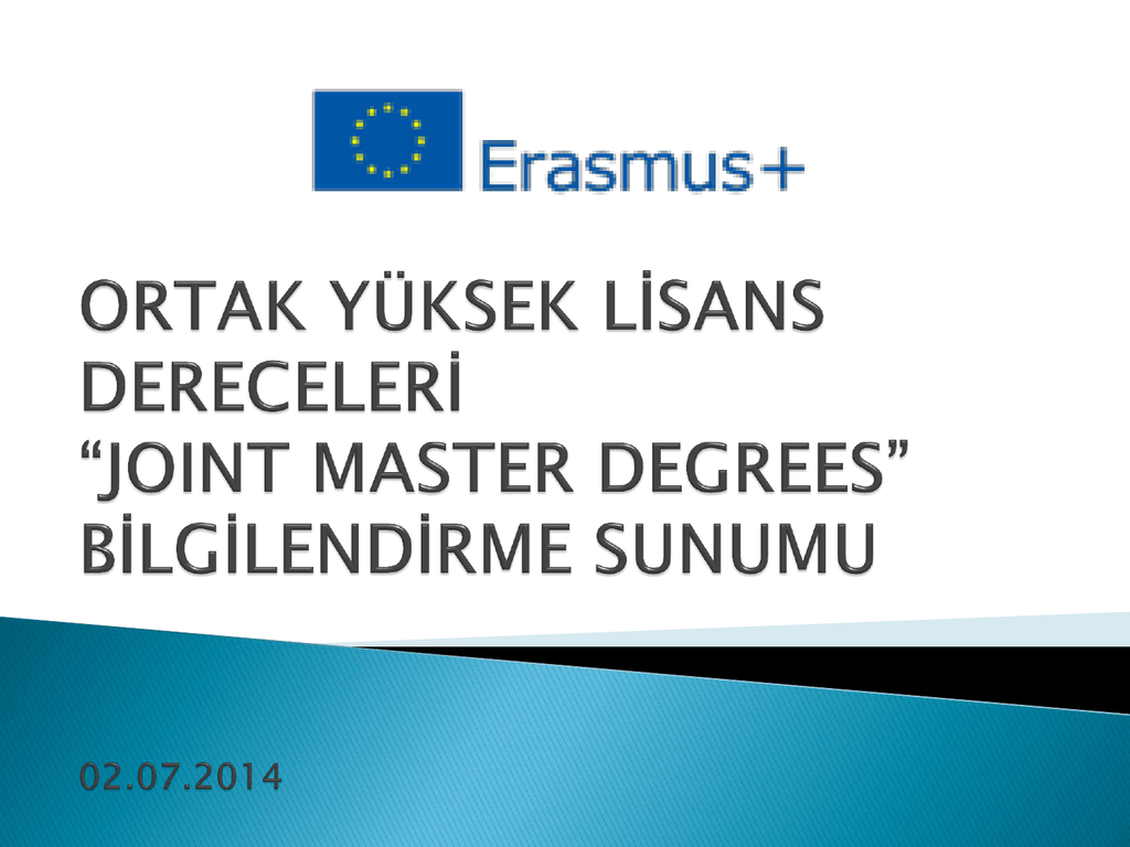 ERASMUS + Spor AE1- Bireylerin Öğrenme Hareketliliği Eğitim ve Gençlik Alanındaki Hareketlilik Projeleri Geniş Katılımlı Avrupa Gönüllü Hizmeti Organizasyonları Ortak Master Derecesi Master Öğrencisi Kredi Garantisi AE2- İyi Uygulamaların Paylaşımı ve Yenilik İçin İşbirliği Stratejik Ortaklıklar Bilgi Ortaklıkları Sektörel Beceri Ortaklıkları Gençlik Alanında Kapasite Geliştirme AE3- Politika Reformlarına Destek Structured Dialogue: Meetings between young people and decision-makers in the field of youth Kar Amacı Gütmeyen Avrupa Spor Organizasyonları Müşterek Ortaklıklar Ana Eylem 1 (KA 1) % 63 Ana Eylem 2 (KA 2) % 28 Ana Eylem 3 (KA 3) %4 Ortak Yüksek Lisans Derecesi, uluslararası yükseköğretim kurumları konsorsiyumu ve duruma göre ortak programın kapsadığı eğitim alanlarında belirli uzmanlığa sahip diğer eğitim ortakları ve/veya eğitim dışı ortaklar tarafından verilen 60, 90 veya 120 ECTS’lik üst düzey entegre bir uluslararası eğitim programıdır. Ortak Yüksek Lisans Derecesinin temel amaçları aşağıda verilmektedir: Yükseköğretim kurumlarında kaliteyi, yeniliği ve uluslararasılaşmayı teşvik etmek; Dünya çapındaki en iyi yüksek lisans öğrencilerine tam dereceli burslar sunarak Avrupa Yükseköğretim Alanının (EHEA) kalitesini ve cazibesini artırmak; Yüksek lisans mezunlarının yeterlilik seviyesini, becerilerini ve işgücü piyasasına uyumluluklarını iyileştirmek. Bu eylem altında aşağıdaki faaliyetleri desteklenmektedir: Ders verme ve/veya araştırma amacıyla davet edilen bilim adamlarının da (misafir öğretim üyeleri) katılımını içeren uluslararası bir yükseköğretim kurumları konsorsiyumu aracılığıyla organize edilen, 60, 90 veya 120 ECTS’e tekabül eden bir Ortak Yüksek Lisans Programının sunulması, Dünya çapında başarılı öğrencilere bu ortak yüksek lisans programlarından bir tanesine katılımları için burs verilmesi. Ortak Yüksek Lisans Dereceleri uluslararasıdır ve tam ortak sıfatıyla üç farklı Program Ülkesinden en azından üç Yükseköğretim Kurumu içerir. Bir Program Ülkesinde yerleşik Yükseköğretim Kurumları başvuruda bulunabilecektir. Yükseköğretim Kurumu Ortak Yüksek lisans Derecesi konsorsiyumu adına başvurabilmektedir. Ortak Ülkelerdeki Yükseköğretim Kurumlarının bir Program Ülkesinde yerleşik şubeleri veya Program Ülkelerindeki Yükseköğretim Kurumlarının Ortak Ülkede yerleşik şubeleri başvurmak için uygun değildir. Ortak Yüksek Lisans Derecesi konsorsiyumuna katılımlarının bir ön şartı olarak, Program Ülkelerinin tüm Yükseköğretim Kurumları geçerli bir Yükseköğretim İçin Erasmus Beyannamesine (ECHE) sahip olmalıdır. Ortak Ülkelerden gelen Yükseköğretim Kurumlarının bir ECHE’ye sahip olmaları beklenmemektedir ancak Ortak Yüksek Lisans Derecesi Konsorsiyum Anlaşmasının bir parçası olarak bunun tüm ilkelerini imzalamaları gerekecektir. 3 farklı Program Ülkesinden en az 3 yükseköğretim kurumu Bir Program Ülkesinde yerleşik Yükseköğretim Kurumları Ortak Yüksek lisans Derecesi konsorsiyumu adına başvurabilmektedir. Ön şart: geçerli bir Yükseköğretim İçin Erasmus Beyannamesine (ECHE) sahip Yükseköğretim Kurumları •Hazırlık yılı ve üç öğrenci alımı için 2 ila 3 milyon AVRO •Yılda azami 25.000 AVRO olmak üzere değişken sayıda öğrenci bursu Başvuru Süreci Süresine göre (1 veya 2 yıl) konsorsiyum bir hazırlık yılını ve bunu takip eden 3 müteakip öğrenci alımını finanse etmek için 4 veya 5 yıllık bir hibe sözleşmesi alacaktır. Faaliyet yeri: Eğitim-öğretim dönemi konsorsiyumda temsil edilen en az iki Program Ülkesinde gerçekleştirilmelidir Yüksek lisans seviyesindeki öğrenciler, katılımcı kuruluşların personeli, Program Ülkeleri ve Ortak Ülkelerden davetli bilim adamları (ziyaretçi öğretim üyeleri). Ortak Yüksek Lisans Derecesi uluslararası bir yükseköğretim kurumları konsorsiyumu ve yerine göre Ortak Yüksek Lisans Derecesinin uygulanmasına katkıda bulunan diğer türden kuruluşlar (şirketler, kamu kurumları, araştırma kuruluşları vb.) tarafından verilmektedir. Ortak Yüksek Lisans Derecesi Konsorsiyumunun oluşumu şu şekildedir: Başvuru sahibi/koordinatör: Proje teklifini tüm ortaklar adına sunan Yükseköğretim Kurumudur. Ortak Yüksek Lisans Derecesi verildiğinde, başvuru sahibi/koordinatör temel AB hibe yararlanıcısı haline gelir ve Ortak Yüksek Lisans Derecesi konsorsiyumu adına çok yararlanıcılı bir hibe sözleşmesi imzalar. Koordinasyon rolü aşağıdaki görevleri kapsamaktadır: Avrupa Komisyonu nezdinde katılımcı kuruluşlar grubu adına hareket eder ve bu kuruluşların temsilcisidir. Projenin tamamının operasyonel, idari ve finansal açıdan düzgün uygulanması ile ilgili idari ve finansal ve yasal sorumluluğunu taşımaktadır Diğer tüm proje ortakları ile işbirliği içerisinde Ortak Yüksek Lisans Derecesi'ni koordine etmektedir. Tam ortaklar: Yerleşik oldukları ülkenin ilgili makamları tarafından tanınan ve derece veren Yükseköğretim Kurumları ile Ortak Yüksek Lisans Derecesi'nin hazırlanması, uygulanması ve değerlendirilmesine aktif şekilde katkı yapan her türlü özel veya kamusal kuruluştur. Her bir tam ortak bir vekaletname imzalamalı ve imza sahibi olarak projenin uygulanması esnasında koordinatörün kendisi adına ve hesabına hareket etmesi için ona yetki vermelidir. Bağlı ortaklar(opsiyonel): Ortak Yüksek Lisans Derecesi eğitim programı bağlı ortakların katılımından da faydalanabilir. Bu kuruluşlar belirli görevlerin/faaliyetlerin uygulanmasına dolaylı olarak katkıda bulunmakta ve/veya Ortak Yüksek Lisans Derecesi’nin yaygınlaştırılmasını ve sürdürülebilirliğini desteklemektedir. Sözleşmeyi ilgilendiren yönetimsel konularda, “bağlı o