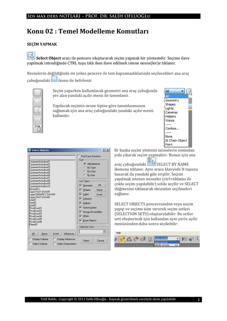 3ds max ders NOTLARI – PROF. DR. SALİH OFLUOĞLu Konu 02 : Temel Modelleme Komutları SEÇİM YAPMAK Select Object aracı ile pencere oluşturarak seçim yapmak bir yöntemdir. Seçime ilave yapılmak istendiğinde CTRL tuşu tıklı iken ilave edilmek istene nesne(ler)e tıklanır. Nesnelerin değildiğinde mi yoksa pencere ile tam kapsamadıklarında seçilecekleri ana araç çubuğundaki ikonu ile belirlenir. Seçim yaparken kullanılacak geometri ana araç çubuğunda yer alan yandaki açılır menü ile tanımlanır. Yapılacak seçimin nesne tipine göre tanımlanmasını sağlamak için ana araç çubuğundaki yandaki açılır menü kullanılır. Br başka seçim yöntemi nesnelerin ismindan yola çıkarak seçim yapmaktır. Bunun için ana araç çubuğundaki SELECT BY NAME ikonuna tıklanır. Aynı araca klavyede H tuşuna basarak da yandaki gibi erişilir. Seçimi yapılmak istenen nesneler (ctrl+tıklama ile çoklu seçim yapılabilir) solda seçilir ve SELECT düğmesine tıklanarak ekrandan seçilmeleri sağlanır. SELECT OBJECTS penceresinden veya seçim yapıp ve seçime isim vererek seçim setleri (SELECTION SETS) oluşturulabilir. Bu setler seti oluşturmak için kullanılan aynı yerin açılır menüsünden daha sonra seçilebilir: Telif Hakkı . Copyright © 2011 Salih Ofluoğlu ‐ Kaynak gösterilmek suretiyle alıntı yapılabilir 1 3ds max ders NOTLARI – PROF. DR. SALİH OFLUOĞLu Transformasyon işlemleri SEÇ VE TAŞI (SELECT AND MOVE) İŞLEMİ Seç ve taşı aracıyla nesne üzerine tıklanır ve üzerinde eksenler olan gizmo adı verilen sembol belirir. İstenen eksende fareyi basılı tutup hareket ettirerek nesnenin o eksen üzerinde hareket etmesi sağlanabilir. Seçilen eksenin rengi sarı olacaktır. Belirli bir mesafe girerek nesne hareket ettirilmek istenirse, MOVE aracı üzerine sağ tıklanarak transform penceresinde Absolute (kesin) veya Offset (göreceli) olarak istenen eksen(ler) için hareket ettirme mesafesi girilebilir. Absolute mesafe alırken ekrandaki gerçek orijin noktasını refereans alır ve şeklin taşınacağı konumun orijine göre koordinatlarının tanımlanmasını zorunlu kılar. Daha sık kullanılan ve daha kolay olan Offset seçeneği için ise şeklin bulunduğu nokta orijin kabul edildiği için sadece hareket ettirme mesafesinin girilmesi yeterlidir. Diğer hareket ettirme yöntemi ekranın altında yer alan yandaki alandan gerçekleştirilebilir. Burada da başta yer alan simgesi hareketi Absolute değerlerle, aynı ikona bir kez daha basarak çıkan simgesi ise Offset değerlerle göre tanımlama imkanı verir. NOT1: Nesneler pivot noktalarından referans alınarak hareket ettirilir. NOT2: Çalışılan nesne dışında başka bir nesne üzerinde işlem yapmayı engellemek için SELECTION LOCK TOOGLE düğmesine tıklanır. Bu düğmeye tekrar tıklanmadan diğer nesneler üzerinde işlem yapılamaz. Bu özellik SPACE tuşuna basıldığında da devreye girmektedir. ABSOLUTE MODUNDA TAŞIMA mevcut konum taşındığı konum Telif Hakkı . Copyright © 2011 Salih Ofluoğlu ‐ Kaynak gösterilmek suretiyle alıntı yapılabilir 2 3ds max ders NOTLARI – PROF. DR. SALİH OFLUOĞLu ABSOLUTE MODDA TAŞIMA OFFSET MODUNDA TAŞIMA mevcut konum taşındığı konum NOT: Gizmo bir sebeple ekrandan kalktığında geri getirmek için aşağıdaki işlem yapılır: SNAP AYARI İLE NESNELERİ BİRBİRİNE GÖRE DÜZENLEMEK Nesneleri birbirlerine göre konumlandırırken, ekran üzerindeki yerlerine ve büyüklüklerine karar verirken SNAP ayarlarından faydalanılır. Snap seçeneklerinin aktif olabilmesi için SNAP TOGGLE düğmesindeki ayarlardan ilgili olanının aktif olması gerekir. S tuşuna basarak da aktif yapılabilir. SNAP TOOGLE kısmında yer alan seçenekler şu şekildedir: Objelerin üzerinde her 2D ve 3D olmak üzere her yönde seçim yaptırır. Bir 3D noktanın grid düzlemi üzerinde uzantısına snap yapar. Örneğin aşağıda plan ekranında bir 3D nokta seçilerek bunun uzantısından başlayan yeni bir şekil myedana getirilmiştir. Telif Hakkı . Copyright © 2011 Salih Ofluoğlu ‐ Kaynak gösterilmek suretiyle alıntı yapılabilir 3 3ds max ders NOTLARI – PROF. DR. SALİH OFLUOĞLu Yukarıdaki işlem 2D snap iele yapıldığında üstteki nokta seçilemeyecektir. 3D snap ile yapıldığında ise sonraki işlem nokta ile aynı yüzeyde gerçekleşecektir. Sadece grid düzleminde seçim yaptırır. Z yönünde yakalama yapmaz. En sık kullanılan bazı snap seçenekleri: Grid Points: Grid çizgi noktalarına göre snap yaptırır. Vertex: Nesnelere ait uç/köşe noktaları referans alarak konumlandırılmalarını sağlar. Edge/Segment: Kenarlar segmentleri seçmeye yarar. ve Telif Hakkı . Copyright © 2011 Salih Ofluoğlu ‐ Kaynak gösterilmek suretiyle alıntı yapılabilir 4 3ds max ders NOTLARI – PROF. DR. SALİH OFLUOĞLu End Point: Çizgi uç noktalarından seçim yaptırır. Mid Point: Orta noktadan seçtirir. Pivot: Bir şekile ait pivot noktasından yakalayıp diğer şekilin pivot noktasına taşır. Daha az kullanılanlar: Center Face: Yüzeyin merkezinden seçtirirek bu noktadan hareket etmesini sağlar. Perpendicular: Genellikle iki boyutlu şekiller çizerken bir nesnenin diğer nesneye göre dik açıda olmasını sağlarllanılır. Aşağıda Line aracı ile birlikte kullanılabilir. Grid Lines: Grid noktaları haricinde grid çizgileri üzerinde hareket edilmesini sağlar. Bounding Box: Küp dışındaki bazı şekillerin kapladıkları çerçeve alanlarına göre seçim yapılmasını sağlar. Tangent: Ağırlıklı olarak iki boyutlu şekillerde kullanılır. Bir şekli Telif Hakkı . Copyright © 2011 Salih Ofluoğlu ‐ Kaynak gösterilmek suretiyle alıntı yapılabilir 5 3ds max ders NOTLARI – PROF. DR. SALİH OFLUOĞLu diğerinin teğetine taşımaya yarar. DÖNDÜRME (ROTATE) İŞLEMİ simgesine basılarak şekle tıklanır, ekranda beliren döndürme gizmosu yard