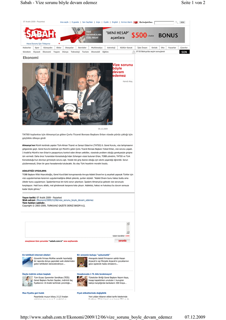 Seite 1 von 2 Sabah - Vize sorunu böyle devam edemez 07.12.2009