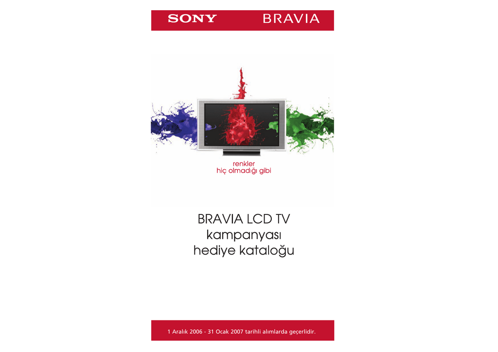 1 Aral›k 2006 - 31 Ocak 2007 tarihli al›mlarda geçerlidir. HED‹YELER‹N‹Z‹ NASIL ALACAKSINIZ? De¤erli SONY Dostu, Hediye siparifllerinizi, 0212 325 79 49 No’lu Sony Kampanya Ça¤r› Merkezi numaras›n› arayarak bildirebilirsiniz. Ça¤r› merkezimiz haftaiçi 09.00-18.00 saatleri aras›nda hizmet vermektedir. Siparifllerinizin onaylanmas› için, hediye katalo¤unuzun arkas›nda yer alan Hediye ‹stek Formunu eksiksiz olarak doldurup, Sony yetkili sat›fl noktalar›ndan sat›n alm›fl oldu¤unuz 01 Aral›k 2006 - 07 Ocak 2007 tarihli Sony Bravia LCD TV'nin fatura fotokopisi ve Sony Eurasia garanti belgesi fotokopisi ile birlikte 0212 324 77 30 No’lu faksa göndermeniz gerekmektedir. Doldurdu¤unuz Hediye Talep Formu'nu, ekine LCD TV'nizin fatura fotokopisi ve Sony Eurasia garanti belgesi fotokopisini de ekleyerek, INTERLINK ‹thalat ‹hracat ve Pazarlama A.fi. Yeflilce Mah. Diken Sok. No:1 4.Levent-‹STANBUL adresine iadeli taahütlü posta yolu ile göndererek de hediye taleplerinizi gerçeklefltirebilirsiniz. Ayr›ca www.sony.com.tr adresindeki kampanya ile ilgili bölümden de katalogdaki hediye seçeneklerini görebilirsiniz. Hediye siparifl formunu bas›p eksiksiz doldurarak sat›n ald›¤›n›z fatura ve Sony Eurasia garanti belgesi ile birlikte 0212 324 77 30 No’lu faksa göndererek de sipariflinizi verebilirsiniz. Hediye katalo¤undaki ürünler sadece yukar›da belirtilen yöntemlerle siparifl edilebilir. Herhangi bir Sony / Braun / Kenwood / Delsey / Black & Decker sat›fl noktas›ndan talep edilemez. Tüm bu yöntemleri kullanarak verece¤iniz hediye siparifllerinizde, kazand›¤›n›z hediyenin tutar› seçece¤iniz hediyenin de¤erine ulaflamad›¤› taktirde aradaki fark› kredi kart› ile ödeyerek tamamlayabilirsiniz. Sony yetkili sat›fl noktalar›ndan yapt›¤›n›z al›flverifli daha keyifli, daha e¤lenceli hale getirmeyi amaçlad›¤›m›z bu kampanyam›zda karfl›l›kl› kazanma ilkesinden yola ç›kt›k. Sony yetkili sat›fl noktalar›ndan sat›n ald›¤›n›z Sony Eurasia garantili Bravia LCD TV ile hediye katalo¤umuzdaki birbirinden güzel hediyelerden seçme flans› yakalayacaks›n›z. Sony BRAVIA LCD TV’lerle gelen bu f›rsat› en iyi flekilde de¤erlendirmenizi dileriz. BRAVIA ile televizyon izleme zevkinize, arma¤an keyfini de kat›n. Sayg›lar›m›zla, SONY EURASIA KAMPANYAMIZ Bu kampanya, 01 Aral›k 2006 - 31 Ocak 2007 tarihleri aras›nda, Sony yetkili sat›fl noktalar›ndan yap›lan, Sony Eurasia garantili Bravia LCD TV al›mlar›na uygulanacakt›r. HED‹YELER S‹ZE NASIL ULAfiACAK? Hediyeleriniz, talep formunda belirtti¤iniz adresinize 30 gün içinde kargo firmas› arac›l›¤› ile teslim edilecek olup kargo ücretleri SONY EURASIA taraf›ndan karfl›lanmaktad›r. (G Serisi LCD TV'ler, SXRD ve 3LCD TV’ler kampanyaya dahil de¤ildir.) D‹KKAT ED‹LECEK HUSUSLAR! Hediye Tutarlar› (KDV dahil YTL) 52” - 132 ekran (52X) 900 46” - 117 ekran (46S/46V/46W/46X) 750 40” - 102 ekran (40U/40S/40V/40W/40X) 500 32” - 82 ekran (32U/32S/32V) 300 26” - 66 ekran (26U/26S) 250 20” - 51 ekran (20S) 150 G Serisi kampanya d›fl›ndad›r. Organizasyon: INTERLINK fi‹RKETLER GRUBU Tel: (0212) 324 77 01 NASIL HED‹YE KAZANACAKSINIZ? Kampanya boyunca Sony yetkili sat›fl noktalar›ndan yapt›¤›n›z afla¤›da belirtilen SONY LCD TV al›mlar› karfl›l›¤›nda, bu katalogda yer alan ve afla¤›da miktarlar› belirtilen tutarlarda hediye kazanacaks›n›z. • Kampanyaya kat›lmak için faturan›z›n tarihinin, 01 Aral›k 2006 - 31 Ocak 2007 tarihleri aras›nda olmas› gerekmektedir. Hediye siparifllerinizi 2 fiubat 2007 tarihine kadar gerçeklefltirebilirsiniz. • Kampanya Sony yetkili sat›fl noktalar›ndan yap›lan, SONY EURASIA garantisi alt›ndaki LCD TV al›mlar›na uygulanacakt›r. (G Serisi LCD TV'ler, SXRD ve 3LCD TV’ler kampanyaya dahil de¤ildir.) • Hediye taleplerinizin onaylanabilmesi için, Hediye ‹stek Formunun eksiksiz olarak doldurularak, ekinde LCD TV fatura fotokopisi ve eksiksiz doldurulmufl kaflelenmifl Sony Eurasia Garanti Belgesi fotokopisi ile birlikte 0212 324 77 30 No’lu faksa gönderilmesi veya INTERLINK ‹thalat ‹hracat ve Pazarlama A.fi. Yeflilce Mah. Diken Sok. No:1 4.Levent-‹STANBUL adresine iadeli taahhütlü posta yolu ile gönderilmesi zorunludur. • Eksik olarak doldurulan ya da kaflesiz Sony Eurasia garanti belgeleriyle hediye talep edilemez. • Katalogta yer alan ürünler üretici ve ithalatç› firmalar›n garantisi alt›nda olup, garanti belgesinde belirtilen hükümlere tabidir. • Teslimat s›ras›nda ürün paketi aç›larak sa¤laml›¤› kontrol edilmelidir. Herhangi bir hasar tespit edildi¤inde, teslim eden kargo firmas› taraf›ndan tutulacak hasar zab›t formu ile birlikte ürün iade edilmelidir. Aksi halde teslimat onay›ndan sonra yap›lacak itirazlar kabul edilmeyecektir. Nakliyeden do¤acak hasarlar kargo firmas›na aittir. • Hediye Katalogunda yer alan ürünler stoklarla s›n›rl›d›r. Model, desen, özellik ve renklerde de¤ifliklik olabilir. • Seçilen hediyenin teknik nedenlerden dolay› sa¤lanamamas› ya da stoklar›n›n tükenmesi durumunda, yerine efl de¤erde baflka bir hediye sunulur veya talebiniz iptal edilerek, baflka bir hediye seçmeniz için iade edilir. • Hediyeler nakde çevrilemez. • Katalogdaki fiyatlar KDV dahil fiyatlard›r. • LCD’nin iade edilmesi gerekirse hediyesinin de iade edilmesi gerekmektedir. Bu tür durumlarda ça¤r› merkezinden detayl› bilgi al›nmal›d›r. • Hediye siparifli verilmesi, bu belgede yer alan tüm flartlar›n kabulü anlam›na gelir. • Bu kampanya baflka kampanyalarla birlefltirilemez. • Hata, tasar›m ve teknik farkl›l›klar olabilir. • Kampanya Bravia LCD TV stoklar›yla s›n›rl›d›r. SONY EURASIA HED‹YE KAMPANYASI DANIfiMA HATTI: (0212) 32