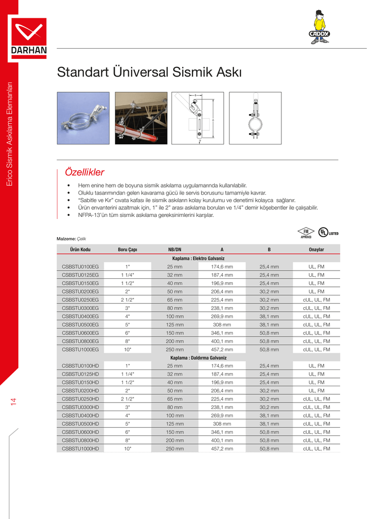 Erico Sismik Askılama Elemanları Standart Üniversal Sismik Askı Özellikler • • • • • Hem enine hem de boyuna sismik askılama uygulamarında kullanılabilir. Oluklu tasarımından gelen kavarama gücü ile servis borusunu tamamiyle kavrar. “Sabitle ve Kır” cıvata kafası ile sismik askıların kolay kurulumu ve denetimi kolayca sağlanır. Ürün envanterini azaltmak için, 1” ile 2” arası askılama boruları ve 1/4” demir köşebentler ile çalışabilir. NFPA-13’ün tüm sismik askılama gereksinimlerini karşılar. Malzeme: Çelik Ürün Kodu Boru Çapı NB/DN CSBSTU0100EG 1" 25 mm CSBSTU0125EG 1 1/4" CSBSTU0150EG 1 1/2" CSBSTU0200EG CSBSTU0250EG CSBSTU0300EG A B Onaylar 174,6 mm 25,4 mm UL, FM 32 mm 187,4 mm 25,4 mm UL, FM 40 mm 196,9 mm 25,4 mm UL, FM 2" 50 mm 206,4 mm 30,2 mm UL, FM 2 1/2" 65 mm 225,4 mm 30,2 mm cUL, UL, FM 3" 80 mm 238,1 mm 30,2 mm cUL, UL, FM CSBSTU0400EG 4" 100 mm 269,9 mm 38,1 mm cUL, UL, FM CSBSTU0500EG 5" 125 mm 308 mm 38,1 mm cUL, UL, FM CSBSTU0600EG 6" 150 mm 346,1 mm 50,8 mm cUL, UL, FM CSBSTU0800EG 8" 200 mm 400,1 mm 50,8 mm cUL, UL, FM CSBSTU1000EG 10" 250 mm 457,2 mm 50,8 mm cUL, UL, FM Kaplama : Elektro Galvaniz 14 Kaplama : Daldırma Galvaniz CSBSTU0100HD 1" 25 mm 174,6 mm 25,4 mm UL, FM CSBSTU0125HD 1 1/4" 32 mm 187,4 mm 25,4 mm UL, FM CSBSTU0150HD 1 1/2" 40 mm 196,9 mm 25,4 mm UL, FM CSBSTU0200HD 2" 50 mm 206,4 mm 30,2 mm UL, FM CSBSTU0250HD 2 1/2" 65 mm 225,4 mm 30,2 mm cUL, UL, FM CSBSTU0300HD 3" 80 mm 238,1 mm 30,2 mm cUL, UL, FM CSBSTU0400HD 4" 100 mm 269,9 mm 38,1 mm cUL, UL, FM CSBSTU0500HD 5" 125 mm 308 mm 38,1 mm cUL, UL, FM CSBSTU0600HD 6" 150 mm 346,1 mm 50,8 mm cUL, UL, FM CSBSTU0800HD 8" 200 mm 400,1 mm 50,8 mm cUL, UL, FM CSBSTU1000HD 10" 250 mm 457,2 mm 50,8 mm cUL, UL, FM Ürün Kodu ENLEMESİNE BOYLAMASINA Hafif Seri Boru Sch 10 Boru Sch 40 Boru Hafif Seri Boru Sch 10 Boru Sch 40 Boru CSBSTU0100xx N/A 2910 N 2910 N 2910 N 2910 N 2910 N CSBSTU0125xx 2910 N 2910 N 2910 N 2910 N 2910 N 2910 N CSBSTU0150xx 2910 N 2910 N 2910 N 2910 N 2910 N 2910 N CSBSTU0200xx 13340 N 13340 N 13340 N 8960 N 8960 N 8960 N CSBSTU0250xx 13340 N 13340 N 13340 N 8960 N 8960 N 8960 N CSBSTU0300xx 13340 N 13340 N 13340 N 8960 N 8960 N 8960 N CSBSTU0400xx 13340 N 13340 N 13340 N 8960 N 8960 N 8960 N CSBSTU0500xx 13340 N 13340 N 13340 N N/A 8960 N 8960 N CSBSTU0600xx 13340 N 13340 N 13340 N 8960 N 8960 N 8960 N CSBSTU0800xx N/A 13340 N 13340 N N/A 8960 N 8960 N CSBSTU1000xx N/A 13340 N 13340 N N/A 13340 N 13340 N Erico Sismik Askılama Elemanları UL® Yük Dayanımı FM® Yük Dayanımı Uygulama Açısına Göre Yük Dayanımı (Hafif Seri Boru, Sch 10, Sch 40 ) ENLEMESİNE Ürün Kodu BOYLAMASINA 30° - 44° 45° - 59° 60° - 74° 75° - 90° 30° - 44° 45° - 59° 60° - 74° 75° - 90° CSBSTU0100xx 3825 N 5425 N 6670 N 7430 N 4315 N 3200 N 3825 N 4270 N CSBSTU0125xx 3825 N 5425 N 6670 N 7430 N 4315 N 3200 N 3825 N 4270 N CSBSTU0150xx 3825 N 5425 N 6670 N 7430 N 4315 N 3200 N 3825 N 4270 N CSBSTU0200xx 6805 N 9610 N 11790 N 13165 N 3870 N 3070 N 3690 N 4136 N CSBSTU0250xx 6805 N 9610 N 11790 N 13165 N 3870 N 3070 N 3690 N 4136 N CSBSTU0300xx 6805 N 9610 N 11790 N 13165 N 3870 N 3070 N 3690 N 4136 N CSBSTU0400xx 6985 N 9875 N 12100 N 13480 N 6895 N 6185 N 7475 N 8320 N CSBSTU0500xx 6985 N 9875 N 12100 N 13480 N 6895 N 6185 N 7475 N 8320 N CSBSTU0600xx 8805 N 12500 N 15300 N 17080 N 6540 N 5205 N 6270 N 6985 N FM® Yük Dayanımı Uygulama Açısına Göre Yük Dayanımı 4.8 mm et kalınlığı, Sch 40 ) ENLEMESİNE Ürün Kodu 30° - 44° 45° - 59° 60° - 74° BOYLAMASINA 75° - 90° 30° - 44° 45° - 59° 60° - 74° 75° - 90° 9075 N 12855 N 15745 N 17570 N 5340 N 7560 N 9295 N 10365 N 9075 N 12855 N 15745 N 17570 N 5340 N 7560 N 9295 N 10365 N 15 CSBSTU0800xx CSBSTU1000xx