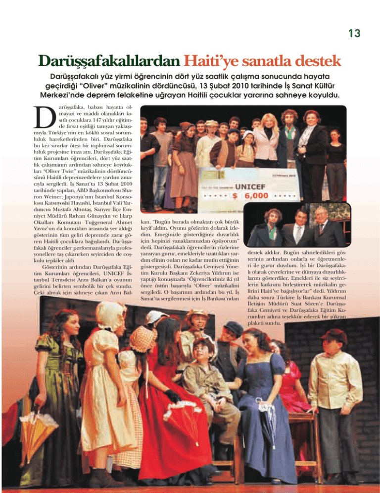 HABER Darüşşafakalılardan Haiti’ye sanatla destek Darüşşafakalı yüz yirmi öğrencinin dört yüz saatlik çalışma sonucunda hayata geçirdiği “Oliver” müzikalinin dördüncüsü, 13 Şubat 2010 tarihinde İş Sanat Kültür Merkezi’nde deprem felaketine uğrayan Haitili çocuklar yararına sahneye koyuldu. arüşşafaka, babası hayatta olmayan ve maddi olanakları kısıtlı çocuklara 147 yıldır eğitimde fırsat eşitliği tanıyan yaklaşımıyla Türkiye’nin en köklü sosyal sorumluluk hareketlerinden biri. Darüşşafaka bu kez sınırlar ötesi bir toplumsal sorumluluk projesine imza attı. Darüşşafaka Eğitim Kurumları öğrencileri, dört yüz saatlik çalışmanın ardından sahneye koydukları “Oliver Twist” müzikalinin dördüncüsünü Haitili depremzedelere yardım amacıyla sergiledi. İş Sanat’ta 13 Şubat 2010 tarihinde yapılan, ABD Başkonsolosu Sharon Weiner, Japonya’nın İstanbul Konsolosu Katsuyoshi Hayashi, İstanbul Vali Yardımcısı Mustafa Altıntaş, Sarıyer İlçe Emniyet Müdürü Rıdvan Günaydın ve Harp Okulları Komutanı Tuğgeneral Ahmet Yavuz’un da konukları arasında yer aldığı gösterinin tüm geliri depremde zarar gören Haitili çocuklara bağışlandı. Darüşşafakalı öğrenciler performanslarıyla profesyonellere taş çıkarırken seyirciden de coşkulu tepkiler aldı. Gösterinin ardından Darüşşafaka Eğitim Kurumları öğrencileri, UNICEF İstanbul Temsilcisi Arzu Balkan’a oyunun gelirini belirten sembolik bir çek sundu. Çeki almak için sahneye çıkan Arzu Bal- D kan, “Bugün burada olmaktan çok büyük keyif aldım. Oyunu gözlerim dolarak izledim. Emeğinizle gösterdiğiniz duyarlılık için hepinizi yanaklarınızdan öpüyorum” dedi. Darüşşafakalı öğrencilerin yüzlerine yansıyan gurur, emekleriyle uzattıkları yardım elinin onları ne kadar mutlu ettiğinin göstergesiydi. Darüşşafaka Cemiyeti Yönetim Kurulu Başkanı Zekeriya Yıldırım ise yaptığı konuşmada “Öğrencilerimiz iki yıl önce üstün başarıyla ‘Oliver’ müzikalini sergiledi. O başarının ardından bu yıl, İş Sanat’ta sergilenmesi için İş Bankası’ndan destek aldılar. Bugün sahneledikleri gösterinin ardından onlarla ve öğretmenleri ile gurur duydum. İyi bir Darüşşafakalı olarak çevrelerine ve dünyaya duyarlılıklarını gösterdiler. Emekleri ile siz seyircilerin katkısını birleştirerek müzikalin gelirini Haiti’ye bağışlıyorlar” dedi. Yıldırım daha sonra Türkiye İş Bankası Kurumsal İletişim Müdürü Suat Sözen’e Darüşşafaka Cemiyeti ve Darüşşafaka Eğitim Kurumları adına teşekkür ederek bir şükran plaketi sundu. 13 “Çığ gibi büyüyen destekle her geçen yıl daha çok çocuğa ulaşacağımıza inanıyoruz” Değerli Okuyucular, Darüşşafaka Ailesi olarak aramıza yeni kardeşlerimizin katılacağı bir döneme daha giriyoruz. Darüşşafaka Giriş Sınavı, bizler için eğitimde fırsat eşitliği misyonunu Türkiye’nin her köşesine taşıyabilmek, ülkemizin her köşesinden yeni Daçkalılar kazanabilmek açısından önem taşıyor. 30 Mayıs 2010 tarihinde düzenlenecek sınav öncesinde her yıl olduğu gibi öğretmenlerimiz Anadolu’ya yayılacak, gittikleri yerlerde yaşayan Darüşşafakalı kardeşlerimizle bir araya gelecek; meslektaşlarına ve heyecanla çocuklarına iyi bir eğitim fırsatı yaratmayı arzu eden annelerle, büyükanne-büyükbabalarla buluşacaklar. Üç günde otuz üç ili ziyaret edecek olan ekiplerimiz, geçtiğimiz üç yılda katlanarak artan sınav başvurularında kendi rekorlarını bir kez daha geçme hedefiyle yola çıkacaklar. Bu yolculukta bize destek verecek, bizimle birlikte olacak tüm Darüşşafaka dostlarına şimdiden teşekkür etmeyi bir borç biliyorum. Bizler, bu büyüyen destekle her geçen yıl daha çok çocuğa ulaşacağımıza inanıyoruz. Hedef eğitim olunca yalnızca eğitim kadroları değil, eğitime gönül verenler de bir araya geliyor. 2009 yılına veda ederken, göklerde hoş bir seda kaldı dev bir teşekkürü daha hak eden… Geçen yıl Sezen Aksu’nun açtığı yolda bayrağı devir alan Ferhat Göçer öğrencilerimizden oluşan 100 kişilik koroyla sahne alırken onlar için bir rol modeli de oluşturdu. Öğretmen bir anne-babanın oğlu, tıp doktoru ve değerli sanatçı Ferhat Göçer’in hem konser öncesinde, hem de konser sırasında Darüşşafaka’nın tanıtımı için verdiği destek bizleri Darüşşafaka’nın geleceği için yeniden cesaretlendirdi. Salonu doldurarak destek verenler ve bizler için en unutulmayacak an ise, sanatçının prova sırasında çektiği görüntüleri konser sonunda hepimizle sahneden paylaşmasıydı… O anda, Darüşşafaka’nın aydınlık geleceğinin enerjisinin çocuklarımızdan izleyicilere ve onlardan kamuoyuna yansıdığına tanık olduk hepimiz. Yılın son üç ayı aldığımız bağışlar Darüşşafaka’nın yaygın bir halk desteğine erişmekte olduğunu gösterdi bize. Kurban bağışları, geçtiğimiz yıla göre yüzde 144 artarken, öğrencilerimizin tasarım sanatçısı Emre Senan ile yaptığı ambalaj kağıdı çalışmaları Teknosa aracılığıyla evlere ulaştı. Biz, her zaman Darüşşafaka büyük bir aile diyoruz. Bu nedenle, senaryo yazarı kardeşim Vasıf Küçükoruç’tan, tam otuz yedi yıldır Darüşşafaka’da görev yapan emektarımız Kemal Özkan’a, Türkiye’nin önde gelen iş adamlarından, bağışçımız rahmetli Ayhan Şahenk’ten, Cumhurbaşkanı eski Genel Sekreteri, onur duyduğumuz mezunumuz rahmetli Necdet Seçkinöz Ağabeyimize uzanan bu ailenin değerli temsilcilerine bu sayımızda yer veriyoruz. Gönlümüz ve hedefimiz aramıza yeni katılacak yavrularımızın da bu Aileyi gururla temsil edenlerin izinden gitmesi. Saygılarımla, Zekeriya Yıldırım Yönetim Kurulu Başkanı Darüşşafaka Cemiyet