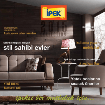 kış evinin canlı renklerin enerjisi davet ve kutlama sofraları pastelleri KOLTUK TAKIMLARI / SOFA SETS Crystal Kanyon Country Sedef Idea Nehir Pearl Mistral Neva Fly Sema Esen Erguvan Selvi Naturel Ilgaz Akasya Style Vega Yaprak Eylül Madlen Bahar Sorano Angel KÖŞE TAKIMLARI / CORNER SETS Kanyon Nova Fyona Seher Flower Esen kontrast renklerin çekim gücü koyu renklerin gizemi rahat MAKSİ TAKIMLAR / SITTING GROUPS Podium Flower Selvi Duru Hayal Yıldız Gonca Buket 6-7 8-9 10-11 12-13 14-15 16-17 18-19 20-21 22-23 24-25 26-27 28-29 30-31 32-33 34-35 36-37 38-39 40-41 42-43 44-45 46-47 48-49 50-51 52-53 54-55 56 57 58 59 60 61 62-63 64-65 66-67 68-69 70 71 72 73 YATAK & YEMEK ODALARI / BEDROOMS & DININGROOMS 76-77 Crystal 78-79 Crystal 80-81 Neva 82-83 Neva 84-85 Naturel 86-87 Naturel 88-89 Country 90-91 Country 92-93 Sema 94-95 Sema 96-97 Nehir 98-99 Nehir 100-101 Yakut 102-103 Yakut 104-105 Rena 106-107 Rena 108-109 Ayda 110-111 Ayda 112-113 Lego 114-115 Lego 116-117 Zambak 118-119 Zambak GENÇ ODALARI / YOUNG ROOMS Latte Venice Dinamik Tv Üniteleri 120-121 122-123 124-125 126-129 BAZA & YATAKLAR / BASES & BEDS Baza Setleri Yataklar Bazalar Başlıklar 132-135 136-143 144-145 146-147 keyifli uykular ipeksi bir mutluluk için... Hayallerinizi süsleyenler salonunuzu süslesin. İpek’in onlarca çeşit takımlarıyla hayalleriniz gerçek oluyor... Eviniz değişime salondan başlıyor... Koltuk Takımları, Köşe Takımları, Maksi Takımlar ipeksi bir mutluluk için... www.ipekmobilya.com.tr / 5 ipeksi bir mutluluk için... Kumaş Kodu: 1218A-1214A-1208A CRYSTAL 100 87 97 103 koltuk takımı / sofa set 80 226 Kumaş Kodu: 1202A-1203A-1207A www.ipekmobilya.com.tr / 7 ipeksi bir mutluluk için... Kumaş Kodu: 1162A-1211A-1209A-1208A KANYON 90 8 / www.ipekmobilya.com.tr 80 90 90 96 koltuk takımı / sofa set 90 177 230 yatak ölçüsü:130*186 ipeksi bir mutluluk için... 3’lü Desenli: 1203A-1206A-1217A, 3’lü Düz 1217A-1206A-1203A, Berjer : 1206A-1203A COUNTRY 92 83 koltuk takımı / sofa set 81 Kumaş Kodu: 1217A-1203A-1207A 10 / www.ipekmobilya.com.tr 78 87 230 ipeksi bir mutluluk için... Kumaş Kodu: 1218A-1203A-1214A SEDEF 86 85 74 101 koltuk takımı / sofa set 98 240 yatak ölçüsü:184*141 www.ipekmobilya.com.tr / 13 ipeksi bir mutluluk için... Kumaş Kodu: 1212A-1220A-1213A İDEA 90 96 100 190 yatak ölçüsü:131*120 14 / www.ipekmobilya.com.tr 84 84 100 koltuk takımı / sofa set 243 yatak ölçüsü:183*120 ipeksi bir mutluluk için... Kumaş Kodu: 1202A-1205A-1203A NEHİR 97 90 koltuk takımı / sofa set 80 91 96 216 www.ipekmobilya.com.tr / 17 ipeksi bir mutluluk için... Kumaş Kodu: 1217A-1203A-1206A PEARL 80 91 67 67 97 koltuk takımı / sofa set 92 177 233 yatak ölçüsü:190*130 www.ipekmobilya.com.tr / 19 ipeksi bir mutluluk için... Kumaş Kodu: 1213A-1223A-1222A MİSTRAL 99 85 koltuk takımı / sofa set 81 87 90 225 yatak ölçüsü:115*184 20 / www.ipekmobilya.com.tr ipeksi bir mutluluk için... Kumaş Kodu: 1202A--1203A 1204A NEVA 90 80 95 95 96 koltuk takımı / sofa set 89 180 230 www.ipekmobilya.com.tr / 23 FLY 86 72 koltuk takımı / sofa set 91 75 106 225 yatak ölçüsü: 182*125 Kumaş Kodu: 1219A-1220A-1203A www.ipekmobilya.com.tr / 25 ipeksi bir mutluluk için... Kumaş Kodu: 1115A-1123A-1040A SEMA 101 110 65 65 65 koltuk takımı / sofa set 101 184 238 yatak ölçüsü:183*133 www.ipekmobilya.com.tr / 27 ipeksi bir mutluluk için... Kumaş Kodu: 1060A-1203A-1204A ESEN 105 91 86 185 yatak ölçüsü:131*120 28 / www.ipekmobilya.com.tr 97 97 103 koltuk takımı / sofa set 235 yatak ölçüsü:183*120 ipeksi bir mutluluk için... Kumaş Kodu: 1204A-1207A ERGUVAN 93 77 82 96 koltuk takımı / sofa set 106 219 www.ipekmobilya.com.tr / 31 ipeksi bir mutluluk için... Kumaş Kodu: 1214A-1203A SELVİ 90 88 67 67 91 koltuk takımı / sofa set 91 169 227 yatak ölçüsü: 185*129 32 / www.ipekmobilya.com.tr ipeksi bir mutluluk için... Kumaş Kodu: 1216A-1213A-1213A NATUREL 81 87 67 67 99 koltuk takımı / sofa set 99 175 239 yatak ölçüsü: 186*129 www.ipekmobilya.com.tr / 35 ipeksi bir mutluluk için... Kumaş Kodu: 1103A-1219A-1211A-1203A ILGAZ 91 86 93 179 87 81 98 koltuk takımı / sofa set 234 yatak ölçüsü: 183*120 36 / www.ipekmobilya.com.tr ipeksi bir mutluluk için... Kumaş Kodu: 1217A-1203A-1214A AKASYA 81 87 86 86 99 koltuk takımı / sofa set 97 190 yatak ölçüsü:131*120 243 yatak ölçüsü:183*120 www.ipekmobilya.com.tr / 39 ipeksi bir mutluluk için... Kumaş Kodu: 1160A-1139A-1138A STYLE 101 93 101 101 110 koltuk takımı / sofa set 86 186 236 yatak ölçüsü:186*124 40 / www.ipekmobilya.com.tr ipeksi bir mutluluk için... Kumaş Kodu: 1108A-1122A-1041A VEGA 89 86 86 86 97 koltuk takımı / sofa set 97 180 yatak ölçüsü:131*120 230 yatak ölçüsü:183*120 www.ipekmobilya.com.tr / 43 YAPRAK 88 85 80 80 97 koltuk takımı / sofa set 96 240 220 yatak ölçüsü: 180*119 Kumaş Kodu: 1207A-1217A-1204A-910 www.ipekmobilya.com.tr / 45 ipeksi bir mutluluk için... Kumaş Kodu: 1220A-1212A-910 EYLÜL 92 87 koltuk takımı / sofa set 88 46 / www.ipekmobilya.com.tr Kumaş Kodu: 1216A-1213A-469 93 96 238 Yatak Ölçüsü 124*182 ipeksi bir mutluluk için... Kumaş Kodu: 1217A-1204A-1204A MADLEN 96 108 85 85 85 koltuk takımı / sofa set 96 190 233 www.ipekmobilya.com.tr / 49 ipeksi bir mutluluk için... Kumaş Kodu: 1212A-1215A-1205A BAHAR 82 76 koltuk takımı / sofa set 92 75 109 224 yatak ölçüsü: 180*125 50 / www.ipekmobilya.com.tr ipeksi bir mutluluk için... Kumaş Kodu: 1109A-1135A-910-911 SORANO 88 52 / www.ipekmobilya.com.tr 84 84 92 koltuk takımı / sofa set 88 227 Yatak Ölçüsü 114*182 ipeksi bir mutluluk için... Kumaş Kodu: 1217A-1207A-910 ANGEL 97 87 koltuk takımı / sofa set 89 86 96 238 Yatak Ölçüsü 124*182 www.ipekmobilya.com.tr / 55 KANYON köşe takımı / corner set ipeksi bir mutluluk için... NOVA köşe takımı / corner set Kumaş Kodu: 1220A-1219A-1209A-1208A Kumaş Kodu: 1215A-1212A www