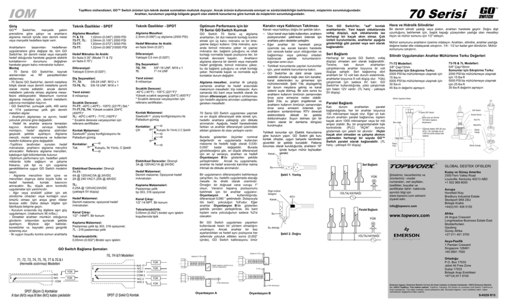 IOM 70 Serisi TopWorx mühendisleri, GO™ Switch ürünleri için teknik destek sunmaktan mutluluk duyuyor. Ancak ürünün kullanımında emniyet ve sürdürülebilirliğin belirlenmesi, müşterinin sorumluluğundadır. Anahtarı, kurulumun yapıldığı bölgede geçerli olan elektrik kanunlarına göre kurmak da müşterinin sorumluluğundadır. Giriş GO™ Switch'ler, manyetik çekim prensibine göre çalışır ve anahtarın algılama menzili içinde olan demirli metal veya manyetik hedeflere tepki verir. Anahtarların tasarımları hedeflenen uygulamalara göre değişse de, tüm GO Switch'ler, bir demirli metal veya manyetik hedef olduğunda harekete geçerek elektrik kontaklarının durumunu değiştiren harekete geçen kalıcı mıknatıslar kullanır. Montaj - 70 Serisi GO Switch'ler, kaynak alanlarından ve RF parazitlerinden etkilenmez. - 70 Serisi GO Switch'ler, demirli metallere bitişik olarak veya demirli metallerle çevrili olarak monte edilebilir, ancak demirli metallerin yakında olması algılama mesafesini etkileyecektir. Maksimum nominal algılama mesafesi için, demirli metallerin yakınına montajdan kaçının. - GO Switch'ler, yumuşak çelik, 400 serisi ve 17/4 paslanmaz çelik gibi demirli metalleri algılar. - Anahtarın algılaması ve ayrımı, hedef yolculuk yönüne göre değişebilir. - Hedef ile anahtar arasına temastan kaçının. Anahtarın ve/veya hedefin montajını, hedef algılama alafından geçecek şekilde ayarlayın. Algılama menzili, model numarasına ve kullanılan hedefin kütlesine göre değişebilir. -TopWorx tarafından sunulan hedef mıknatıslar, anahtarın algılama menzilini artıracaktır. Referans algılama menzilleri, katalogun ilgili bölümlerinde bulunur. -Optimum performans için, hedeften yeterli miktarda kütle sağlayın ve çalışma frekansı, yük tipi vs. için uygulama gerekliliklerine uygun GO Switch modelini seçin. - Algılama menzilinin tam içine ve menzilden dışarıya daha büyük kütle ve hedef hareketi, kontak basıncını artıracaktır. Bu, düşük akım kontrollü uygulamalar için yardımcıdır. - Ağır veya endüktif yükler için ark söndürme cihazları veya kontağın uzun ömürlü olması için araya giren röleler tavsiye edilir. Daha detaylı bilgiler için fabrikayla iletişime geçin. - Kurulum sırasında dış dişlilere aşırı güç uygulamayın. (maksimum 36 in/lbs.) - Dirsekler anahtarı mümkün olduğunca gövdenin ortasından ayıracak şekilde ayarlayın. Böylece ağır kablolar, konektörler vs. kaynaklı yersiz gerginlik önlenmiş olur. - İki uygun boyutlu kontra somun anahtarla Teknik Özellikler - SPDT Teknik Özellikler - DPDT Algılama Mesafesi: 71 & 72: 1,02mm (0.040") 2000 PSI 73-77, 7L: 2,54mm (0.100”) 2000 PSI 73-77: 1,83mm (0.072”) 5000 PSI 73-77: 1,52mm (0.060”)10000 PSI Algılama Mesafesi: 2,3mm (0.090") uç algılama (2000 PSI) Hedef Mıknatısı ile Aralık: En fazla 0.35” (Model 71 & 72 en fazla 0.15") Diferansiyel: Yaklaşık 0,5 mm (0.020") Diş Seçenekleri: 7G, 7H: 5/8"-18 UNF; M18 x 1 7I: 1"-14 UNF Diferansiyel: Yaklaşık 0,5mm (0.020") Yanıt süresi: 8 milisaniye Diş Seçenekleri: 71, 72: 3/8-24 UNF; M12 x 1 73-76, 7L: 5/8-18 UNF; M18 x 1 Yanıt süresi: 8 milisaniye Sıcaklık Derecesi: 71-77: -40ºC (-40ºF) - 105ºC (221ºF) Std.* 71-77,7G, 7H: Yüksek sıcaklık 204ºC (400ºF)* 7L: -40ºC (-40ºF) - 71ºC (160ºF)* * Sıcaklık derecesi varyasyonları için referans sertifikaları. Kontak Malzemesi: Sawtooth® yüzey konfigürasyonu ile Palladium gümüş Kontaklar: Tek Hedef Mıknatısı ile Aralık: en fazla 5mm (0.20”) Sıcaklık Derecesi: -40°C (-40°F) - 105°C (221°F)* Yüksek sıcaklık seçeneği 204°C (400°F)* * Sıcaklık derecesi varyasyonları için referans sertifikaları. Kontak Malzemesi: Sawtooth™ yüzey konfigürasyonu ile Palladium gümüş Kontaklar: Çift Kutuplu İki Yönlü 2 C Şekilli Kutuplu, İki Yönlü, C Şekilli Elektriksel Dereceler: Dirençli 3A @ 120VAC/1A @ 24VDC Elektriksel Dereceler: Dirençli 71-77: 4A @ 120VAC/3A @ 24VDC 2A @ 240 VAC/1,25A @ 48VDC Hedef Malzemesi: Demirli malzeme; Opsiyonel hedef mıknatısları 7L: 0,25A @ 120VAC/24VDC (yaklaşık 5V düşüş) Kaplama Malzemeleri: Paslanmaz çelik tip 303, 316 opsiyonel Hedef Malzemesi: Demirli malzeme; opsiyonel hedef mıknatısları Kanal Çıkışı: 1/2”-14 NPT. Bir konum Kanal Çıkışı: 1/2" -14NPT. Bir konum Tekrarlanabilirlik: 0,05mm (0.002") birebir aynı işletim koşullarında tipik Kanalın veya Kablonun Takılması Optimum Performans için bir 70 Serisi GO Switch Kurmak GO Switch 70 Serisi uç algılama anahtarları, bir dizi mekanik kontağı kontrol etmek için üç kalıcı mıknatıs ve bir itmeçekme dalgıcı kullanır. Orta mıknatıs, aynı anda birincil mıknatısı çeker ve çapraz mıknatısı iter, bağlantı çubuğunu ve ortak kontağı normalde kapalı pozisyona iter, bir kontak devresini kapatır. Anahtarın algılama alanına bir demirli veya manyetik hedef girdiğinde, birincil mıknatısı çeker, bu da bağlantı çubuğunu ve ortak kontağı çeker. Normalde kapalı ve normalde açık kontaklar durum değiştirir. Algılama mesafesi, anahtar ilk çalıştığı zamanda anahtar ile hedef arasındaki maksimum mesafedir; trip noktasıdır. Aynı zamanda ölü bant veya kesiklik olarak da bilinen diferansiyel, anahtarın sıfırlanması için hedefin algılama alnından uzaklaşması gereken mesafedir. 70 Serisi GO Switch uygulaması yapmak ve en düşük diferansiyeli elde etmek için, hedefin anahtara yaklaştığı yön dikkate alınmalıdır. Aşağıda, hedef hareketindeki farkları ve anahtar diferansiyeli üzerindeki etkileri gösteren iki olası yerleşim vardır. Burada gösterilen ölçümler nominal değerlerdir ve uygulamada kullanılan malzeme ile hedefe bağlı olarak 0,0300,050” kadar değişebilir. Burada görebileceğiniz gibi, en düşük diferansiyel için en iyi senaryo, anahtar