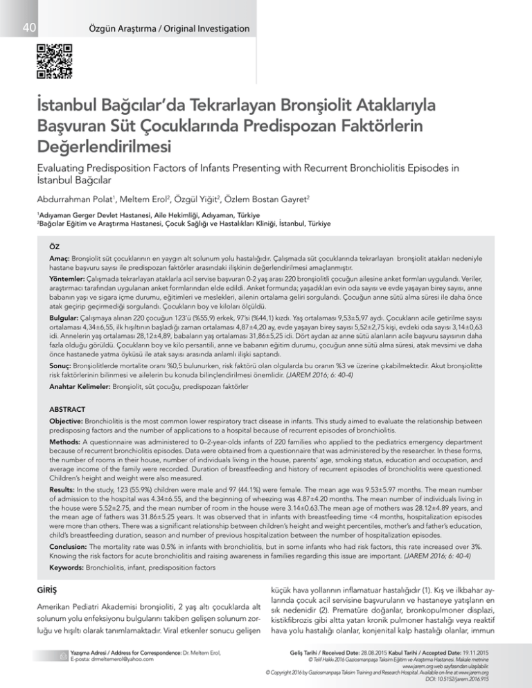 40 Özgün Araştırma / Original Investigation İstanbul Bağcılar’da Tekrarlayan Bronşiolit Ataklarıyla Başvuran Süt Çocuklarında Predispozan Faktörlerin Değerlendirilmesi Evaluating Predisposition Factors of Infants Presenting with Recurrent Bronchiolitis Episodes in İstanbul Bağcılar Abdurrahman Polat1, Meltem Erol2, Özgül Yiğit2, Özlem Bostan Gayret2 Adıyaman Gerger Devlet Hastanesi, Aile Hekimliği, Adıyaman, Türkiye Bağcılar Eğitim ve Araştırma Hastanesi, Çocuk Sağlığı ve Hastalıkları Kliniği, İstanbul, Türkiye 1 2 ÖZ Amaç: Bronşiolit süt çocuklarının en yaygın alt solunum yolu hastalığıdır. Çalışmada süt çocuklarında tekrarlayan bronşiolit atakları nedeniyle hastane başvuru sayısı ile predispozan faktörler arasındaki ilişkinin değerlendirilmesi amaçlanmıştır. Yöntemler: Çalışmada tekrarlayan ataklarla acil servise başvuran 0-2 yaş arası 220 bronşiolitli çocuğun ailesine anket formları uygulandı. Veriler, araştırmacı tarafından uygulanan anket formlarından elde edildi. Anket formunda; yaşadıkları evin oda sayısı ve evde yaşayan birey sayısı, anne babanın yaşı ve sigara içme durumu, eğitimleri ve meslekleri, ailenin ortalama geliri sorgulandı. Çocuğun anne sütü alma süresi ile daha önce atak geçirip geçirmediği sorgulandı. Çocukların boy ve kiloları ölçüldü. Bulgular: Çalışmaya alınan 220 çocuğun 123’ü (%55,9) erkek, 97’si (%44,1) kızdı. Yaş ortalaması 9,53±5,97 aydı. Çocukların acile getirilme sayısı ortalaması 4,34±6,55, ilk hışıltının başladığı zaman ortalaması 4,87±4,20 ay, evde yaşayan birey sayısı 5,52±2,75 kişi, evdeki oda sayısı 3,14±0,63 idi. Annelerin yaş ortalaması 28,12±4,89, babaların yaş ortalaması 31,86±5,25 idi. Dört aydan az anne sütü alanların acile başvuru sayısının daha fazla olduğu görüldü. Çocukların boy ve kilo persantili, anne ve babanın eğitim durumu, çocuğun anne sütü alma süresi, atak mevsimi ve daha önce hastanede yatma öyküsü ile atak sayısı arasında anlamlı ilişki saptandı. Sonuç: Bronşiolitlerde mortalite oranı %0,5 bulunurken, risk faktörü olan olgularda bu oranın %3 ve üzerine çıkabilmektedir. Akut bronşiolitte risk faktörlerinin bilinmesi ve ailelerin bu konuda bilinçlendirilmesi önemlidir. (JAREM 2016; 6: 40-4) Anahtar Kelimeler: Bronşiolit, süt çocuğu, predispozan faktörler ABSTRACT Objective: Bronchiolitis is the most common lower respiratory tract disease in infants. This study aimed to evaluate the relationship between predisposing factors and the number of applications to a hospital because of recurrent episodes of bronchiolitis. Methods: A questionnaire was administered to 0–2-year-olds infants of 220 families who applied to the pediatrics emergency department because of recurrent bronchiolitis episodes. Data were obtained from a questionnaire that was administered by the researcher. In these forms, the number of rooms in their house, number of individuals living in the house, parents’ age, smoking status, education and occupation, and average income of the family were recorded. Duration of breastfeeding and history of recurrent episodes of bronchiolitis were questioned. Children’s height and weight were also measured. Results: In the study, 123 (55.9%) children were male and 97 (44.1%) were female. The mean age was 9.53±5.97 months. The mean number of admission to the hospital was 4.34±6.55, and the beginning of wheezing was 4.87±4.20 months. The mean number of individuals living in the house were 5.52±2.75, and the mean number of room in the house were 3.14±0.63.The mean age of mothers was 28.12±4.89 years, and the mean age of fathers was 31.86±5.25 years. It was observed that in infants with breastfeeding time <4 months, hospitalization episodes were more than others. There was a significant relationship between children’s height and weight percentiles, mother’s and father’s education, child’s breastfeeding duration, season and number of previous hospitalization between the number of hospitalization episodes. Conclusion: The mortality rate was 0.5% in infants with bronchiolitis, but in some infants who had risk factors, this rate increased over 3%. Knowing the risk factors for acute bronchiolitis and raising awareness in families regarding this issue are important. (JAREM 2016; 6: 40-4) Keywords: Bronchiolitis, infant, predisposition factors GİRİŞ Amerikan Pediatri Akademisi bronşioliti, 2 yaş altı çocuklarda alt solunum yolu enfeksiyonu bulgularını takiben gelişen solunum zorluğu ve hışıltı olarak tanımlamaktadır. Viral etkenler sonucu gelişen Yazışma Adresi / Address for Correspondence: Dr. Meltem Erol, E-posta: [email protected] küçük hava yollarının inflamatuar hastalığıdır (1). Kış ve ilkbahar aylarında çocuk acil servisine başvuruların ve hastaneye yatışların en sık nedenidir (2). Prematüre doğanlar, bronkopulmoner displazi, kistikfibrozis gibi altta yatan kronik pulmoner hastalığı veya reaktif hava yolu hastalığı olanlar, konjenital kalp hastalığı olanlar, immun Geliş Tarihi / Received Date: 28.08.2015 Kabul Tarihi / Accepted Date: 19.11.2015 © Telif Hakkı 2016 Gaziosmanpaşa Taksim Eğitim ve Araştırma Hastanesi. Makale metnine www.jarem.org web sayfasından ulaşılabilir. © Copyright 2016 by Gaziosmanpaşa Taksim Training and Research Hospital. Available on-line at www.jarem.org DOI: 10.5152/jarem.2016.915 Polat ve ark. Bronşiolitte Predispozan Faktörler. JAREM 2016; 6: 40-4 yetmezlik ve immunsupresyon durumları, Down sendromu ana risk faktörlerini oluştururken, altı aylıktan küçük infantlar, sigaraya maruziyet, atopi öyküsü, malnütrisyon ve düşük doğum ağırlığı, erkek cinsiyet, düşük sosyoekonomik durum, kalabalık yaşam ortamları ise ek risk faktörlerini oluşturmaktadır (3, 4). Olguların çoğunda hastalığın