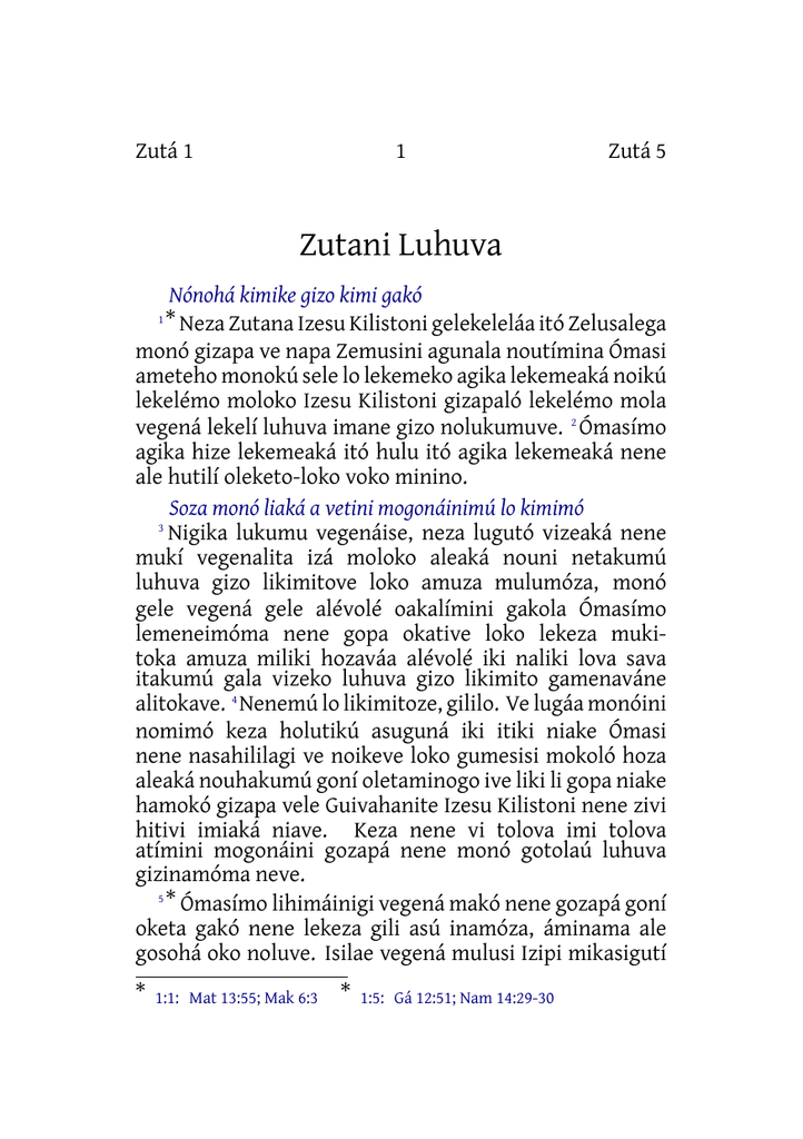 Zutá 1 1 Zutá 5 Zutani Luhuva Nónohá kimike gizo kimi gakó * Neza Zutana Izesu Kilistoni gelekeleláa itó Zelusalega monó gizapa ve napa Zemusini agunala noutímina Ómasi ameteho monokú sele lo lekemeko agika lekemeaká noikú lekelémo moloko Izesu Kilistoni gizapaló lekelémo mola vegená lekelí luhuva imane gizo nolukumuve. 2 Ómasímo agika hize lekemeaká itó hulu itó agika lekemeaká nene ale hutilí oleketo-loko voko minino. Soza monó liaká a vetini mogonáinimú lo kimimó 3 Nigika lukumu vegenáise, neza lugutó vizeaká nene mukí vegenalita izá moloko aleaká nouni netakumú luhuva gizo likimitove loko amuza mulumóza, monó gele vegená gele alévolé oakalímini gakola Ómasímo lemeneimóma nene gopa okative loko lekeza mukitoka amuza miliki hozaváa alévolé iki naliki lova sava itakumú gala vizeko luhuva gizo likimito gamenaváne alitokave. 4 Nenemú lo likimitoze, gililo. Ve lugáa monóini nomimó keza holutikú asuguná iki itiki niake Ómasi nene nasahililagi ve noikeve loko gumesisi mokoló hoza aleaká nouhakumú goní oletaminogo ive liki li gopa niake hamokó gizapa vele Guivahanite Izesu Kilistoni nene zivi hitivi imiaká niave. Keza nene vi tolova imi tolova atímini mogonáini gozapá nene monó gotolaú luhuva gizinamóma neve. 5* Ómasímo lihimáinigi vegená makó nene gozapá goní oketa gakó nene lekeza gili asú inamóza, áminama ale gosohá oko noluve. Isilae vegená mulusi Izipi mikasigutí 1 * 1:1: Mat 13:55; Mak 6:3 * 1:5: Gá 12:51; Nam 14:29-30 Zutá 6 2 Zutá 11 gologí okimiake, alika aikumú gili alévolé ama vegená ahulokimikago, lapuluva amóma neve. 6 Itó ageló makó keza gizapa hozanini ahuliake numuni apáini ahuliake, keza gamena napaló lihimáini alita gamenámini ageváa iki minanigi alévolé seni nagá nenémo ale gikitoake límugusitunú asapú oketamó neve. 7 * Itó Soto itó Gomola itó apá luga luga minoloko vitó mina vegená keza ámináminiki gopa iki gumesisi mokoló netá itó musi netá ali utó milikago, ló sipisi alévolé oko minoakalíminigú ahulokimikago miniki niave. Nene ánigokuko lelegesá ligitive loko némini oketamó nenazo, nenemú lakagatí molamino. 8 Itó soza monó liaká nia ve keza ámina iki vamó ánigunimole liki kugupetunú musi netá aliaká niave. Lá niake kugulizaki ve alivi galativi iki lapanáiki ve ageló nene ali mumusopa ziaká niave. 9 * Agelolitini ve uvóipo Maikolí nene soza monó liaká vegitana minamive. Eza Moseni gonosiváamú éaho alitihe liki Sataki gakotunú lova ikasike pelesa alesa zesike, Satani gakó golesa lotanogo gilimó nene gena okago, Guivahanímo gahá giminogo ive lokogó lo amimóza, 10 soza monó liaká ve imane keza gili guni ama netakumú alivi letivi iki miniaká niave. Iza galagitana lilí iake kugupémo amu heleaká noi netakumú hanuva kigikatunú giliake, gili guni ina netalímo kelémo golesa okago lapuluva iaká niave. 11 * Agae, keza miniki nana itamó neve. Keza Kaí vi gapogú viaká niave. Itó moni henokanonimú lagaváa ali miniki soza monó loaká ve Palámini gapogú viaká niave. Itó Kolá eza Ómasímo kelémo etó i gizapa vemú pelevesava zekamole loko lapuluva imómáminiki hokolizá iiki lapuluva inigave. * * 1:7: Apí 19:1-24 * 1:9: Tan 10:13,21, 12:1; Ali 12:7; Gapo 34:6; Zak 3:2 1:11: Apí 4:3-8; Nam 22:1-35; Nam 16:1-35 Zutá 12 3 Zutá 16 Lekeza monokumule liki ali nupa iki nosánetá ninató nene ve nenémináa keza iza nosánetakumú ahuu ahuu liki gihúme kovoza helemimó kezáinimukó ali napa napa iki niave. Monóini nomi vegená keza nene gó zihe zihe liki límusi nene hanuva hepelímo se ahulokago voko golini zemoko haha oaká noimó, itó za makolímo nugunugu loko itekoko gihila zeaká gamenaló nene gihila zesá amimó nenéminiki niave. Ve nenémináa hili vamó keza asuto ahuloakató niave. 13 Age nagamí amuzavagi valahuká zeko gituhú galakalá golotuvagi utó oaká noive. Soza monó liaká ve nenémináatini golesa netáini avozavagi nenémini oko utó oaká noive. Sonohí lugáa keza atohimí ziaká niamó nenete gapo lelepizeminigave. Soza monó liaká ve sonohí nenémini iki nia ve nene límugusi lapalapava alévoleláa nene Ómasímo ale vavá oketonoimóma neve. 14 * Atatokatí utó iliki va vegená 5 utó ikago, alika ve nampa 7 Enokú utó imó. Áisi nene ámina soza monó liaká ve utó itakumú láa loko limó: Gililo. Guivahanímo apazá ageló vegenala mulusi napa tausen mukí kelémoko anogo ive. 15 Lá okoko vegená mukitoka mogonáini lo utó moloko hokolizató vegená monóini nomimoláa keí hokolizáinímini mogonáa apasoko lihimaváa kiminogo ive. Itó hokolizató ve monóini nomimó keza Ómasimú alivi letivi iki gakó golesa litamómámini lihimaváa kiminogo ive loko limó neve. 16 Ve nenémináa keza géneka háneka lake gínikaha gánakaha iki kugupémo amu heleaká noi netá aliki nenegú minake kezáinimú ali nupa napa iki nimina ve keza vegená lugáate netá matá limitave liki kegepoka liki giminikú miliká aliká iaká niave. 12 Kagata alike gakó loketamó * 1:14: Apí 5:18,21-24 Zutá 17 4 Zutá 25 Nigika lukumu vegenáise, lekeza gozapá Guivahanite Izesu Kilistoni aposolote li lekeme gakó giliki minalo. 18 * Keza nene gamena napa alitokiko, gumesisi mokoló hozáinimú amuza miliaká nia ve utó iiki monotinimú alivi letivi ilikitatave liki li kimiaká amóma neve. 19 Ve nenémináate hizi hoú liaká netá ali utó miliaká niave. Ómasímini Sikalahú mulúikú minamigo mikasigú mogonamú giliaká niave. 20 Lá iki niamóza, nigika lukumu vegenáise, lekeza apazá monotini gihiláa nenémo likigika loló okiko alévolé iliki itiki minalo. Sikalahulímo lekelémo vávani noiko numuna liki minalo. 21 Lá niiki Guivahanite Izesu Kilistó eza geha ze lekemeko alévolé oko minoaká netá lehizeleketatikumú ageva iki niminiki Ómasímo agika lekemeaká noikú minalo. 22 Monó alitupe alemitupe liake, ligitagani ivamoláamú likigika hizi kimilo. 23 Lokú