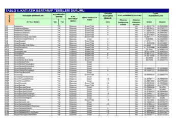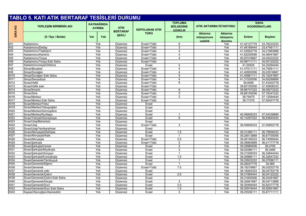 SIRA NO TABLO 5. KATI ATIK BERTARAF TESİSLERİ DURUMU KI1 KI2 KI3 KI4 KI5 KI6 KI7 KI8 KI9 KI10 KI11 KI12 KI13 KI14 KI15 KI16 KI17 KI18 KI19 KI20 KI21 KI22 KI23 KI24 KI25 KI26 KI27 KI28 KI29 KI30 KI31 KI32 KI33 KI34 KI35 KI36 KI37 KI38 KI39 KI40 KI41 KI42 KI43 YERLEŞİM BİRİMİNİN ADI (İl / İlçe / Belde) Kastamonu Kastamonu/Daday Kastamonu/TaĢköprü Kastamonu/Hanönü Kastamonu/Tosya Kastamonu/Tosya Eski Saha Kastamonu/osya/Ortalıca Sinop/Boyabat Sinop/Durağan Sinop/Durağan Eski Saha Sinop/Saraydüzü Sivas/Hafik Sivas/Hafik eski Sivas/Ġmranlı Sivas/Zara Sivas/Merkez Sivas/Merkez Eski Saha Sivas/Merkez/Yıldız Sivas/Merkez/Yakupoğlan Sivas/Merkez/GümüĢdere Sivas/Merkez/Kurtlapa Sivas/Yıldızeli/Güneykaya Sivas/UlaĢ/Baharözü Sivas/UlaĢ Sivas/UlaĢ/Yenikarahisar Sivas/Altınyayla/Deliilyas Sivas/Altınyayla/Kale Sivas/Altınyayla Sivas/ġarkıĢla Sivas/ġarkıĢla/Cemel Sivas/ġarkıĢla/AkçakıĢla Sivas/ġarkıĢla/Gürçayır Sivas/ġarkıĢla/KızılcakıĢla Sivas/Gemerek/Yenibuçuk Sivas/Gemerek/Eğerci Sivas/Gemerek Sivas/Gemerek eski Sivas/Gemerek/Çebni Sivas/Gemerek/Çebni Eski Saha Sivas/Gemerek/ĠnkıĢla Sivas/Gemerek/Sızır Sivas/Gemerek/Sızır Eski Saha Kayseri/Sarıoğlan/Alameddin KAYNAĞINDA AYIRMA Var Yok Yok Yok Yok Yok Yok Yok Yok Yok Yok Yok Yok Yok Yok Yok Yok Yok Yok Yok Yok Yok Yok Yok Yok Yok Yok Yok Yok Yok Yok Yok Yok Yok Yok Yok Yok Yok Yok Yok Yok Yok Yok Yok Yok ATIK BERTARAF ŞEKLİ DEPOLANAN ATIK TÜRÜ Düzensiz Düzensiz Düzensiz Düzensiz Düzensiz Düzensiz Düzensiz Düzensiz Düzensiz Düzensiz Düzensiz Düzensiz Düzensiz Düzensiz Düzensiz Düzensiz Düzensiz Düzensiz Düzensiz Düzensiz Düzensiz Düzensiz Düzensiz Düzensiz Düzensiz Düzensiz Düzensiz Düzensiz Düzensiz Düzensiz Düzensiz Düzensiz Düzensiz Düzensiz Düzensiz Düzensiz Düzensiz Düzensiz Düzensiz Düzensiz Düzensiz Düzensiz Düzensiz Evsel+Tıbbi Evsel+Tıbbi Evsel+Tıbbi Evsel+Tıbbi Evsel+Tıbbi Evsel+Tıbbi Evsel Evsel+Tıbbi Evsel+Tıbbi Evsel+Tıbbi Evsel+Tıbbi Evsel+Tıbbi Evsel+Tıbbi Evsel+Tıbbi Evsel+Tıbbi Evsel+Tıbbi Evsel+Tıbbi Evsel Evsel Evsel Evsel Evsel Evsel Evsel+Tıbbi Evsel Evsel Evsel Evsel+Tıbbi Evsel+Tıbbi Evsel Evsel Evsel Evsel Evsel Evsel Evsel+Tıbbi Evsel Evsel Evsel Evsel Evsel Evsel Evsel TOPLAMA BÖLGESİNE UZAKLIK (km) 6 3 4 4 4 2 4 4 5 4 6 8 5 2 1 6 3 1.5 1 2.5 5 4 3 1 1.5 1 1 7.5 2.5 3 2.5 1.5 3 ATIK AKTARMA İSTASYONU Aktarma istasyonuna uzaklık Aktarma istasyonu durumu Yok Yok Yok Yok Yok Yok Yok Yok Yok Yok Yok Yok Yok Yok Yok Yok Yok Yok Yok Yok Yok Yok Yok Yok Yok Yok Yok Yok Yok Yok Yok Yok Yok Yok Yok Yok Yok Yok Yok Yok Yok Yok Yok SAHA KOORDİNATLARI Enlem Boylam 41,42127778 41,46169444 41,53952778 41,62230556 40,97016667 40,99711111 41,05525 41,47511111 41,40955556 41,40861111 41,31530556 39,8585 39,83105556 39,86747222 39,88155556 39,79475 39,77375 33,76233333 33,47461111 34,21963889 34,48441667 34,04222222 34,05122222 34,25294444 34,75061111 35,03516667 35,10241667 34,85288889 37,43402778 37,40808333 38,09272222 37,78347222 37,12594444 37,05427778 40,06808333 40,14297222 37,04338889 36,83644444 39,45608333 37,05952778 39,31286111 39,28013889 39,26158333 39,38963889 39,29980556 39,52086111 39,31508333 39,29986111 39,22622222 39,26027778 39,18216667 39,18283333 39,31994444 39,31830556 39,32841667 39,30494444 39,30919444 39,25536111 36,79658333 36,67705556 36,74069444 36,41177778 36,4705 36,3485 36,34844444 36,32647222 36,07086111 35,965 36,03252778 36,05752778 36,04122222 36,04391667 36,04713889 35,92377778 35,92941667 35,87711111 SIRA NO TABLO 5. KATI ATIK BERTARAF TESİSLERİ DURUMU KI44 KI45 KI46 KI47 KI48 KI49 KI50 KI51 KI52 KI53 KI54 KI55 KI56 KI57 KI58 KI59 KI60 KI61 KI62 KI63 KI64 KI65 KI66 KI67 KI68 KI69 KI70 KI71 KI72 KI73 KI74 KI75 KI76 KI77 KI78 KI79 KI80 KI81 KI82 KI83 KI84 KI85 KI86 YERLEŞİM BİRİMİNİN ADI (İl / İlçe / Belde) Kayseri /Sarıoğlan / Gaziler Kayseri/Sarıoğlan / Karaözü Kayseri / Felahiye Kayseri / Felahiye /Kayapınar Kayseri /Felahiye/ Büyüktoraman Kayseri / Özvatan Kayseri / Özvatan Kayseri / Özvatan / Küpeli Kayseri /Sarıoğlan Kayseri / Kocasinan / Himmetdede Kayseri / Kocasinan / Düver Kayseri / Sarıoğlan/ Çiftlik Kayseri / AkkıĢla / Gömürgen Kayseri / AkkıĢla Kayseri / akkıĢla / Kululu Kayseri / Bünyan / Koyunabdal Kayseri /Bünyan/Büyüktuzhisar Kayseri / Sarıoğlan / Palas Kayseri / Bünyan / Karakaya Kayseri / Melikgazi / Ağırnas Kayseri / Bünyan Kayseri / Bünyan / Güllüce Kayseri / Bünyan / Yeni süksün Kayseri / Develi / Sidelhöyük Kayseri / YeĢilhisar NevĢehir / Ürgüp / BaĢdere NevĢehir / Ürgüp / MustafapaĢa NevĢehir / Merkez/Göre NevĢehir / Merkez / Kaymaklı NevĢehir / Ürgüp Kayseri/ Kocasinan/ Yemliha Kayseri /Merkez Kayseri /Merkez Eski Saha Kayseri /Develi Kayseri / Develi / Gazi Kayseri / Yahyalı / Derebağ NevĢehir/Merkez/Sulusaray NevĢehir /Merkez /Çat NevĢehir / Acıgöl / Karapınar NevĢehir / Acıgöl NevĢehir / acıgöl / Ġnallı NevĢehir / GülĢehri/ Ovaören NevĢehir / Acıgöl / Tatların KAYNAĞINDA AYIRMA Var Yok Yok Yok Yok Yok Yok Yok Yok Yok Yok Yok Yok Yok Yok Yok Yok Yok Yok Yok Yok Yok Yok Yok Yok Yok Yok Yok Yok Yok Yok Yok Yok Yok Yok Yok Yok Yok Yok Yok Yok Yok Yok Yok Yok ATIK BERTARAF ŞEKLİ DEPOLANAN ATIK TÜRÜ Düzensiz Düzensiz Düzensiz Düzensiz Düzensiz Düzensiz Düzensiz Düzensiz Düzensiz Düzensiz Düzensiz Düzensiz Düzensiz Düzensiz Düzensiz Düzensiz Düzensiz Düzensiz Düzensiz Düzensiz Düzensiz Düzensiz Düzensiz Düzensiz Düzensiz Düzensiz Düzensiz Düzensiz Düzensiz Düzensiz Düzensiz Düzensiz Düzensiz Düzensiz Düzensiz Düzensiz Düzensiz Düzensiz Düzensiz Düzensiz Düzensiz Düzensiz Düzensiz Evsel Evsel Evsel+Tıbbi Evsel Evsel Evsel+Tıbbi Evsel+Tıbbi Evsel Evsel+Tıbbi Evsel Evsel Evsel Evsel Evsel+Tıbbi Evsel Evsel Evsel Evsel Evsel Evsel Evsel+Tıbbi Evsel Evsel Evsel Evsel+Tıbbi Evsel Evsel Evsel Evs