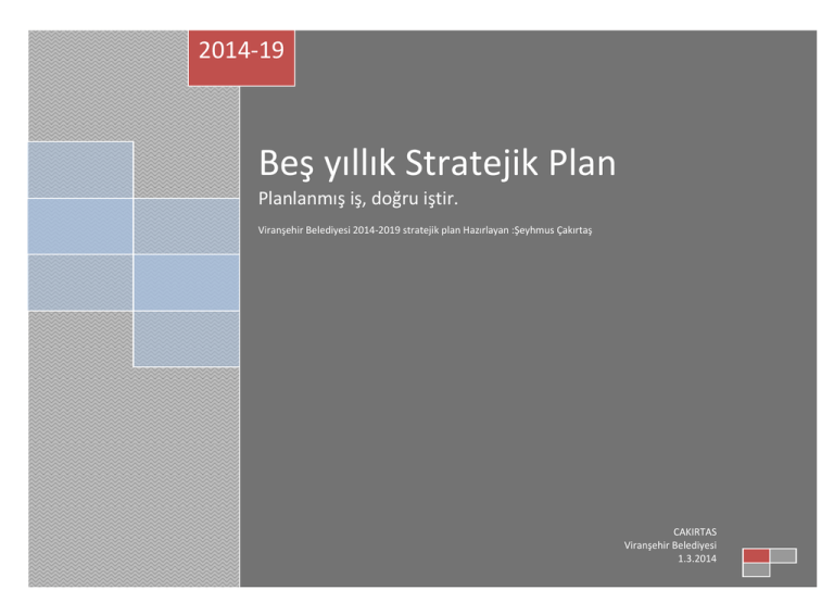 2014-19 Beş yıllık Stratejik Plan Planlanmış iş, doğru iştir. Viranşehir Belediyesi 2014-2019 stratejik plan Hazırlayan :Şeyhmus Çakırtaş CAKIRTAS Viranşehir Belediyesi 1.3.2014 Sunu “Stratejik Plan” kurum ve kuruluşların, bir yandan görevlerini daha etkin şekilde yerine getirirken, diğer yandan da geleceğe en etkin biçimde hazırlanmaları amacına yönelik geleceği planlama ve bir yönetim modelidir. Belediyeleri kentsel ve demokratik dönüşümün en önemli itici güçlerinden biri olarak ele alan bir yaklaşım ile hazırlanmış olan “Stratejik Yönetim Projesi”, Viranşehir Belediyesi’nin kendine has kurumsal gelişim modelini oluşturması, modelin etkin biçimde işletilmesi ve giderek başka kurumlara da örnek ve destek olacak boyutlara ulaşması” amaçlarını taşımaktadır. Stratejik Plan belediye paydaşlarının ve üst-orta düzey yöneticilerin katılımı ile oluşturulacak ve önemli stratejilerin belirlenmesine ve eylem planlarının hazırlanmasına katkı sağlayacaktır. Stratejik Yönetim Projesi” önceki yılların deneyimi gözetilerek, deneyimlerden yararlanılarak 15 Nisan 2014 tarihinde “Paydaş Beklentilerinin Belirlenmesi Toplantısı” ile başlamış olup, 30 Ağustos 2014 tarihinde sonlanmıştır. Projenin ilk aşaması olan “Stratejik Planın Hazırlanması”na yönelik çalışmalar, Viranşehir Belediyesi adına belediyemizin ekonomist kadrosunda çalışan ve aynı zamanda Belediye Başkan Yardımcısı Şeyhmus Çakırtaş öncülüğünde başlanılmış ve belediye başkanımızın başkanlığında belediye birim müdürlerinden oluşturulan 4 kişilik “Planlama Takımı” ile yürütülmüştür. Planlama Takımı 1.Belediye Başkanı Emrullah Cin/ Eş Başkan Filiz Yılmaz 2.Belediye Başkan Yardımcısı Şeyhmus Çakırtaş 3.Sosyolog/Kültür ve Sosyal İşler Md Suar Uzun 4.Hesap İşleri Müdürü İlhan Akbaş 5 Bilgisayar Teknikeri İsmail Çetinkaya Projede planlanan ana faaliyet adımları aşağıda özetlenmiştir: A. Stratejik Planın Hazırlanması 1.Paydaş Beklentilerinin Belirlenmesi : Bu çalışmanın amacı paydaşların başlatılan projeden haberdar olması ve Viranşehir Belediyesi’nden beklentilerin belirlenmesidir. 2. Stratejik Planlamanın Planlanması 3. Stratejik Yönetim Eğitimleri 4. Stratejik Modelleme 2 Misyonun belirlenmesi Vizyonun belirlenmesi Kurumsal performans ölçülerinin belirlenmesi Kurumsal performans ölçüleri ile misyon, vizyon ve değerler arasındaki ilişkinin kurulması Stratejik amaçların belirlenmesi Stratejilerin belirlenmesi Stratejik hedeflerin belirlenmesi 5. Mevcut Durum Analizi Kurumsal yapının analizi Paydaş görüşlerinin alınması Çevre analizi SWOT analizi Kurumsal performans ölçülerininin belirlenmesi ve son beş yıllık verilerinin analizi 6. Strateji Geliştirme 7. Operasyonel Planlama Öncelikli stratejilere karar verilmesi Öncelikli stratejiler için eylem planlarının hazırlanması Eylem planlarının konsolidasyonu B. Performans Esaslı Bütçeleme Tüm faaliyetler için kaynak ihtiyaç analizinin yapılması Gerekli verilerin toplanması Kaynak ihtiyaç analizi ile bütçe ilişkisinin kurulması C. Stratejik Planın Hayata Geçirilmesi 3 Proje kapsamında kapsamında gerçekleştirilen faaliyetler Tablo 1’de özetlenmiştir. Tablo 1. Proje Kapsamında Gerçekleştirilen Faaliyetler Tarih Faaliyet O7 Nisan 2014 Paydaş Beklentilerinin Belirlenmesi Toplantısı Viranşehir İlçesi’nin Güçlü Alanları Viranşehir İlçesinin Gelişmeye Açık Alanları Viranşehir İlçesi’nin Fırsatları Viranşehir İlçesinin Tehditleri Viranşehir İlçesi’nin Gelişimini Sağlayacak Öneriler 14-15 Nisan 2014 19-20 Nisan 2014 Stratejik Yönetim Eğitimi 1 Stratejik Yönetim Eğitimi 2 Paydaş Çalışması Ürün – Hizmet Çalışması Misyon Çalışması Vizyon Çalışması Stratejik Amaçlar Çalışması Performans Ölçüleri Çalışması Tablo 1. Proje Kapsamında Gerçekleştirilen Faaliyetler (Devam) Tarih Faliyetler Faaliyet Çıktısı Stratejik PlandaYer Aldığı bölüm 4 Mali Sonuçlar Personel Durumu İnsan Kaynakları Finansman Kaynakları Bilgi İletişim Teknolojilerinin Kullanımı ve Bu Teknolojilere İlişkin Altyapı Nisan 30 Mayıs 2014 Kurumsal Yapının Analizi Stratejik Amaçların Performans Ölçülerinin Son 5 yıllık Verileri 22 Mayıs 2014 Temel Girdilerin Belirlenmesi 05 Haziran 2014 Misyon ve Vizyonun Performans Ölçülerinin Belirlenmesi Araç, Bina ve Diğer Varlıklar Mevcut Raporlama ve İş Takip Sistemi Mütahitlerin Performansının Ölçülmesi İşbirliklerin Sayısı ve Yarattığı Katma Değer Konusu Gerçekleştirilen ve Yürütülmekte Olan Önemli Faaliyet ve Projeler Stratejik Amaçların Son 5 Yıllık Verileri Misyona Son Halinin Verilmesi Vizyona Son Halinin Verilmesi Paydaşlar ve yararlayıcılar Ürün – Hizmet Matrislerinin Konsolidasyonu Misyona Dair Performans Ölçüleri Vizyona Dair Performans Ölçüleri 5 Tablo 1. Proje Kapsamında Gerçekleştirilen Faaliyetler (Devam) Tarih Faaliyet Faaliyet Çıktısı 28 Nisan 2014 Paydaş Analizinin Yapılması Nihai Paydaşlar – Yararlayıcılar Listesi Nihai hizmet – Hizmetler Listesi Paydaş Analizi 01 Mayıs 2014 Misyon ve Vizyonun Performans Ölçüleri Bilgilerinin Elde Edilmesi Misyona İlişkin Performans Ölçüleri Bilgileri Vizyona İlişkin Performans Ölçüleri Bilgileri 12 Mayıs 2014 Çevre Analizi SWOT Analizi PEST Analizi SWOT Analizi Nisan- Mayıs 2014 Paydaş Görüşmeleri Paydaşlarla Görüşme Sonuçları 29 Mayıs 2014 Stratejik Amaçların Belirlenmesi Stratejik Amaçlar Çalışması Stratejiler Çalışması Faaliyetler Çalışması 6 Tablo 1. Proje Kapsamında Gerçekleştirilen Faaliyetler (Devam) Tarih Faaliyet Faaliyet Çıktısı 22 Nisan 2014 Norm Kadronun inceleme çalışması Fen İşleri Müdürlüğü 14 – 16 Mayıs 2014 29– 30 Mayıs 2014 Norm Kadronun 