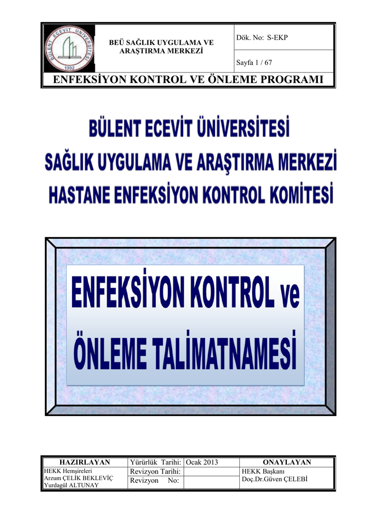 BEÜ SAĞLIK UYGULAMA VE ARAŞTIRMA MERKEZİ Dök. No: S-EKP Sayfa 1 / 67 ENFEKSİYON KONTROL VE ÖNLEME PROGRAMI HAZIRLAYAN HEKK Hemşireleri Arzum ÇELİK BEKLEVİÇ Yurdagül ALTUNAY Yürürlük Tarihi: Ocak 2013 Revizyon Tarihi: Revizyon No: ONAYLAYAN HEKK Başkanı Doç.Dr.Güven ÇELEBİ BEÜ SAĞLIK UYGULAMA VE ARAŞTIRMA MERKEZİ Dök. No: S-EKP Sayfa 2 / 67 ENFEKSİYON KONTROL VE ÖNLEME PROGRAMI Bu talimatların hazırlanmasına katkı sağlayan HEKK üyeleri ve Öğretim Üyeleri Doç. Dr. Güven ÇELEBİ HEKK Başkanı, Enfeksiyon Hast. ve Klinik Mikrobiyoloji AD. Doç. Dr. Nihal PİŞKİN Enfeksiyon Hast. ve Klinik Mikrobiyoloji AD. Doç. Dr. Canan KÜLAH Tıbbi Mikrobiyoloji AD. Hemş. Yurdagül ALTUNAY HEKK Hemşiresi Hemş. Arzum ÇELİK BEKLEVİÇ HEKK Hemşiresi Doç. Dr. Ethem PİŞKİN Çocuk Sağlığı ve Hastalıkları AD. Doç. Dr. Mehmet Ali KURÇER Halk Sağlığı AD. Yrd. Doç. Dr. Berrak GÜVEN Tıbbi Biyokimya AD. Ecz. Candan DALKILIÇ Eczacı Hemş. Ayşegül SALCI KELEŞ Hemş.Hizm.Müd.Yrd. HAZIRLAYAN HEKK Hemşireleri Arzum ÇELİK BEKLEVİÇ Yurdagül ALTUNAY Yürürlük Tarihi: Ocak 2013 Revizyon Tarihi: Revizyon No: ONAYLAYAN HEKK Başkanı Doç.Dr.Güven ÇELEBİ BEÜ SAĞLIK UYGULAMA VE ARAŞTIRMA MERKEZİ Dök. No: S-EKP Sayfa 3 / 67 ENFEKSİYON KONTROL VE ÖNLEME PROGRAMI İÇİNDEKİLER 1. Enfeksiyon Kontrol Komitesi Çalışma Talimatı 2. Sürveyans Yöntemi ve Kapsamı Talimatı 3. Salgın İnceleme Talimatı 4. El Hijyeni Talimatı 5. Hastane Temizliği Prosedürü 6. Dezenfeksiyon-Sterilizasyon Talimatı 7. İzolasyon Önlemleri Talimatı 8. Tıbbi Atık Yönetimi Prosedürü 9. Antibiyotik Kontrolü Talimatı 10. Cerrahi Birimlerde Antibiyotik Profilaksi Talimatı 11. Cerrahi Alan Enfeksiyonlarından Korunma Talimatı 12. Kan Kültürü Alınması Prosedürü 13. Damar içi Katater Uygulama Talimatı 14. İdrar Kateteri Uygulama ve İdrar Kültürü Alma Talimatı 15. Nozokomiyal Pnomoninin Önlenmesi Talimatı 16. Ventilatörle İlişkili Pnömoninin Önlenmesi Talimatı 17. Çok İlaca Dirençli Bakteri Kontrolü Talimatı 18. Yoğun Bakım Ünitelerine Giriş Kuralları Talimatı 19. Ameliyathanede Alet Yıkama ve Bakım Talimatı 20. Ameliyathanede Kılık-Kıyafet Talimatı 21. Acil Serviste Enfeksiyon Kontrolü Talimatı 22. Bronkoskopik Aletlerin Dezenfeksiyon Talimatı 23. Tüberkülozdan Korunma Talimatı 24. Çok İlaca Dirençli Tüberküloz Hastalarının Bulunduğu Servislerde Enfeksiyon Kontrolü Talimat 25. Kanamalı Hastaların Kontrolü Talimatı 26. Kan Transfüzyonu Talimatı 27. İshalli Hastalarda Enfeksiyon Kontrol Talimatı 28. Laboratuarlarda Enfeksiyon Kontrol Talimatı 29. Çamaşır Yıkama Talimatı 30. Mutfak Sanitasyonu ve Gıdaların Hazırlanması Talimatı 31. Morg Temizliği Talimatı 32. Oyuncakların Temizliği Talimatı 33. Yapım Onarım Çalışmalarında Enfeksiyon Kontrol Talimatı 34. Personel Sağlığı Talimatı 35. Personel Yaralanmalarında İzlenecek Yol Talimatı 36. Enfeksiyon Kontrolü Eğitim Talimatı HAZIRLAYAN HEKK Hemşireleri Arzum ÇELİK BEKLEVİÇ Yurdagül ALTUNAY Yürürlük Tarihi: Ocak 2013 Revizyon Tarihi: Revizyon No: 1 7 8 10 12 16 21 25 29 30 31 33 34 35 37 39 41 42 43 44 45 47 48 49 50 52 53 54 55 56 58 59 60 61 62 64 ONAYLAYAN HEKK Başkanı Doç.Dr.Güven ÇELEBİ BEÜ SAĞLIK UYGULAMA VE ARAŞTIRMA MERKEZİ Dök. No: S-EKP Sayfa 4 / 67 ENFEKSİYON KONTROL VE ÖNLEME PROGRAMI 1-ENFEKSİYON KONTROL KOMİTESİ ÇALIŞMA TALİMATI Enfeksiyon Kontrol Komitesinin Teşkili, Çalışma Şekli, Görev, Yetki, Sorumlulukları ve Faaliyet Alanları ENFEKSİYON KONTROL KOMİTESİNİN TEŞKİLİ Madde 4— Enfeksiyon kontrol komitesi aşağıdaki üyelerden oluşur: a) Başhekim yardımcısı veya dekan yardımcısı, b) Enfeksiyon hastalıkları ve klinik mikrobiyoloji anabilim dalı öğretim üyesi, c) Çocuk enfeksiyon hastalıkları öğretim üyesi, yoksa çocuk sağlığı ve hastalıkları anabilim dalı öğretim üyesi, d) Dahili tıp bilim dallarından tercihen iç hastalıkları anabilim dalı öğretim üyesi, e) Cerrahi tıp bilim dallarından tercihen genel cerrahi anabilim dalı öğretim üyesi, f) Tıbbi mikrobiyoloji anabilim dalı öğretim üyesi, g) Başhemşire veya hemşirelik hizmetleri müdürü / müdür yardımcısı, h) Enfeksiyon kontrol hekimi, i) Enfeksiyon kontrol hemşiresi / hemşireleri, j) Eczane sorumlusu, k) Hastane müdürü, (b) ve (h) bentlerinde belirtilen görevler aynı kişi tarafından yürütülebilir. Yataklı tedavi kurumunun şartlarına ve karşılaştığı problemlere göre, enfeksiyon kontrol komitesinin önerileri doğrultusunda, yönetim tarafından, anabilim dalı başkanları, ünite sorumluları ve idari birim temsilcileri de enfeksiyon kontrol komitesinde görevlendirilebilir. Bu üyeler, ilgili bölümlerin görüşü de alınmak suretiyle, tercihen hastane enfeksiyonları konusunda eğitim almış olan personel arasından seçilir. Enfeksiyon kontrol komitesinin fiziki mekan, bilgisayar, teknik donanım, araç-gereç, sarf malzemeleri ve personel gibi ihtiyaçları, yataklı tedavi kurumunun imkanları ölçüsünde, Yönetim tarafından karşılanır. ÇALIŞMA ŞEKLİ Madde 5 — Enfeksiyon kontrol komitesi, enfeksiyon kontrolünde en üst karar organı olarak çalışır ve düzenli olarak yılda en az üç defa toplanır. Enfeksiyon kontrol komitesinin üyeleri üç yıl süre ile görevlendirilir. Enfeksiyon kontrol komitesi başkanlığını, enfeksiyon hastalıkları ve klinik mikrobiyoloji anabilim dalı temsilcisi yürütür. Enfeksiyon hastalıkları ve klinik mikrobiyoloji kliniği veya anabilim dalı temsilcisinin katılamadığı toplantılarda başkanlık görevini komitede görevli başhekim yardımcısı veya dekan yardımcısı yürütür. Enfeksiyon kontrol komitesinin üyeleri, enfeksiyon kontrol ekibi tarafından hazırlanan ve kendilerine önceden sunulan gündemi görüşmek üzere toplanır. Toplan
