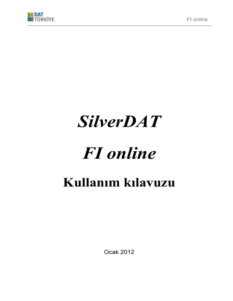 FI online SilverDAT FI online Kullanım kılavuzu Ocak 2012 © DAT GmbH Ocak 2012 Sayfa 1 / 35 FI online - İçindekiler – 1. ..................................................................................................................Genel Bilgiler 2. ................................................................................ SilverDAT FI online sistemine giriş 3. ............................................................................................................. İşlem görünümü 4. .................................................................................................................. Şirket verileri 5. ............................................................................................................................Ayarlar 6. ........................................................................................................... Hesaplama işlemi 7. ....................................................................... Raporun görüntülenmesi ve yazdırılması © DAT GmbH Ocak 2012 Sayfa 2 / 35 FI online 1. Genel bilgiler FI online sistemiyle onarım giderlerinin hesaplanması orijinal yedek parçalar (numaralar ve fiyatlar) ve üreticinin ya da distribütörün çalışma referans değerleri temelinde yapılır; burada farklı süre ölçü sistemleri saat bazlı bir sisteme çevrilir. Boya giderlerini tespit etmek için DAT-Eurolack sistemi kullanılır. Araç ve donanımı tanımı, otomatik bir VIN sorgusu üzerinden şasi numarası temelinde yapılır. VIN bilgileri yoksa, araç ve donanım tanımı manuel de yapılabilir. Sistem gereksinimleri Donanım 1 GHz İşlemci 256 MB RAM 1024x768 Pixel 65536 renk destekli Grafikkartı ve Monitör Internet erişimi Yazılım Microsoft Windows XP ve üstü İnternet Tarayıcısı Microsoft Internet Explorer Versiyon 7 ve üstü Mozilla Firefox Version 3.5 ve üstü Ek yazılım Adobe Flash-Player Version 10.00 Not: Gerekli tarayıcı ayarları *JavaScript aktif olmalı *Çerezlere izin verilmiş olmalı *Güvenlik etki alanı www.dat.de için minimum düzeyde ayarlanmalı © DAT GmbH Ocak 2012 Sayfa 3 / 35 FI online 2. SilverDAT FI online sistemine giriş FI online sistemi bir İnternet uygulamasıdır. Kullanmak için mümkünse performanslı bir internet erişimi gereklidir. Tarayıcı olarak, internetten ücretsiz indirebileceğiniz versiyon 3.5 sonrası Mozilla Firefox’u öneriyoruz. www.datturkey.dat.de web sayfası üzerinden SilverDAT FI online’a erişim sağlanmaktadır. Müşterinin evrak bazında DAT tarafından onaylanmasının ardından, müşteriye sisteme erişim için gerekli www.datturkey.dat.de bilgiler tahsis edilir. (müşteri numarası, kullanıcı adı ve şifre) Sayfa ana sayfası açıldıktan sonra sol alt kısımdaki “Customer login“ penceresindeki Client no kutusuna “Müşteri no”, User kutusuna “Kullanıcı adı” ve son olarak Passwort kutusuna “Parola” yazılıp “LOGIN” butonuna basılarak sisteme giriş yapılır. © DAT GmbH Ocak 2012 Sayfa 4 / 35 FI online *Ana Panel Kullanımı SilverDAT Dashboard (Ana panel) üzerindeki düğmelerden “SilverDAT hızlı ekspertiz” ile parça sorgulaması yapabilir ve sorgulanan parçaların hangi araçlarda kullanıldığının bilgisine ulaşabilirsiniz. “SilverDAT FI online” ile de ekspertiz raporunun oluşturulmasını sağlayan SilverDAT ekspertiz sistemini çalıştırabilirsiniz. *Sistem Dili Sistem çok dillidir. Şu anda Türkçe dahil birçok dili desteklemektedir. “Dil” menü maddesinin olduğu her ekranda dili değiştirebilirsiniz. Dil sonuç göstergesinde ve baskı için seçilebilir ya da değiştirilebilir. © DAT GmbH Ocak 2012 Sayfa 5 / 35 FI online 3. İşlem görünümü SilverDAT FI online başlığı altında 4 alt bölüm bulunur. Bunlardan ilki olan "İşlem görünümü" başlığı seçili olarak gelmektedir. "İşlem görünümü" şu işlevleri sunar. Yeni bir işlemin oluşturulması ( “Yeni adım oluştur” butonuna fareyle tıklayın) Yapılmış olan bir işlemin bilgilerini referans alarak yeni işlem kaydının açılması (Sayfanın sol üst kısmında bulunan düğmeye basın ve kullanmak istediğiniz kısmı seçin) Bir/birçok işlemin silinmesi (istediğiniz sayıda işlemi işaretleyin, butonuna fareyle tıklayın ve güvenlik sorusunu cevaplayın) Yapılan bir işlemin dışa aktarımı (istediğiniz bir işlemin “xml” formatında dışa aktarımını sağlamak için kullanılır.) İşlem arama veya sayfanın yenilenmesi (Sayfanın sol altında bulunan büyüteç ve yenileme sembollerine fareyle tıklayın; Büyüteç için Hızlı arama giriş alanı açılır; arama kriterini seçin ve “Ara” butonuna fareyle tıklayın) Sütunları artan/azalan şeklinde sırala (Sütun başlığına fareyle tıklayın, başlığın üzerindeki üçgen sembol sıralama sırasını gösterir) Sütunların öncelik sırasını ayarla (Sütun başlığında farenin sol tuşu basılıyken sütunu istediğiniz gibi sağ veya sol yönde kaydırın) Her bir sayfada gösterilen ekspertiz işlemlerinin sayısını ayarla (sayfanın alt kısmındaki seçim kutusunu açın ve görüntülemek istediğiniz işlem miktarını seçin) © DAT GmbH Ocak 2012 Sayfa 6 / 35 FI online Sütunları gizle/göster (Sütun başlığının sağ kısmına fareyle tıklayın; açılan seçim kutusunda seçim yapın; istediğiniz Şu sütunlar seçilebilir veya ekrana getirilebilir. Görünmesini istediğiniz sütunu işaretleyin veya istemediğinizin işaretini kaldırın) © DAT GmbH o Dosya numarası o Faaliyet açıklaması o Giriş tarihi o Değişiklik tarihi o Araç plakası o Araç sahibi o DAT €uropa kodu o Araç şasi no. (VIN) o Araç türü o Üretici o Ana model o Alt model o Statü o İşlem yapan Ocak 2012 Sayfa 7 / 35 FI online 4. Şirket verileri İlk ekspertiz hesaplamasından önce kullanıcı, “Şirket verileri” kısmındaki bazı bölümler için yazıl