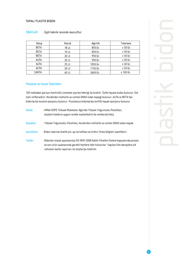 TAPALI PLASTİK BİDON EBATLAR :İlgili teknik resimde mevcuttur.