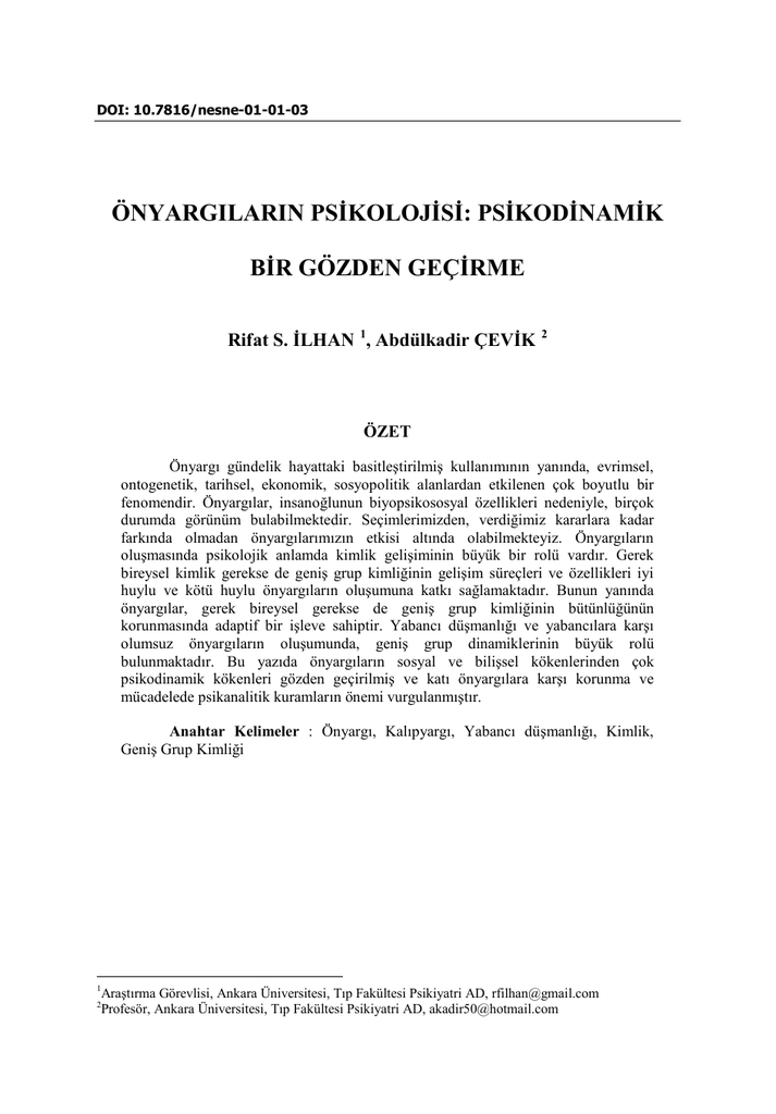 DOI: 10.7816/nesne-01-01-03 ÖNYARGILARIN PSİKOLOJİSİ: PSİKODİNAMİK BİR GÖZDEN GEÇİRME Rifat S. İLHAN 1, Abdülkadir ÇEVİK 2 ÖZET Önyargı gündelik hayattaki basitleştirilmiş kullanımının yanında, evrimsel, ontogenetik, tarihsel, ekonomik, sosyopolitik alanlardan etkilenen çok boyutlu bir fenomendir. Önyargılar, insanoğlunun biyopsikososyal özellikleri nedeniyle, birçok durumda görünüm bulabilmektedir. Seçimlerimizden, verdiğimiz kararlara kadar farkında olmadan önyargılarımızın etkisi altında olabilmekteyiz. Önyargıların oluşmasında psikolojik anlamda kimlik gelişiminin büyük bir rolü vardır. Gerek bireysel kimlik gerekse de geniş grup kimliğinin gelişim süreçleri ve özellikleri iyi huylu ve kötü huylu önyargıların oluşumuna katkı sağlamaktadır. Bunun yanında önyargılar, gerek bireysel gerekse de geniş grup kimliğinin bütünlüğünün korunmasında adaptif bir işleve sahiptir. Yabancı düşmanlığı ve yabancılara karşı olumsuz önyargıların oluşumunda, geniş grup dinamiklerinin büyük rolü bulunmaktadır. Bu yazıda önyargıların sosyal ve bilişsel kökenlerinden çok psikodinamik kökenleri gözden geçirilmiş ve katı önyargılara karşı korunma ve mücadelede psikanalitik kuramların önemi vurgulanmıştır. Anahtar Kelimeler : Önyargı, Kalıpyargı, Yabancı düşmanlığı, Kimlik, Geniş Grup Kimliği Araştırma Görevlisi, Ankara Üniversitesi, Tıp Fakültesi Psikiyatri AD, [email protected] Profesör, Ankara Üniversitesi, Tıp Fakültesi Psikiyatri AD, [email protected] 1 2 İLHAN Rifat S., ÇEVİK Abdülkadir, Önyargıların Psikolojisi: Psikodinamik Bir Gözden Geçirme THE PSYCHOLOGY OF PREJUDICE: A REVIEW OF PSYCDYNAMIC ROOTS OF PREJUDICE ABSTRACT By the elementary usage in every day life, Prejeudice is a multidimensional phenomena which is influenced by evolutional, ontogenetical, historical, economic, sociopolitic fields. Because of the biopyschosocial features of Human being, Prejudice emerges in many situations. There for, we can be under the influence of prejudice when we make decision and make our choises. From the psychological point of view, identity development process has an important role at the forming of prejudice. Both core individual identity and large group identity development processes contribute to the evolving of benign or malign prejudice. İn addition prejudice has an adaptive function at the preserving both of individual and large group identity permanent. In the case of developing negative prejudice toward strangers and of xenophobia, large group dynamics have an important role. In this paper psychoanalytic and psychodynamic roots of prejedice had been more focused over the social and cognitive roots of prejudice had been and emphasised importance of psychoanalytic theories at the prevention of malign and rigid prejudice. Keywords: Prejudice, Steriotype, Xenophobia, Identity , Large Group Identity 53 www.nesnedergisi.com İLHAN Rifat S., ÇEVİK Abdülkadir, Önyargıların Psikolojisi: Psikodinamik Bir Gözden Geçirme Önyargı “Webster” İngilizce sözlükte “peşin hükümlü yargılama”, “yeterli bilgi olmadan edinilmiş hatalı fikir veya öğrenme”, bir gruba, bir kişiye ya da bir ırka karşı mantıklı/rasyonel olmayan düşmanca tutum” olarak (Webster, 1987), Türk Dil Kurumu (TDK) sözlüğünde, “Bir kimse veya bir şeyle ilgili olarak belirli şart, olay ve görüntülere dayanarak önceden edinilmiş olumlu veya olumsuz yargı, peşin yargı” olarak tanımlanmaktadır. Önyargı; evrimsel, ontogenetik, tarihsel, ekonomik, sosyopolitik alanlardan etkilenen çok boyutlu bir fenomendir. Toplumsal düzeyde önyargılar, yabancılara karşı hissedilen belli-belirsiz huzursuzluk duygusundan; etnik aşağılama, vahşet ve soykırıma kadar uzanan geniş bir yelpazede karşımıza çıkabilmektedir. Bundan dolayı nedenlerini, kökenlerini, yararlarını ve zararlarını iyi anlamak gerekmektedir. Bu yazının amacı, önyargıların psikolojik kökenlerini inceleyen çalışmaları gözden geçirerek, psikanalitik bakış açısıyla bireysel ve geniş grup kimliğinin gelişim süreçleri ile önyargıların oluşumu arasındaki ilişkiyi vurgulamaktır. Önyargıların Kökenine Bilişsel ve Sosyal Psikoloji Yaklaşımları Bazı kuramcılar, önyargılı tutum ve davranışların kökeninde insan beyninin kategorik düşünme özelliğinin yattığını ve bu nedenle de önyargıların kaçınılmaz olduğunu öne sürmüşlerdir (Allport, 1954; Ehrlich, 1973 ; Hamilton, 1981). Buna göre insan beyni, yeni karşılaştığı bir durumla ilgili hızlı bir yargıya varmak için önceden oluşturduğu şablonlar ve taslakları kullanır. Önyargılı düşünceler, stres altında olmasak da, dış dünyayı zihnimizde modellememize yardımcı olan bir örüntüye işaret etmekte; çoğu zaman gerçekçi olmasa ve duruma ilişkin etraflıca bilgi içermese de, belirsizliği azaltma işlevi görmektedir. Böylece kişi, yeni karşılaştığı durumlarla ilgili bütün gerçekleri göz önüne almadan, hayatta kalma şansını arttırmak için yeni durumla ilgili genelleştirilmiş düşünce ve tutumlar geliştirebilmektedir. Özellikle sosyal ve bilişsel psikolojide farkında olmadan kararlarımızı ve seçimlerimizi etkileyen düşünce süreçleri “kalıp yargı” (stereotip) olarak adlandırılırken, görünüm bulan ve bu kalıp yargılar sonucunda ortaya çıkan tutum ve davranışlar ise “önyargı” olarak adlandırılmaktadır (Kağıtçıbaşı, 2010 ss: 273-275). Buna göre bireysel tutum ve davranışların bilişsel kısmını yani düşünsel temalarını kalıp yargılar; affektif yani duygusal ve davranışsal kısmını ise önyargılar oluşturmaktadır (Harding 1969 ; Secord, 1974). Bilişsel olarak, kalıp yargılara sahip olan bireylerin her zaman önyargılı tutumlar ortaya koymadıkları bazı 