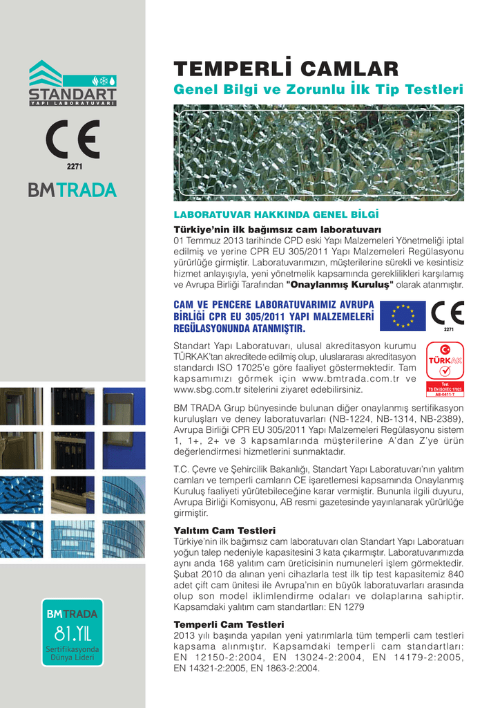 TEMPERLÝ CAMLAR Genel Bilgi ve Zorunlu Ýlk Tip Testleri LABORATUVAR HAKKINDA GENEL BÝLGÝ Türkiye'nin ilk baðýmsýz cam laboratuvarý 01 Temmuz 2013 tarihinde CPD eski Yapý Malzemeleri Yönetmeliði iptal edilmiþ ve yerine CPR EU 305/2011 Yapý Malzemeleri Regülasyonu yürürlüðe girmiþtir. Laboratuvarýmýzýn, müþterilerine sürekli ve kesintisiz hizmet anlayýþýyla, yeni yönetmelik kapsamýnda gereklilikleri karþýlamýþ ve Avrupa Birliði Tarafýndan "Onaylanmýþ Kuruluþ" olarak atanmýþtýr. CAM VE PENCERE LABORATUVARIMIZ AVRUPA BÝRLÝÐÝ CPR EU 305/2011 YAPI MALZEMELERÝ REGÜLASYONUNDA ATANMIÞTIR. Standart Yapý Laboratuvarý, ulusal akreditasyon kurumu TÜRKAKtan akreditede edilmiþ olup, uluslararasý akreditasyon standardý ISO 17025'e göre faaliyet göstermektedir. Tam kapsamýmýzý görmek için www.bmtrada.com.tr ve www.sbg.com.tr sitelerini ziyaret edebilirsiniz. BM TRADA Grup bünyesinde bulunan diðer onaylanmýþ sertifikasyon kuruluþlarý ve deney laboratuvarlarý (NB-1224, NB-1314, NB-2389), Avrupa Birliði CPR EU 305/2011 Yapý Malzemeleri Regülasyonu sistem 1, 1+, 2+ ve 3 kapsamlarýnda müþterilerine A'dan Z'ye ürün deðerlendirmesi hizmetlerini sunmaktadýr. T.C. Çevre ve Þehircilik Bakanlýðý, Standart Yapý Laboratuvarý'nýn yalýtým camlarý ve temperli camlarýn CE iþaretlemesi kapsamýnda Onaylanmýþ Kuruluþ faaliyeti yürütebileceðine karar vermiþtir. Bununla ilgili duyuru, Avrupa Birliði Komisyonu, AB resmi gazetesinde yayýnlanarak yürürlüðe girmiþtir. Yalýtým Cam Testleri Türkiye'nin ilk baðýmsýz cam laboratuvarý olan Standart Yapý Laboratuarý yoðun talep nedeniyle kapasitesini 3 kata çýkarmýþtýr. Laboratuvarýmýzda ayný anda 168 yalýtým cam üreticisinin numuneleri iþlem görmektedir. Þubat 2010 da alýnan yeni cihazlarla test ilk tip test kapasitemiz 840 adet çift cam ünitesi ile Avrupa'nýn en büyük laboratuvarlarý arasýnda olup son model iklimlendirme odalarý ve dolaplarýna sahiptir. Kapsamdaki yalýtým cam standartlarý: EN 1279 Sertifikasyonda Dünya Lideri Temperli Cam Testleri 2013 yýlý baþýnda yapýlan yeni yatýrýmlarla tüm temperli cam testleri kapsama alýnmýþtýr. Kapsamdaki temperli cam standartlarý: EN 12150-2:2004, EN 13024-2:2004, EN 14179-2:2005, EN 14321-2:2005, EN 1863-2:2004. Dýþ Kapý ve Pencereler 2013 yýlý baþýnda yapýlan yeni yatýrýmlarla pencere ve kapýlarýn testleri kapsama alýnmýþtýr. Kapsamdaki kapý ve pencere standartlarý: EN 14351-1:2006. %100 Türk Sermaye ve Sürekli, Güvenilir Hizmet Türkiye'nin ilk baðýmsýz cam laboratuarý olan ve uluslararasý laboratuvar akreditasyon standardý ISO 17025'e göre faaliyet gösteren STANDART YAPI LABORATUVARI, Nisan 2013 de geçirdiði TÜRKAK (Türk Akreditasyon Kurumu) yýllýk gözetim ve kapsam geniþletme denetimlerini baþarýyla geçmiþtir. Cam ve pencere üreticilerine sürekli, güvenilir ve katma deðerli hizmet veren laboratuarýmýz kalitesini bir daha ispatlamýþtýr. %100 Türk sermaye ve bilgi birikimiyle kurulan laboratuarýmýz verdiði hizmetleri daha da geniþleterek büyümeye devam etmektedir. TEMPERLÝ CAM ÇEÞÝTLERÝ VE ÖZELLÝKLERÝ Güçlendirilmiþ veya güvenlik camý olarak da adlandýrýlýr. Normal camlara kýyas ile kýrýlmaya karþý daha dayanýklýdýr. Normal camlardaki kýrýlma sonrasý yaralanmalara kýyasla temperli camlar kýrýldýklarýnda küçük ve keskin olmayan parçalara ayrýlarak daðýlýrlar, bundan dolayý yaralanma risklerini en asgariye indirir. Eþit kalýnlýktaki normal camlara göre yaklaþýk 5 kat daha güçlüdür. Isýya karþý daha dayanýklýdýr. Camlar temperli cam haline getirildikten sonra kesme, taþlama gibi iþlemler yapýlamamaktadýr. Temperleme iþlemi, özel ýsýtma sistemlerinde camlarýn 620°C - 645°C arasýndaki seviyelere getirilip ani ve hýzlý olarak hava ile soðutulmasýyla elde edilir (ýsý deðeri camýn kalýnlýðýna göre deðiþmektedir). Temperli camýn özellikleri: Yoðunluk (yaklaþýk): 2.42-2.52 g/cm³ Çekme/eðme mukavemeti: 120 to 200 N/mm² Sýkýþtýrma mukavemeti: 1000 N/mm² Elastiklik katsayýsý: 70Gpa Doðrusal açýlým katsayýsý: 9 x 10-^6 m/Mk U Deðeri : 5.7 W/sq .m.K (6mm kalýnlýktaki saydam cam) SF (6 mm saydam cam): 81 % Gölgeleme katsayýsý (6 mm saydam): 0.93 Seçicilik: 1 Gürünür ýþýðý geçirme (6 mm saydam): 87 % Temperli Cam Nasýl Üretilir? Camýn ýsý ve darbeye dayanýklý hale gelmesi istendiðinde cam Temperleme denilen bir iþlemden geçirilir. Temperleme iþlemi cam panolarýn özel fýrýnlarda erime noktasýna yakýn derecelerde (650°C-700°C) ýsýtýldýktan sonra hýzla soðutulmasý esasýna dayanýr. Sýcaklýðýn azalmasý ile yüzey büzüþür ve sertleþir. Ancak iç kýsým sýcak kalýr ve yüzeydeki büzülmeye kendini uydurur. Ýç kýsmýn soðumasýyla camýn her iki yüzünde basýnç, iç kýsýmda ise çekme gerilmeleri oluþur. Ani soðutma uygulanarak temperleme iþlemlerinden geçen cam 300°Clik bir ýsýl þoka dayanýklý hale gelmekteyken temperlenmemiþ camda 30-50°C lik bir ýsýl þok camýn kýrýlmasýna neden olmaktadýr. Temperli Camlarýn Kullaným Yerleri Binalarda dýþ cephe camlarý, Maðaza vitrinleri, Þömine muhafazalarý ve fýrýn kapaklarý, Araçlarýn yan ve arka camlarý, Duþ ve küvet camlarý, Binalardaki cam kapýlar, Sehpa ve masalar, Buzdolabý tepsilerinde (raflarý), Tabaklarda ve piþirme tepsileri. Kýsmi Temperlenmiþ Camlar Dýþ zorlamalar ve ýsýl gerilimlere karþý dayanýklýdýr. Kýsmi temperlenmiþ camlarýn mukavemeti temperlenmiþ camlarýn yarýsý kadardýr. Kýsmi temperleme de ayný fýrýnlarda ve ayný sýcaklýk derecelerinde gerçekleþtirilir. Bu iþlemdeki tek fark soðutmanýn nispeten daha yavaþ yapýlmasýdýr. Daha yavaþ soðutulan camlarýnyüzey ön gerilimi daha az, dolayýsýyla spontane kýrýlma riski daha düþüktür. Kýsmi temp