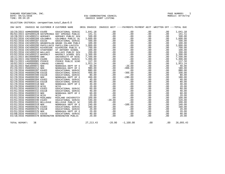 SUNGARD PENTAMATION, INC. DATE: 04/11/2016 TIME: 09:34:19 PAGE NUMBER: 1 MODULE: mrinvlrp ESU COORDINATING COUNCIL INVOICE SHORT LISTING SELECTION CRITERIA: cmropenitem.total_due>0.0 INV DATE INVOICE NO CUSTOMER # CUSTOMER NAME 10/29/2015 06/02/2015 10/28/2015 03/02/2016 03/02/2016 03/02/2016 03/02/2016 03/02/2016 03/02/2016 03/02/2016 03/02/2016 10/22/2015 10/26/2015 08/21/2015 10/02/2015 10/26/2015 05/20/2015 02/29/2016 02/29/2016 02/29/2016 02/29/2016 02/29/2016 02/29/2016 02/29/2016 02/29/2016 03/01/2016 03/01/2016 03/01/2016 03/01/2016 03/01/2016 03/01/2016 03/01/2016 03/01/2016 03/01/2016 03/01/2016 03/01/2016 03/08/2016 03/18/2016 ADMN000006 AEPA000128 CRIS000151 CRIS000184 CRIS000187 CRIS000191 CRIS000200 CRIS000201 CRIS000204 CRIS000210 CRIS000213 DEC0000040 IMAT000076 LMS0000085 LMS0000091 NWEA000072 PDO0000212 PDO0000287 PDO0000298 PDO0000300 PDO0000302 PDO0000304 PDO0000316 PDO0000318 PDO0000319 PDO0000322 PDO0000332 PDO0000333 PDO0000334 PDO0000338 PDO0000340 PDO0000341 PDO0000359 PDO0000362 PDO0000374 PDO0000376 PDO0000377 PDO0000378 TOTAL REPORT: 38 ESU06 HAYSPRINGS HERSHEY COLUMBUS ESU16 GRANDISLAN PAPILLAVIS RIVERSIDE STANTHONY WALLACE WAVERLY UWW ESU06 PIERCE CANVAS NDE NDE ESU03 ESU16 ESU18 NDE ESU03 ESU18 NDE OCIO ESU03 ESU18 NDE OCIO MIDLANDU ESU03 BELLEVUE NDE ESU03 ESU18 NDE ESU16 BENNINGTON EDUCATIONAL SERVIC HAY SPRINGS PUBLIC HERSHEY PUBLIC SCH COLUMBUS PUBLIC SC EDUCATIONAL SERVIC GRAND ISLAND PUBLI PAPILLION-LAVISTA RIVERSIDE PUBLIC S ST ANTHONY SCHOOL WALLACE PUBLIC SCH WAVERLY SCHOOL DIS UNIVERSITY OF WISC EDUCATIONAL SERVIC PIERCE PUBLIC SCHO CANVAS NEBRASKA DEPT OF E NEBRASKA DEPT OF E EDUCATIONAL SERVIC EDUCATIONAL SERVIC EDUCATIONAL SERVIC NEBRASKA DEPT OF E EDUCATIONAL SERVIC EDUCATIONAL SERVIC NEBRASKA DEPT OF E OCIO EDUCATIONAL SERVIC EDUCATIONAL SERVIC NEBRASKA DEPT OF E OCIO MIDLAND UNIVERSTIY EDUCATIONAL SERVIC BELLEVUE PUBLIC SC NEBRASKA DEPT OF E EDUCATIONAL SERVIC EDUCATIONAL SERVIC NEBRASKA DEPT OF E EDUCATIONAL SERVIC BENNINGTON PUBLIC ORIG INVOICE 1,641.18 141.51 500.00 1,600.00 500.00 100.00 1,000.00 700.00 100.00 200.00 1,300.00 7,500.00 5,400.00 117.50 1,953.24 60.00 980.00 880.00 400.00 80.00 460.00 40.00 80.00 40.00 20.00 60.00 40.00 60.00 20.00 100.00 540.00 100.00 240.00 160.00 20.00 20.00 40.00 20.00 27,213.43 INVOICE ADJT ----PAYMENTS PAYMENT ADJT -WRITTEN OFF ---TOTAL DUE .00 .00 .00 .00 .00 .00 .00 .00 .00 .00 .00 .00 .00 .00 .00 .00 .00 .00 .00 .00 .00 .00 .00 .00 .00 .00 .00 .00 .00 .00 -20.00 .00 .00 .00 .00 .00 .00 .00 -20.00 .00 .00 .00 .00 .00 .00 .00 .00 .00 .00 .00 .00 .00 .00 .00 -20.00 -400.00 .00 -300.00 .00 -280.00 .00 .00 .00 .00 .00 .00 .00 .00 .00 .00 .00 -100.00 .00 .00 .00 .00 .00 -1,100.00 .00 .00 .00 .00 .00 .00 .00 .00 .00 .00 .00 .00 .00 .00 .00 .00 .00 .00 .00 .00 .00 .00 .00 .00 .00 .00 .00 .00 .00 .00 .00 .00 .00 .00 .00 .00 .00 .00 .00 .00 .00 .00 .00 .00 .00 .00 .00 .00 .00 .00 .00 .00 .00 .00 .00 .00 .00 .00 .00 .00 .00 .00 .00 .00 .00 .00 .00 .00 .00 .00 .00 .00 .00 .00 .00 .00 .00 .00 1,641.18 141.51 500.00 1,600.00 500.00 100.00 1,000.00 700.00 100.00 200.00 1,300.00 7,500.00 5,400.00 117.50 1,953.24 40.00 580.00 880.00 100.00 80.00 180.00 40.00 80.00 40.00 20.00 60.00 40.00 60.00 20.00 100.00 520.00 100.00 140.00 160.00 20.00 20.00 40.00 20.00 26,093.43