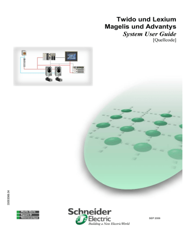 Twido und Lexium Magelis und Advantys System User Guide 33003566.04 [Quellcode] SEP 2006 Inhaltsverzeichnis Anwendungsquellcode ......................................................................................................... 4 Typische Anwendungen ....................................................................................................... 5 System................................................................................................................................... 6 Architektur ....................................................................................................................... 6 Installation ....................................................................................................................... 9 Hardware ..............................................................................................................................................10 Software ...............................................................................................................................................18 Kommunikation ....................................................................................................................................19 Implementierung............................................................................................................ 26 Kommunikation ....................................................................................................................................27 HMI .......................................................................................................................................................32 SPS.......................................................................................................................................................47 Geräte...................................................................................................................................................63 Leistungsmerkmale ..............................................................................................................................82 Anhang ................................................................................................................................ 83 Detaillierte Komponentenliste ....................................................................................... 83 Schutzklasse der Komponenten.................................................................................... 84 Eigenschaften der einzelnen Komponenten ................................................................. 85 Kontakt ................................................................................................................................ 87 Einleitung Dieses Dokument soll einen schnellen Überblick über ein System geben. Es ist nicht die Absicht, andere Produktdokumente zu ersetzen. Statt dessen soll es zusätzliche Informationen zu den Produktdokumenten liefern, um das hier beschriebene System zu installieren, zu parametrieren und in Betrieb zu nehmen. Eine detaillierte Funktionsbeschreibung oder Spezifikation der Anwendung ist nicht Teil dieser Anleitung. Dennoch enthält das Dokument einige typische Anwendungen in der dieses System eingesetzt werden kann. Twido and Lexium Magelis and Advantys_DE.doc Schneider Electric 1 Abkürzungen Wort / Ausdruck AC Advantys Altivar (ATV) BxHxT CANopen CB CoDeSys ConneXium DC E/A EDS FU Harmony HMI IclA (ICLA) Lexium/Lexium05/LXM Magelis MB - SL Micro Modbus NEG NIM NOT-AUS Osiswitch PC Phaseo PowerSuite Premium Preventa PS PS1131 (CoDeSys) SE SPS Twido and Lexium Magelis and Advantys_DE.doc Erläuterung Wechselstrom SE Produktname für eine E/A-Modul-Familie SE Produktname für eine FU-Familie Dimensionen : Breite, Höhe, Tiefe Ein Kommunikations-Maschinenbussystem Trennschalter oder Motorschutz Hardware-unabhängiges IEC 61131-3 Programmiersoftware SE Produktname für eine Transparent Factory Geräte Familie Gleichstrom Ein-/Ausgabe Electronic Data Sheet (Elektronisches Datenblatt) Frequenzumrichter oder Frequenzumformer SE Produktname für eine Familie Schalter and Meldeleuchter Anzeige- und Bediengerät SE Produktname für ein Kompakt-Drive SE Produktname für eine Servo-Antrieb-Familie SE Produktname für eine HMI-Familie SE Name für ein serielles Modbus Kommunikationsprotokoll SE Produktname für eine mittlere SPS-Familie Kommunikationsverbindung/Übertragungsprotokoll Netzgerät SE Produktname für ein Netzwerk-Interface Modul NOT-AUS Schalter SE Produktname einer Positionsschalter Familie Personal Computer SE Produktname für eine Netzgerät-Familie SE software Produkt um FUs zu programmieren SE Produktname für eine mittlere SPS-Familie SE Produktname für eine Sicherheitsgeräte-Familie (Power Supply) Spannungsversorgung SE Produktname einer SPS-Programmiersoftware mit CoDeSys Schneider Electric Speicherprogrammierbare Steuerung Schneider Electric 2 SW Sycon Telefast TeSysU Twido TwidoSoft TwidoSuite Unity (Pro) Vijeo Designer VVD XBT-L1000 Zelio ZelioSoft Twido and Lexium Magelis and Advantys_DE.doc (Switch) Schalter SE Produktname einer Feldbus-Programmiersoftware SE Produktname für ein dezentrales E/A-Gerät SE Produktname eines dezentralen E/A-Systems SE Produktname für eine mittlere SPS-Familie SE Produktname einer SPS-Programmiersoftware SE Produktname einer SPS-Programmiersoftware SE Produktname einer SPS-Programmiersoftware SE Software-Produkt um Magelis HMI Geräte zu programmieren Antrieb mit variabler Geschwindigkeit (VVD) SE Software-Produkt um Magelis HMI Geräte zu programmieren SE Produktname für eine kleine SPS-Familie SE Produktname einer SPS-Programmiersoftware Schneider Electric 3 Anwendungsquellcode Einleitung Beispielquellcode und Verdrahtungsdiagramme, die die hier beschriebene Systemfunktionalität abbilden, können von unser „Village“ website hier heruntergeladen werden. Der Anwendungsquellcode ist im Form von Konfigurations-, Applikations- und Im
