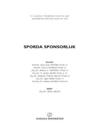 T.C. ANADOLU ÜN‹VERS‹TES‹ YAYINI NO: 2885 AÇIKÖ⁄RET‹M FAKÜLTES‹ YAYINI NO: 1842 SPORDA SPONSORLUK Yazarlar Prof.Dr. Sevgi Ayfle ÖZTÜRK (Ünite 1) Prof.Dr. Yavuz ODABAfiI (Ünite 2) Doç.Dr. Meltem N. VEL‹O⁄LU (Ünite 3) Doç.Dr. N. Serdar SEVER (Ünite 4, 5) Doç.Dr. Mehpare TOKAY ARGAN (Ünite 6) Doç.Dr. Alper ÖZER (Ünite 7) Yrd.Doç.Dr. Hakan KATIRCI (Ünite 8) Editör Doç.Dr. Metin ARGAN ANADOLU ÜN‹VERS‹TES‹ Bu kitab›n bas›m, yay›m ve sat›fl haklar› Anadolu Üniversitesine aittir. “Uzaktan Ö¤retim” tekni¤ine uygun olarak haz›rlanan bu kitab›n bütün haklar› sakl›d›r. ‹lgili kurulufltan izin almadan kitab›n tümü ya da bölümleri mekanik, elektronik, fotokopi, manyetik kay›t veya baflka flekillerde ço¤alt›lamaz, bas›lamaz ve da¤›t›lamaz. Copyright © 2013 by Anadolu University All rights reserved No part of this book may be reproduced or stored in a retrieval system, or transmitted in any form or by any means mechanical, electronic, photocopy, magnetic tape or otherwise, without permission in writing from the University. UZAKTAN Ö⁄RET‹M TASARIM B‹R‹M‹ Genel Koordinatör Prof.Dr. Levend K›l›ç Genel Koordinatör Yard›mc›s› Doç.Dr. Müjgan Bozkaya Ö¤retim Tasar›mc›s› Dr. Kadriye Uzun Grafik Tasar›m Yönetmenleri Prof. Tevfik Fikret Uçar Ö¤r.Gör. Cemalettin Y›ld›z Ö¤r.Gör. Nilgün Salur Ölçme De¤erlendirme Sorumlusu Ö¤r.Gör. Bülent Atmacan Dil Yaz›m Dan›flman› Okt. Ferdi Bozkurt Grafiker Gülflah Y›lmaz Kitap Koordinasyon Birimi Yrd.Doç.Dr. Feyyaz Bodur Uzm. Nermin Özgür Kapak Düzeni Prof. Tevfik Fikret Uçar Ö¤r.Gör. Cemalettin Y›ld›z Dizgi Aç›kö¤retim Fakültesi Dizgi Ekibi Sporda Sponsorluk ISBN 978-975-06-1548-1 1. Bask› Bu kitap ANADOLU ÜN‹VERS‹TES‹ Web-Ofset Tesislerinde 3.000 adet bas›lm›flt›r. ESK‹fiEH‹R, Ocak 2013 iii ‹çindekiler ‹çindekiler Önsöz ............................................................................................................ ix Spor Sponsorlu¤u: Kavram ve Özellikler.............................. 2 G‹R‹fi .............................................................................................................. SPOR SPONSORLU⁄U KAVRAMININ AÇIKLANMASI ............................... SPORSORLUK VE BENZER KAVRAMLARLA ‹L‹fiK‹S‹ ................................ SPOR SPONSORLU⁄UNUN GEL‹fi‹M‹ ......................................................... SPOR SPONSORLU⁄U TÜRLER‹ .................................................................. Bireysel Sporcu Sponsorlu¤u........................................................................ Spor Tak›mlar› Sponsorlu¤u ......................................................................... Spor Olaylar›n›n ve Spor Organizasyonlar›n›n Sponsorlu¤u...................... SPOR SPONSORLU⁄U KATEGOR‹LER‹....................................................... Ayr›cal›kl› (özel) Sponsorluk ........................................................................ Ana Sponsorluk ............................................................................................. Yard›mc› Sponsorluk..................................................................................... Resmî Malzeme Tedarikçisi .......................................................................... SPOR SPONSORLU⁄UNUN YARARLARI VE OLASI SAKINCALARI .......... Spor Organizasyonlar› Aç›s›ndan Yararlar› .................................................. Sponsor ‹flletme Aç›s›ndan Yararlar› ............................................................ Toplum Aç›s›ndan Spor Sponsorlu¤u .......................................................... Üçüncü Taraflara Yararlar›............................................................................ Spor Sponsorlu¤unun Olas› Sak›ncalar›....................................................... Özet................................................................................................................ Kendimizi S›nayal›m...................................................................................... Okuma Parças› ............................................................................................. Kendimizi S›nayal›m Yan›t Anahtar› ............................................................ S›ra Sizde Yan›t Anahtar› .............................................................................. Yararlan›lan ve Baflvurulabilecek Kaynaklar ............................................... 3 3 4 5 8 8 9 10 10 10 11 11 12 12 12 13 14 15 17 19 21 22 23 24 25 Pazarlama ‹letiflimi ve Sponsorluk ........................................ 26 G‹R‹fi .............................................................................................................. PAZARLAMA ‹LET‹fi‹M‹ MODEL‹ ................................................................. SPOR PAZARLAMASI ‹LET‹fi‹M TÜRLER‹ .................................................... BÜTÜNLEfi‹K SPOR PAZARLAMA ‹LET‹fi‹M‹ .............................................. Bütünleflik Spor Sponsorluk ‹letiflimindeki Zorluklar ................................. Hedef Kitle ve Amaçlar................................................................................. PAZARLAMA ‹LET‹fi‹M KARMASI VE SPONSORLUK ................................. Halkla ‹liflkiler ve Duyurum ........................................................................ Reklam ........................................................................................................... Do¤rudan Pazarlama ................................................................................... Sat›fl Tutundurma .......................................................................................... 27 28 29 31 33 33 35 35 36 37 38 1. ÜN‹TE 2