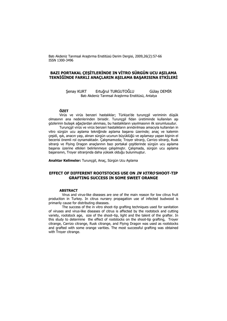 Batı Akdeniz Tarımsal Araştırma Enstitüsü Derim Dergisi, 2009,26(2):57-66 ISSN 1300-3496 BAZI PORTAKAL ÇEŞİTLERİNDE IN VİTRO SÜRGÜN UCU AŞILAMA TEKNİĞİNDE FARKLI ANAÇLARIN AŞILAMA BAŞARISINA ETKİLERİ Şenay KURT Ertuğrul TURGUTOĞLU Gülay DEMİR Batı Akdeniz Tarımsal Araştırma Enstitüsü, Antalya ÖZET Virüs ve virüs benzeri hastalıklar; Türkiye’de turunçgil veriminin düşük olmasının ana nedenlerinden birisidir. Turunçgil fidan üretiminde kullanılan aşı gözlerinin bulaşık ağaçlardan alınması, bu hastalıkların yayılmasının ilk sorumlusudur. Turunçgil virüs ve virüs benzeri hastalıkların arındırılması amacıyla kullanılan in vitro sürgün ucu aşılama tekniğinde aşılama başarısı üzerinde; anaç ve kalemin çeşidi, ışık, anacın yaşı, alınan sürgün ucunun büyüklüğü ve aşılamayı yapan kişinin el becerisi önemli rol oynamaktadır. Çalışmamızda; Troyer sitranjı, Carrizo sitranjı, Rusk sitranjı ve Flying Dragon anaçlarının bazı portakal çeşitlerinde sürgün ucu aşılama başarısı üzerine etkileri belirlenmeye çalışılmıştır. Çalışmada, sürgün ucu aşılama başarısının, Troyer sitranjında daha yüksek olduğu bulunmuştur. Anahtar Kelimeler: Turunçgil, Anaç, Sürgün Ucu Aşılama EFFECT OF DIFFERENT ROOTSTOCKS USE ON IN VITRO SHOOT-TIP GRAFTING SUCCESS IN SOME SWEET ORANGE ABSTRACT Virus and virus-like diseases are one of the main reason for low citrus fruit production in Turkey. In citrus nursery propagation use of infected budwood is primarily cause for distributing diseases. The success of the in vitro shoot–tip grafting techniques used for sanitation of viruses and virus-like diseases of citrus is affected by the rootstock and cutting variety, rootstock age, size of the shoot–tip, light and the talent of the grafter. In this study to determine the effect of rootstocks on the shoot-tip grafting, Troyer citrange, Carrizo citrange, Rusk citrange, and Flying Dragon was used as rootstocks and grafted with some orange varities. The most successful grafting was obtained with Troyer citrange. Key Words : Citrus, Rootstock, Shoot-tip grafting 1.GİRİŞ Ülkemiz meyveciliğinde 2007 yılı verilerine göre turunçgiller, 3.102.414 ton üretim ve 830.418 ton ihracat miktarı ile önemli bir yer tutmaktadır. Ülkemizin 2.194.329 ton olan toplam yaş meyve ve sebze ihracatı içerisinde turunçgiller % 38’lik bir payla taze sebzeden sonra ikinci sırada yer almaktadır (FAO 2009, Anonim 2009). Ülkemizde turunçgil tarımını olumsuz olarak etkileyen en önemli faktörlerden birisi virüs ve virüs benzeri hastalıklardır. Bu hastalıklardan bazıları bulaştıkları ağaçları az veya fark edilmeyecek kadar zararlandırırken, bazıları da üretim kaybı nedeniyle turunçgil tarımını engelleyecek hatta hassas tür veya anaç-kalem kombinasyonlarını ölüme götürebilecek kadar zarar verebilmektedirler. Bu hastalıkların hızlı yayılmalarında en büyük rolü hastalıkla bulaşık ağaçlardan alınan aşı gözleri ile fidan üretimi oynamaktadır. Turunçgil virüs ve virüs benzeri hastalıkları nedeniyle oluşan yüksek ekonomik kayıplar, bu hastalıklardan arınmış üretim aşı kalemini gerekli kılmış ve sürgün ucu aşılama (SUA) tekniğinin gelişimini sağlamıştır (Navarro vd. 1975). Geçmişte virüsten arınmış turunçgil bitkilerini elde etmek için en yaygın olarak kullanılan yöntem, poliembriyonik çeşitlerin nuseller çöğürlerinin seçimi olmuştur (Weathers ve Calavan 1959). Ancak bazı virüs ve virüs benzeri hastalıkların ender de olsa tohumdan geçmesi, nuseller çöğürlerin seksüel çöğürlerden ayrılmasında zorluklar bulunması, bazı çeşitlerin monoembriyonik olması ve özellikle tohumdan yetişen bitkilerde uzun yıllar gençlik karakterlerinin devam etmesi, “Nuseller hatlardan seçimle arındırma” yönteminin zorluklarını oluşturmaktadır (Göral 1987). Diğer bir yöntem “sıcaklık tedavisi”dir. Ancak bu yöntem cüceleşme, gözenek, palamutlaşma, yellow vein ve dweet mottle etmenlerini elimine etmede etkisiz kalmıştır.(Roistacher 1978). Bu yöntemlerin belirtilen bazı noksanlıkları, yeni bir arındırma yönteminin aranmasına neden olmuştur. SUA çalışmaları, ilk defa 1964 yılında 1 cm uzunluğunda bir sürgünün aşılanması ile başlamıştır (Stubbs 1968). Bitters vd. (1972), bu çalışmadan yola çıkarak, özel koşullarda yetiştirilen çöğüre daha küçük sürgün ucu kısmını aşılama tekniğini geliştirmişlerdir. Murashige vd. (1972), in vitro koşullarda sürgün ucu aşılama çalışması yaparak, exocortisten temiz ve gençlik karakteri göstermeyen birkaç turunçgil bitkisi elde etmişlerdir. Aynı zamanda aşıladıkları sürgün ucu büyüklüğü ile hastalıktan temiz bitki elde etme arasında bir ilişkinin varlığını tespit etmişlerdir. In vitro SUA tekniği üzerinde Navarro vd. (1975), ayrıntılı olarak çalışmışlar ve standart bir yöntem olarak ortaya koymuşlardır. Virüs ve virüs benzeri hastalık etmenleri henüz uç meristem ve birkaç yaprak taslağına dağılmadan, bu kısımla doku kültürü yoluyla üretim yapmak esasına dayanan SUA tekniği hastalık etmenlerinden temiz ve gençlik karakterleri göstermeyen bitkiler elde etme imkânı sağlamış ve hemen bütün çeşit geliştirme programlarına alınmıştır (Navarro 1981). Ülkemizde başta stubborn (palamutlaşma) olmak üzere diğer virüs ve virüs benzeri hastalıkların yaygın olmaları sebebiyle temiz aşı gözü ihtiyacı sonucunda 1980’li yıllardan itibaren in vitro SUA’nın uygulanabilir hale getirilmesi için çalışmalar başlatılmıştır (Tuzcu vd. 1982). Çınar ve Tamer (1988), in vitro SUA ve ısı tedavisi tekniklerini ayrı ayrı ve kombinasyon halinde bazı virüs ve virüs benzeri hastalıklarla bulaşık göbekli porta
