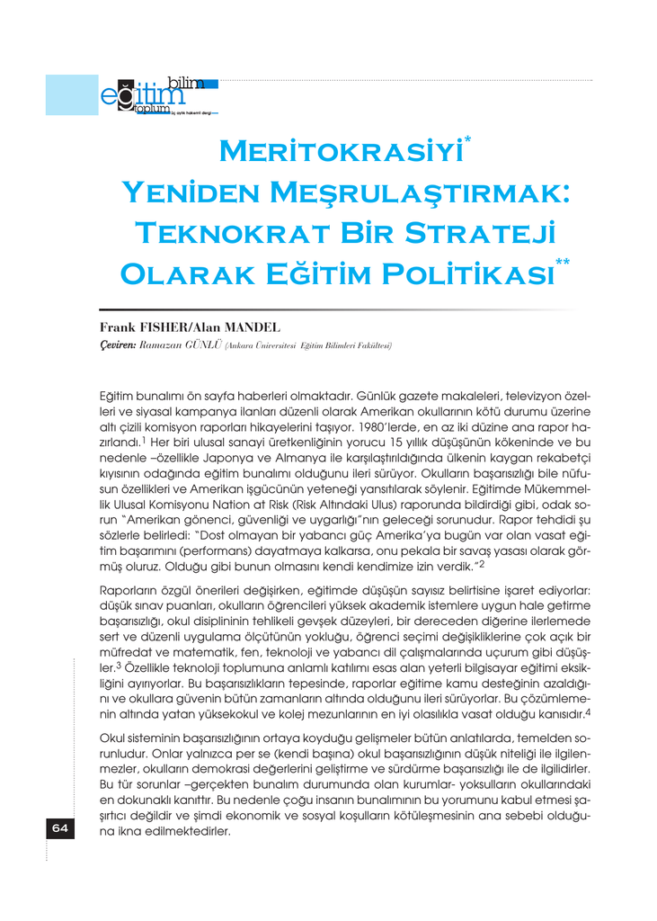 Meritokrasiyi* Yeniden Meflrulaflt›rmak: Teknokrat Bir Strateji Olarak E¤itim Politikas›** Frank FISHER/Alan MANDEL Çeviren: Ramazan GÜNLÜ (Ankara Üniversitesi E¤itim Bilimleri Fakültesi) E¤itim bunal›m› ön sayfa haberleri olmaktad›r. Günlük gazete makaleleri, televizyon özelleri ve siyasal kampanya ilanlar› düzenli olarak Amerikan okullar›n›n kötü durumu üzerine alt› çizili komisyon raporlar› hikayelerini tafl›yor. 1980’lerde, en az iki düzine ana rapor haz›rland›.1 Her biri ulusal sanayi üretkenli¤inin yorucu 15 y›ll›k düflüflünün kökeninde ve bu nedenle –özellikle Japonya ve Almanya ile karfl›laflt›r›ld›¤›nda ülkenin kaygan rekabetçi k›y›s›n›n oda¤›nda e¤itim bunal›m› oldu¤unu ileri sürüyor. Okullar›n baflar›s›zl›¤› bile nüfusun özellikleri ve Amerikan iflgücünün yetene¤i yans›t›larak söylenir. E¤itimde Mükemmellik Ulusal Komisyonu Nation at Risk (Risk Alt›ndaki Ulus) raporunda bildirdi¤i gibi, odak sorun “Amerikan gönenci, güvenli¤i ve uygarl›¤›”n›n gelece¤i sorunudur. Rapor tehdidi flu sözlerle belirledi: “Dost olmayan bir yabanc› güç Amerika’ya bugün var olan vasat e¤itim baflar›m›n› (performans) dayatmaya kalkarsa, onu pekala bir savafl yasas› olarak görmüfl oluruz. Oldu¤u gibi bunun olmas›n› kendi kendimize izin verdik.”2 Raporlar›n özgül önerileri de¤iflirken, e¤itimde düflüflün say›s›z belirtisine iflaret ediyorlar: düflük s›nav puanlar›, okullar›n ö¤rencileri yüksek akademik istemlere uygun hale getirme baflar›s›zl›¤›, okul disiplininin tehlikeli gevflek düzeyleri, bir dereceden di¤erine ilerlemede sert ve düzenli uygulama ölçütünün yoklu¤u, ö¤renci seçimi de¤iflikliklerine çok aç›k bir müfredat ve matematik, fen, teknoloji ve yabanc› dil çal›flmalar›nda uçurum gibi düflüfller.3 Özellikle teknoloji toplumuna anlaml› kat›l›m› esas alan yeterli bilgisayar e¤itimi eksikli¤ini ay›r›yorlar. Bu baflar›s›zl›klar›n tepesinde, raporlar e¤itime kamu deste¤inin azald›¤›n› ve okullara güvenin bütün zamanlar›n alt›nda oldu¤unu ileri sürüyorlar. Bu çözümlemenin alt›nda yatan yüksekokul ve kolej mezunlar›n›n en iyi olas›l›kla vasat oldu¤u kan›s›d›r.4 64 Okul sisteminin baflar›s›zl›¤›n›n ortaya koydu¤u geliflmeler bütün anlat›larda, temelden sorunludur. Onlar yaln›zca per se (kendi bafl›na) okul baflar›s›zl›¤›n›n düflük niteli¤i ile ilgilenmezler, okullar›n demokrasi de¤erlerini gelifltirme ve sürdürme baflar›s›zl›¤› ile de ilgilidirler. Bu tür sorunlar –gerçekten bunal›m durumunda olan kurumlar- yoksullar›n okullar›ndaki en dokunakl› kan›tt›r. Bu nedenle ço¤u insan›n bunal›m›n›n bu yorumunu kabul etmesi flafl›rt›c› de¤ildir ve flimdi ekonomik ve sosyal koflullar›n kötüleflmesinin ana sebebi oldu¤una ikna edilmektedirler. Raporlar›n arad›¤› fley ulusal uzlaflma çevresinde kurulan kapsaml› e¤itim düzeltimidir (reform). Bu hedefe do¤ru “mükemmelin” dili uzlaflma aray›fl›n› yönlendirme çerçevesi olarak ortaya konulmaktad›r. Mükemmellik high-tech (yüksek teknoloji toplumu) Amerika’n›n gelece¤ini tehdit eden derin s›tmay› iyilefltirmeyi tasarlayan düzenleyici meritokratik düzeltim (reform) ideolojisi olarak ortaya ç›kt›.5 Bununla birlikte, mükemmellik retori¤inin alt›nda yatan e¤itimin gelifltirilmesi ile son verilecek yabanc› özel ç›karlar› için bunal›m›n› araçsallaflt›rma giriflimidir. Düzeltim stratejisinin elefltirisel çözümlemesinin dayana¤› onun dayand›¤› sorunlu varsay›mlar› incelemesidir. Burada sorun olan fley kendi bafl›na (per se) e¤itim bunal›m› de¤il, fakat daha çok onun tan›m› ve varsayd›¤› fleydir. Raporlar›n en önemli çal›flma varsay›mlar›n› düflünün. Kabul edilmifl e¤itim bunal›m› çiziminde hiçbir fley ö¤rencilere high-tech Amerika’y› baflarmada gerekli beceri türlerini sa¤layacak okul baflar›s›zl›klar›ndan daha önemli bir rol oynamaz. Okullar›n iflyerine giden bir yol olma zorunlulu¤u düzeltim ideolojisine özgü uzun erimli bir inançt›r. Yani, modern e¤itimin temel ifllevinin ö¤rencilere uygun ifl becerileri ve iflle ilgili de¤erler ve tutumlar sa¤lamak oldu¤u varsay›lmaktad›r. Komisyon raporlar›na göre, high-tech dünyan›n zorunluluklar›na duyars›z olan Amerikan okullar› bu rolü yerine getirmiyor. Bununla birlikte, komisyonlar›n gerçekleri sorgulanabilir. Oysa raporlar tipik olarak hightech yetifltirme gereksinimini varsayarken, emek piyasas› üzerine son çal›flmalar kökten farkl› bir resim çiziyor. Ço¤u ifl art›fl› en az beceri gerektiren alanlarda ortaya ç›k›yor- özellikle bu ifller ekonominin geniflleyen hizmet kesiminde bulunuyor. Çal›flma ‹statistikleri Bürosu, örne¤in high-tech sanayiler en genifl anlamda tan›mlansa bile, onlar›n “1995’te yeni ifllerin yaln›zca küçük bir oran›n› kapsad›¤›n›” gösteriyor.6 Büro 23.4 ila 28.6 milyon aras›nda yeni iflin 1982-1995 aras›nda yarat›laca¤›n› ileri sürüyor. Bunlar›n yaln›zca 1.0 ila 4.6 milyon aras›nda olanlar›n›n high-tech sanayilerde olaca¤› kestirilmektedir.7 En çarp›c› olarak, inflaat bekçileri, kasiyer, sekreter, mutfak yard›mc›s›, koruma ve kap›c›lar gibi ifl kategorilerindeki art›fl bilgisayar sistemleri çözümleyicisi, programc› ve hatta bilgisayar iflletmeni gibi alanlardaki toplam ifl art›fl› yüzdesinin hepsinin üstündedir.8 Hatta daha temelde e¤itim ile ifl becerileri aras›ndaki son derece belirsiz iliflkiyi kavrama baflar›s›zl›¤› vard›r. Asl›nda, hiçbir vaat modern e¤itim ideolojilerine e¤itimin özellikle ileri teknoloji toplumlar›nda ekonomik geliflm