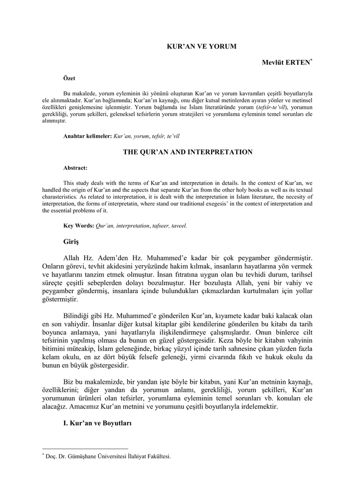 KUR’AN VE YORUM Mevlüt ERTEN Özet Bu makalede, yorum eyleminin iki yönünü oluşturan Kur’an ve yorum kavramları çeşitli boyutlarıyla ele alınmaktadır. Kur’an bağlamında; Kur’an’ın kaynağı, onu diğer kutsal metinlerden ayıran yönler ve metinsel özellikleri genişlemesine işlenmiştir. Yorum bağlamda ise İslam literatüründe yorum (tefsîr-te’vîl), yorumun gerekliliği, yorum şekilleri, geleneksel tefsirlerin yorum stratejileri ve yorumlama eyleminin temel sorunları ele alınmıştır. Anahtar kelimeler: Kur’an, yorum, tefsîr, te’vîl THE QUR’AN AND INTERPRETATION Abstract: This study deals with the terms of Kur’an and interpretation in details. In the context of Kur’an, we handled the origin of Kur’an and the aspects that separate Kur’an from the other holy books as well as its textual charasteristics. As related to interpretation, it is dealt with the interpretation in Islam literature, the necesity of interpretation, the forms of interpretatin, where stand our traditional exegesis’ in the context of interpretation and the essential problems of it. Key Words: Qur’an, interpretation, tafseer, taveel. Giriş Allah Hz. Adem’den Hz. Muhammed’e kadar bir çok peygamber göndermiştir. Onların görevi, tevhit akidesini yeryüzünde hakim kılmak, insanların hayatlarına yön vermek ve hayatlarını tanzim etmek olmuştur. İnsan fıtratına uygun olan bu tevhidi durum, tarihsel süreçte çeşitli sebeplerden dolayı bozulmuştur. Her bozuluşta Allah, yeni bir vahiy ve peygamber göndermiş, insanlara içinde bulundukları çıkmazlardan kurtulmaları için yollar göstermiştir. Bilindiği gibi Hz. Muhammed’e gönderilen Kur’an, kıyamete kadar baki kalacak olan en son vahiydir. İnsanlar diğer kutsal kitaplar gibi kendilerine gönderilen bu kitabı da tarih boyunca anlamaya, yani hayatlarıyla ilişkilendirmeye çalışmışlardır. Onun binlerce cilt tefsirinin yapılmış olması da bunun en güzel göstergesidir. Keza böyle bir kitabın vahyinin bitimini müteakip, İslam geleneğinde, birkaç yüzyıl içinde tarih sahnesine çıkan yüzden fazla kelam okulu, en az dört büyük felsefe geleneği, yirmi civarında fıkıh ve hukuk okulu da bunun en büyük göstergesidir. Biz bu makalemizde, bir yandan işte böyle bir kitabın, yani Kur’an metninin kaynağı, özelliklerini; diğer yandan da yorumun anlamı, gerekliliği, yorum şekilleri, Kur’an yorumunun ürünleri olan tefsirler, yorumlama eyleminin temel sorunları vb. konuları ele alacağız. Amacımız Kur’an metnini ve yorumunu çeşitli boyutlarıyla irdelemektir. I. Kur’an ve Boyutları Doç. Dr. Gümüşhane Üniversitesi İlahiyat Fakültesi. Doç. Dr. Mevlüt ERTEN Kur’an her ne kadar insan diliyle indirilmiş olsa da ki, bu doğal bir durum olup aksi de mümkün değildir, O Allah kelamıdır, beşer sözü değildir. Mu’cize oluşu da buradan kaynaklanmaktadır. Bu başlık altında, Kur’an’ın mahiyeti ve özellikleri üzerinde duracağız. A. Kur’an’ın Kaynağı Kur’an’ın kaynağı hem lafzıyla hem de manasıyla Allah’ın katındandır. Kur’an’ın bizzat kendisi birçok ayette bu hususa vurgu yapmıştır. Bu ayetlerden bazılarını zikredelim: Onlara bir mucize getirmediğin zaman, (ötekiler gibi) onu da derleyip getirseydin ya! derler. De ki: Ben ancak Rabbimden bana vahyolunana uyarım. Bu (Kur’an), Rabbinizden gelen kalp gözlerini açan beyanlardır (basâir); inanan bir kavim için hidayet ve rahmettir.1 Ayetlerimiz onlara açık bir biçimde okunduğunda, Bizimle karşılaşacaklarını ummayanlar (sana): Sen bize, bundan başka bir Kur’an getir ya da onu değiştir! demektedirler. (Onlara) de ki: Benim, onu kendiliğimden değiştirmeye hakkım yoktur; çünkü ben, ancak bana vahyolunana uyarım. Bu yüzden ben, eğer Rabbime karşı gelecek olursam, o çok büyük günde beni cezalandırmasından korkarım.2 O (bildirdikleri) vahyedilenden başkası değildir.3 O (Kur’an), şüphesiz değerli, güçlü ve Arş'ın sahibi (Allah'ın) katında itibarlı bir elçinin (Cebrail'in) getirdiği sözdür. O elçi, pek güçlü, Arş'ın sahibinin katında itibarlıdır. O orada sayılan, güvenilen (bir elçi) dır.4 Ayette geçen elçi Cebrail olup, Kur’an’ı Allah’tan almış sonra da Hz. Muhammed’in kalbine açık bir Arapça ile ilka etmiştir. Yani Hz. Muhammed, Kur’an’ı herhangi bir talebenin hocasından bir metni öğrenmesi tarzında öğrenmemiş, onun oluşturulmasında en ufak bir katkısı olmamıştır. Kur’an’ı aldıktan sonra ise sırasıyla şunları yapmıştır: 1. 2. 3. 4. Ezberlemek Anlatıp tebliğ etmek Açıklamak ve tefsir etmek Tatbik ve icra etmek5 Yukarıda zikrettiğimiz ayetler, Kur’an’ın manalarının vahyedildiğini açıkça ifade etmektedir. Bunu ifade eden benzer delillere Kur’an’da çokça rastlanır. Keza lafzının vahyolunduğu konusunda Kur’an’dan deliller bulabiliriz. Onlardan bazıları şunlardır: Anlayasınız diye biz onu Arapça bir Kur’an olarak indirdik.6 Yaratan Rabbinin adıyla oku! O, insanı bir aşılanmış yumurtadan yarattı. Oku! İnsana bilmediklerini belleten, kalemle (yazmayı) öğreten Rabbin, en büyük kerem sahibidir. O Rab ki kalemle yazmayı öğretti. İnsana bilmediği şeyleri öğretti.7 1 7. A’raf, 203. 10. Yunus, 15. 3 53. Necm,4. 4 81. Tekvir, 19-21. 5 Draz, Abdullah M., En Mühim Mesaj Kur’an, çev.: Suat Yıldırım, Akçağ Yay., Ankara 1985, s. 13. 6 12. Yusuf,2. 2 Gümüşhane Üniversitesi İlahiyat Fakültesi Dergisi 2013/2, c. 2, sayı: 3 2 KUR’AN VE YORUM Rabbi’nin Kitabı'ndan sana vahyedileni oku. Onun kelimelerini değiştirebilecek yoktur. O'ndan başka bir sığınak da bulamazsın.8 Yahut biraz artır ve Kur’an'ı yavaş yavaş oku.9 Bu ayetlerde geçen ‘okutma’ (ikra’), ‘okuma’ (kıraat/tilavet), ‘ağır ağır okumak’ (tertîl), “Kur’an’ın Arapça olması