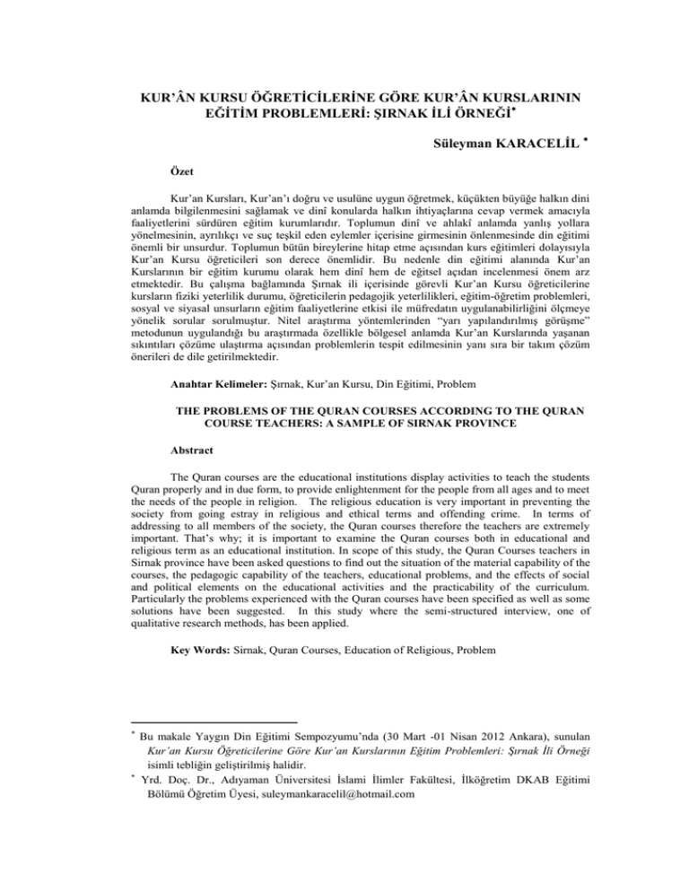 KUR’ÂN KURSU ÖĞRETİCİLERİNE GÖRE KUR’ÂN KURSLARININ EĞİTİM PROBLEMLERİ: ŞIRNAK İLİ ÖRNEĞİ Süleyman KARACELİL Özet Kur’an Kursları, Kur’an’ı doğru ve usulüne uygun öğretmek, küçükten büyüğe halkın dini anlamda bilgilenmesini sağlamak ve dinî konularda halkın ihtiyaçlarına cevap vermek amacıyla faaliyetlerini sürdüren eğitim kurumlarıdır. Toplumun dinî ve ahlakî anlamda yanlış yollara yönelmesinin, ayrılıkçı ve suç teşkil eden eylemler içerisine girmesinin önlenmesinde din eğitimi önemli bir unsurdur. Toplumun bütün bireylerine hitap etme açısından kurs eğitimleri dolayısıyla Kur’an Kursu öğreticileri son derece önemlidir. Bu nedenle din eğitimi alanında Kur’an Kurslarının bir eğitim kurumu olarak hem dinî hem de eğitsel açıdan incelenmesi önem arz etmektedir. Bu çalışma bağlamında Şırnak ili içerisinde görevli Kur’an Kursu öğreticilerine kursların fiziki yeterlilik durumu, öğreticilerin pedagojik yeterlilikleri, eğitim-öğretim problemleri, sosyal ve siyasal unsurların eğitim faaliyetlerine etkisi ile müfredatın uygulanabilirliğini ölçmeye yönelik sorular sorulmuştur. Nitel araştırma yöntemlerinden “yarı yapılandırılmış görüşme” metodunun uygulandığı bu araştırmada özellikle bölgesel anlamda Kur’an Kurslarında yaşanan sıkıntıları çözüme ulaştırma açısından problemlerin tespit edilmesinin yanı sıra bir takım çözüm önerileri de dile getirilmektedir. Anahtar Kelimeler: Şırnak, Kur’an Kursu, Din Eğitimi, Problem THE PROBLEMS OF THE QURAN COURSES ACCORDING TO THE QURAN COURSE TEACHERS: A SAMPLE OF SIRNAK PROVINCE Abstract The Quran courses are the educational institutions display activities to teach the students Quran properly and in due form, to provide enlightenment for the people from all ages and to meet the needs of the people in religion. The religious education is very important in preventing the society from going estray in religious and ethical terms and offending crime. In terms of addressing to all members of the society, the Quran courses therefore the teachers are extremely important. That’s why; it is important to examine the Quran courses both in educational and religious term as an educational institution. In scope of this study, the Quran Courses teachers in Sirnak province have been asked questions to find out the situation of the material capability of the courses, the pedagogic capability of the teachers, educational problems, and the effects of social and political elements on the educational activities and the practicability of the curriculum. Particularly the problems experienced with the Quran courses have been specified as well as some solutions have been suggested. In this study where the semi-structured interview, one of qualitative research methods, has been applied. Key Words: Sirnak, Quran Courses, Education of Religious, Problem Bu makale Yaygın Din Eğitimi Sempozyumu’nda (30 Mart -01 Nisan 2012 Ankara), sunulan Kur’an Kursu Öğreticilerine Göre Kur’an Kurslarının Eğitim Problemleri: Şırnak İli Örneği isimli tebliğin geliştirilmiş halidir. Yrd. Doç. Dr., Adıyaman Üniversitesi İslami İlimler Fakültesi, İlköğretim DKAB Eğitimi Bölümü Öğretim Üyesi, [email protected] KUR’ÂN KURSU ÖĞRETİCİLERİNE GÖRE KUR’ÂN KURSLARININ EĞİTİM PROBLEMLERİ: ŞIRNAK İLİ ÖRNEĞİ Giriş Genel olarak İslam eğitim tarihi boyunca Kur’ân’ın öğretilip ezberletildiği, dini inanç, ibadet ve ahlak bilgilerinin verildiği; Küttab, Sıbyan Mektebi, Daru’lhuffaz, Daru’l-Kur’ân, ve Daru’l-Kurrâ gibi çeşitli kurumlar Cumhuriyet dönemine Kur’ân Kursları adıyla intikal etmişlerdir. Cumhuriyet öncesinde din hizmetlerinin bağlı olduğu ana birim olan Şer’iye ve Evkâf ile Erkân-ı Harbiye-i Umumiye Vekâletleri 3 Mart 1924 tarih ve 429 sayılı kanunla ilga edilmiş, yerine Diyanet İşleri Başkanlığının kurulmasıyla İslam dininin eğitim ve din hizmetlerinin yürütülmesinde yeni bir dönem başlamıştır.1 Kur’ân Kursları, Kur’ân’ı doğru ve usulüne uygun öğretmek, küçükten büyüğe halkın dini anlamda bilgilenmesini sağlamak ve dinî konularda halkın ihtiyaçlarına cevap vermek amacıyla faaliyetlerini sürdüren eğitim kurumlarıdır.2 Bununla birlikte kurslar sadece dini bilgilerin öğretildiği eğitim kurumu olmayıp aynı zamanda kendine özgü yapılarıyla sosyal hayatta önemli bazı işlevler de taşımaktadırlar. Kur’an Kursu eğitiminin temel ilke ve hedefleri Diyanet İşleri Başkanlığınca şöyle tespit edilmiştir: Öğrencilerin İslam'ın temel kaynağı olan Kur'an-ı Kerim'i doğru ve usulüne uygun okuyabilmelerini sağlamak, ibadetleri yerine getirebilecek yeterlikte Kur'an ezberine sahip olabilmelerini sağlamak, ezber yeteneği bulunması ve istekli olmaları halinde, hafızlık yapmalarına yardımcı olmak, ibadetler ile ilgili bilgilerini davranışa dönüştürmek, Kur'an-ı Kerim'i mealinden okuma alışkanlığı kazanabilmelerine ve ondan yaşanan hayata ilişkin prensipler çıkarabilmelerine ayrıca Hz. Peygamber'in yaşantısından değerler üretebilmelerine yardımcı olmaktır. 3 Ülkemizde din eğitimi noktasında çok büyük bir boşluğu doldurmakta olan Kur’ân Kursları4, ilk kez dini tanıma, öğrenilen yanlışları düzeltme, bazıları için de var olan bilgilerine derinlik kazandırma rolünü icra etmektedir. Bu nedenle Kur’ân Kurslarında verilen dini eğitimin toplumsal yapıda önemli bir yeri olduğu kanaatindeyiz. Zira toplumun dinî ve ahlakî anlamda yanlış yollara yönelmesinin, ayrılıkçı ve suç teşkil eden eylemler içerisine girmesinin önlenmesinde din eğitimi önemli bir unsurdur. Toplumun bütün bireylerine hitap etme açısından kurs eğitimleri dolayısıyla Kur’ân Kursu öğreticileri büyük önem ifade etmektedir.