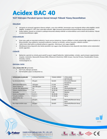 Acidex BAC 40 %57 Hidrojen Peroksit Içeren Genel Amaçlı Yüksek Yüzey Dezenfektan ÖZELLİKLER - 5 b Sudan b ç f b . .Y . UYGULAMALARI İç b ç ç k, kromO ç çf b eri ve . ç .A b ç ç . O b . ETKİNLİĞİ Bakterisit, sporisid f fb b f mayalar, mantarlar, Newcastle-Disease (ND), Influenza A (hominis), ECBO viruses, Vaccinal Viruses, Pseudorabies Viruses, Amoeba, Listeria monocytogeves vs. KİMYASAL YAPISI 100 g Acidex BAC 40 ç ; %57 H2O2 hidrojen peroksit. %3 K . UYGULAMA ALANLARI KONSANTRASYON TEMAS SÜRESİ S A 30 ppm S B dezenfeksiyonu K / Cerrahi alet dezenfekte U ç / Atmosfer Zemin ve Duvarlar K ç b. Stok su 150 ppm 200-400 ppm %1 %1 % 1-3 % 0.5-1 % 0.5-1 3-5 dk 3-5 dk 10-20 dk 10-20 dk 5 dk 10-20 dk 10-20 dk 20 ppm S B 50 ppm S / UYGULAMA METODLARI O /M Dozajlama Y Sprey O /M Sprey/sisleme Sisleme Sprey Sprey O lama O lama /M /M Acidex BAC 40 yüzey, alet ve f Acidex BAC 40 f ç ç b ö b . Y i uygun bir dezenfektan, zehirli olmayan Acidex BAC 40 b b ç . ç b b b rol oynar. SAKLAMA KOŞULLARI G M 2b UYARILAR K Gö K o 25 ‘ 4 . b ç ç ö . . . . .
