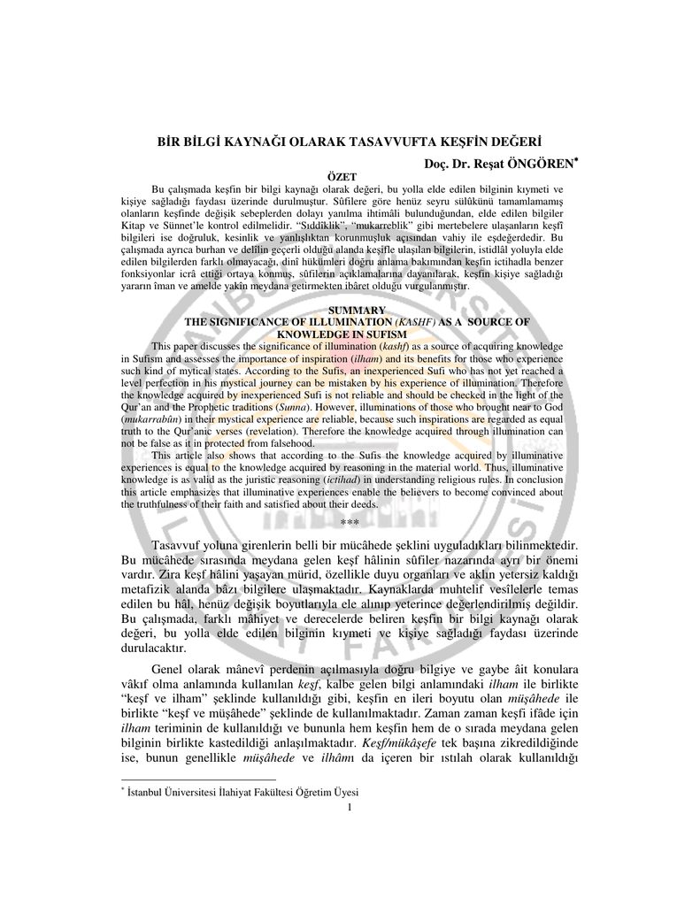 BİR BİLGİ KAYNAĞI OLARAK TASAVVUFTA KEŞFİN DEĞERİ Doç. Dr. Reşat ÖNGÖREN∗ ÖZET Bu çalışmada keşfin bir bilgi kaynağı olarak değeri, bu yolla elde edilen bilginin kıymeti ve kişiye sağladığı faydası üzerinde durulmuştur. Sûfilere göre henüz seyru sülûkünü tamamlamamış olanların keşfinde değişik sebeplerden dolayı yanılma ihtimâli bulunduğundan, elde edilen bilgiler Kitap ve Sünnet’le kontrol edilmelidir. “Sıddîklik”, “mukarreblik” gibi mertebelere ulaşanların keşfî bilgileri ise doğruluk, kesinlik ve yanlışlıktan korunmuşluk açısından vahiy ile eşdeğerdedir. Bu çalışmada ayrıca burhan ve delîlin geçerli olduğu alanda keşifle ulaşılan bilgilerin, istidlâl yoluyla elde edilen bilgilerden farklı olmayacağı, dinî hükümleri doğru anlama bakımından keşfin ictihadla benzer fonksiyonlar icrâ ettiği ortaya konmuş, sûfilerin açıklamalarına dayanılarak, keşfin kişiye sağladığı yararın îman ve amelde yakîn meydana getirmekten ibâret olduğu vurgulanmıştır. SUMMARY THE SIGNIFICANCE OF ILLUMINATION (KASHF) AS A SOURCE OF KNOWLEDGE IN SUFISM This paper discusses the significance of illumination (kashf) as a source of acquiring knowledge in Sufism and assesses the importance of inspiration (ilham) and its benefits for those who experience such kind of mytical states. According to the Sufis, an inexperienced Sufi who has not yet reached a level perfection in his mystical journey can be mistaken by his experience of illumination. Therefore the knowledge acquired by inexperienced Sufi is not reliable and should be checked in the light of the Qur’an and the Prophetic traditions (Sunna). However, illuminations of those who brought near to God (mukarrabûn) in their mystical experience are reliable, because such inspirations are regarded as equal truth to the Qur’anic verses (revelation). Therefore the knowledge acquired through illumination can not be false as it in protected from falsehood. This article also shows that according to the Sufis the knowledge acquired by illuminative experiences is equal to the knowledge acquired by reasoning in the material world. Thus, illuminative knowledge is as valid as the juristic reasoning (ictihad) in understanding religious rules. In conclusion this article emphasizes that illuminative experiences enable the believers to become convinced about the truthfulness of their faith and satisfied about their deeds. *** Tasavvuf yoluna girenlerin belli bir mücâhede şeklini uyguladıkları bilinmektedir. Bu mücâhede sırasında meydana gelen keşf hâlinin sûfiler nazarında ayrı bir önemi vardır. Zira keşf hâlini yaşayan mürid, özellikle duyu organları ve aklın yetersiz kaldığı metafizik alanda bâzı bilgilere ulaşmaktadır. Kaynaklarda muhtelif vesîlelerle temas edilen bu hâl, henüz değişik boyutlarıyla ele alınıp yeterince değerlendirilmiş değildir. Bu çalışmada, farklı mâhiyet ve derecelerde beliren keşfin bir bilgi kaynağı olarak değeri, bu yolla elde edilen bilginin kıymeti ve kişiye sağladığı faydası üzerinde durulacaktır. Genel olarak mânevî perdenin açılmasıyla doğru bilgiye ve gaybe âit konulara vâkıf olma anlamında kullanılan keşf, kalbe gelen bilgi anlamındaki ilham ile birlikte “keşf ve ilham” şeklinde kullanıldığı gibi, keşfin en ileri boyutu olan müşâhede ile birlikte “keşf ve müşâhede” şeklinde de kullanılmaktadır. Zaman zaman keşfi ifâde için ilham teriminin de kullanıldığı ve bununla hem keşfin hem de o sırada meydana gelen bilginin birlikte kastedildiği anlaşılmaktadır. Keşf/mükâşefe tek başına zikredildiğinde ise, bunun genellikle müşâhede ve ilhâmı da içeren bir ıstılah olarak kullanıldığı ∗ İstanbul Üniversitesi İlahiyat Fakültesi Öğretim Üyesi 1