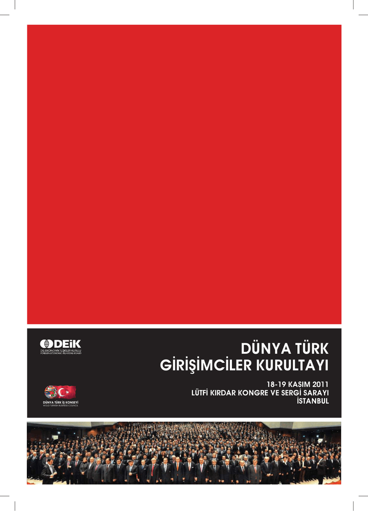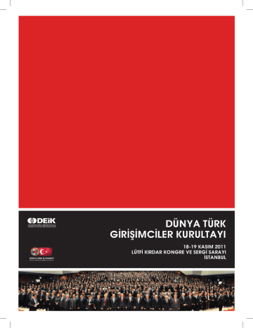 DÜNYA TÜRK GúRúûúMCúLER KURULTAYI DÜNYA TÜRK úû KONSEYú WOLD TURKISH BUSINESS COUNCIL 18-19 KASIM 2011 LÜTFú KIRDAR KONGRE VE SERGú SARAYI úSTANBUL DEúK Yay×nlar× 778-2011/16-a 3 ISBN: 978-605-5979-11-9 DEúK Kurumsal Tan×t×m Serisi / DEúK Corporate Series DÜNYA TÜRK GúRúûúMCúLER KURULTAYI DÜNYA TÜRK GúRúûúMCúLER KURULTAYI 18-19 KASIM 2011 LÜTFú KIRDAR KONGRE VE SERGú SARAYI úSTANBUL DÜNYA TÜRK úû KONSEYú WOLD TURKISH BUSINESS COUNCIL 1 D×ü úliükiler Ekonomik Kurulu DÜNYA TÜRK GúRúûúMCúLER KURULTAYI D×ü úliükiler Ekonomik Kurulu 2 DÜNYA TÜRK GúRúûúMCúLER KURULTAYI 3 D×ü úliükiler Ekonomik Kurulu DÜNYA TÜRK GúRúûúMCúLER KURULTAYI úÇúNDEKúLER 7 Önsöz 8 Rifat Hisarc×kl×oùlu 10 Rona Y×rcal× 12 Muhtar Kent 14 Program / “Dünya Türk Giriüimciler Kurultay×” 21 Çal×ütay Aç×l×ü 22 Rona Y×rcal× 25 Kemal Yurtnaç 27 M. Rifat Hisarc×kl×oùlu 31 Zafer Çaùlayan 37 Eüzamanl× Bölgesel Oturumlar 38 Amerika ve Latin Oturumu 62 Avrasya Oturumu 82 Asya-Pasifik Oturumu 110 Afrika-Ortadoùu-Körfez Oturumu 126 Avrupa ve Balkanlar Oturumu 141 Profesyoneller Oturumu 169 Gala Yemeùi / Plaket Takdimi D×ü úliükiler Ekonomik Kurulu 4 DÜNYA TÜRK GúRúûúMCúLER KURULTAYI 175 Kurultay Aç×l×ü× 179 Rona Y×rcal× 182 M. Rifat Hisarc×kl×oùlu 186 Zafer Çaùlayan 190 Recep Tayyip Erdoùan 203 únteraktif Oturum 249 Seçimler 257 Komite Seçimleri 260 DEúK – Dünya Türk úü Konseyi (DTúK) Yönetim Kurulu 2011-2013 262 DEúK - Dünya Türk úü Konseyi (DTúK) Bölge Komiteleri 2011-2013 263 DEúK/DTúK Afrika-Ortadoùu-Körfez Bölge Komitesi 264 DEúK - DTúK Amerika Bölge Komitesi 265 DEúK - DTúK Asya Pasifik Bölge Komitesi 266 DEúK - DTúK Avrasya Bölge Komitesi 267 DEúK - DTúK Avrupa Bölge Komitesi 268 DEúK - DTúK Balkanlar Bölge Komitesi 270 DEúK – Dünya Türk úü Konseyi Yüksek ústiüare Kurulu (2011 – 2013) 272 Dünya Türk Giriüimciler Kurultay× úkili úü Görüümeleri Raporu 274 Dünya Türk Giriüimciler Kurultay× 18 – 19 Kas×m 2011 / Kavramsal Not 5 D×ü úliükiler Ekonomik Kurulu DÜNYA TÜRK GúRúûúMCúLER KURULTAYI D×ü úliükiler Ekonomik Kurulu 6 DÜNYA TÜRK GúRúûúMCúLER KURULTAYI Önsöz M. Rifat Hisarc×kl×oùlu TOBB/DEúK/DTúK Baükan× Rona Y×rcal× DEúK úcra Kurulu Baükan× Muhtar Kent DTúK Yüksek ústiüare Kurulu Baükan× 7 D×ü úliükiler Ekonomik Kurulu DÜNYA TÜRK GúRúûúMCúLER KURULTAYI ÖNSÖZ M. Rifat Hisarc×kl×oùlu TOBB/DEúK-DTúK Baükan× Son 10 y×lda gerçekleütirdiùi yap×sal reformlar ve at×l×mlarla bölgesel bir güç, küresel bir oyuncu haline gelen Türkiye 2023 y×l×nda dünyan×n en büyük 10 ekonomisi aras×na girmeyi hedefliyor. Türk özel sektörü olarak bu hayalimize ulaümak için sahip olduùumuz insan gücümüzü organize etmemiz, ayn× milli hedefler etraf×nda birleütirmemiz ve niteliùini artt×rmam×z gerektiùine inan×yoruz. Bu amaçla 2009 y×l×nda “art×k biz de var×z” dedik ve yer kürenin dört bir köüesinde faaliyet gösteren Türk giriüimcilerini ve profesyonellerini Dünya Türk Giriüimciler Kurultay×’nda bir araya getirdik. Bu Kurultay’da say×lar× 6 milyona yaklaüan Türk diasporas×n× stratejik bir güç olarak konumland×rmak için tek bir üemsiye alt×nda toparlad×k; diaspora kavram×n× ilk defa müspet bir kavram olarak kulland×k. Hayallerimizi hedef, hedeflerimizi gerçek yapmak için 2011 y×l×nda 90 ülkeden 2200 Türk giriüimci ve profesyoneli tekrar ústanbul’da bir araya getirdik. Deùiüimin öncüsü olma ve deùiüimi yönetme yolunda daha etkin örgütlenme ve stratejileri tasarlamak için sürdürülebilir diaspora eylem plan×n× kamu-özel sektör diyaloùu ve ortak ak×l ile belirledik; ald×ù×m×z kararlar× ve belirlediùimiz eylem planlar×n× siyasi otoritelerimizin dikkatine sunduk. Bundan sonraki temel önceliùimiz ülkemizin dünyan×n en büyük 10 ekonomisi aras×na girmesi yolunda tasarlad×ù×m×z sürdürülebilir diaspora stratejisini uygulamaya sokmak olacak. Deùiüen Dünyada Yükselen Türkiye’nin daha büyük küresel baüar× öyküleri yazmaya devam etmesi için hep birlikte çal×ümaya devam edeceùiz. Gelin ortak geleceùimizi birlikte üekillendirelim! D×ü úliükiler Ekonomik Kurulu 8 DÜNYA TÜRK GúRúûúMCúLER KURULTAYI 9 D×ü úliükiler Ekonomik Kurulu DÜNYA TÜRK GúRúûúMCúLER KURULTAYI ÖNSÖZ Rona Y×rcal× DEúK úcra Kurulu Baükan× Küresel rekabette en stratejik gücümüz olan insan×m×z× en etkin üekilde örgütleme ve harekete geçirme ihtiyac×na cevap vermek amac×yla 2008 y×l×nda DEúK çat×s× alt×nda kurulan Dünya Türk úü Konseyi (DTúK) yurt d×ü×nda faaliyet gösteren Türk giriüimci ve profesyonellerinin tek bir çat× alt×nda toparlanmas× için önemli baüar×lara imza att×. DTúK 2009 y×l×nda gerçekleütirdiùimiz Dünya Türk Giriüimciler Kurultay× ile demokratik seçimlerle kendi yönetimini oluüturdu; bölgesel teükilatlanmas×n× tamamlad×. 2011 y×l×nda 90 ülkeden 2200 giriüimciyi, Baübakan×m×z×, hükümetimizin sayg×deùer bakanlar×n× ústanbul’da bir ara getiren kurultayda Türk diasporas×n×n kurumsallaümas×, etkin lobi faaliyetinde bulunma becerisini ve lobi faaliyetleri kapasitesinin geliütirilmesi ve sorunlar×n×n çözümü için çal×ümalar yap×ld×, kararlar al×nd×. DTúK’in kurumsal gücü ve kurultaylar×n dinamizmiyle Vancouver’dan Vladivostok’a, Helsinki’den Cape Town’a kadar olan geniü coùrafya’da iü yapan, baüar× öykülerine imza atan Türk giriüimci ve profesyonellerle ulusal hedeflerimiz doùrultusunda çal×ümaya devam edeceùiz, ayd×nl×k yar×nlara birlikte yürüyeceùiz. Yolumuz aç×k olsun! D×ü úliükiler Ekonomik Kurulu 10 DÜNYA TÜRK GúRúûúMCúLER KURULTAYI 11 D×ü úliükiler Ekonomik Kurulu DÜNYA TÜRK GúRúûúMCúLER KURULTAYI ÖNSÖ