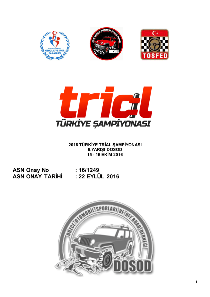 2016 TÜRKİYE TRİAL ŞAMPİYONASI 6.YARIŞI DOSOD 15 - 16 EKİM 2016 ASN Onay No ASN ONAY TARİHİ : 16/1249 : 22 EYLÜL 2016 1 İÇİNDEKİLER I. A) PROGRAM II. ORGANİZASYON 2.1 ORGANİZASYON KOMİTESİ 2.2 ADRESLER, RESMİ İLAN YERİ VE YARIŞ MERKEZİ 2.3 YARIŞMA GÖREVLİLERİ III. GENEL HÜKÜMLER 3.1 YARIŞMANIN TARİFİ, GEÇERLİLİĞİ VE YERİ 3.2 KATILABİLİR ARAÇLAR 3.3 KATILABİLİR YARIŞMACILAR 3.4 KAYIT FORMU VE KAYITLAR 3.5 KAYIT ÜCRETİ VE SİGORTA 3.6 REKLAMLAR 3.7 EK KURALLARIN YORUMU, UYG. VE DEĞİŞİKLİĞİ IV. İTİRAZLAR VE TEMYİZ V. DERECELENDİRME ÖDÜLLER VE ÖDÜL TÖRENİ 5.1 DERECELENDİRME 5.2 ÖDÜL TÖRENİ VI. TRIAL YARIŞLARINDA UYGULANAN KAPI GEÇİŞ KURALLARI VII. YARIŞMANIN STARTI VE İŞLEYİŞİ VIII. TRIAL CEZA TABLOSU XII. HARİTALAR 2 I. A) PROGRAM KAYITLARIN AÇILMASI – www.dosod.biz 15 EYLÜL 2016 KAYITLARIN KAPANMASI – www.dosod.biz 13 EKİM 2016 PERŞEMBE SAAT 18.00 KAYIT LİSTESİNİN İLANI – www.dosod.biz 14 EKİM 2016 CUMA SAAT 13.00 GEÇİCİ START LİSTESİNİN İLANI - www.dosod.biz 14 EKİM 2016 CUMA SAAT 17:00 GÖREVLİLER İLE BRİFİNG – ( HIZEL OTEL TOPLANTI SALONU ) 14 EKİM 2016 CUMA 18:30 DÖKÜMAN DAĞITILMASI – İDARİ VE TEKNİK KONTROL (YARIŞ MERKEZİ ) 15 EKİM CUMARTESİ 08:00 11:00 ANTRENMANLAR ve YOL KEŞFİ 15 EKİM 2016 CUMARTESİ 09:30 - 11:30 …………Yaya 1.SPOR KOMİSERLERİ KURULU TOPLANTISI – 15 EKİM 2016 CUMARTESİ 11:15…………… Yarış Merkezi Toplantı Odası YARIŞMACILAR İLE BRİFİNG – 15 EKİM 2016 CUMARTESİ 11:45….…………..….. Yarış Merkezi KESİN START LİSTESİNİN İLANI – SEKRETERYA 15 EKİM 2016 CUMARTESİ 12:15 YARIŞMANIN 1.AYAK STARTI 15 EKİM CUMARTESİ 13:30 YARIŞMANIN 1. GÜN SONU FİNİŞİ 15 EKİM CUMARTESİ 17:00 YARIŞMANIN 1. GÜN GEÇİCİ NETİCELERİN İLANI 15 EKİM CUMARTESİ 17:30 (Yarış Merkezi İlan Panosu) YARIŞMANIN 1. GÜN KESİN NETİCELERİN İLANI 15 EKİM CUMARTESİ 18:00 (Yarış Merkezi İlan Panosu) YARIŞMANIN 2. GÜN START LİSTESİNİN İLANI 16 TEMMUZ CUMARTESİ 18:00 (Yarış Merkezi İlan Panosu) YARIŞMANIN 2.AYAK STARTI 16 EKİM PAZAR 11:00 YARIŞMANIN FİNİŞİ 16 EKİM 2016 17:30 GEÇİCİ NETİCELERİN İLANI – Yarış Merkezi İlan Panosu 16 EKİM 2016 18:00 KESİN NETİCELERİN İLANI - Yarış Merkezi İlan Panosu 16 EKİM 2016 18:30 ÖDÜL TÖRENİ – Yarış Merkezi 16 EKİM 2016 19:00 3 II – ORGANİZASYON Türkiye Trial Şampiyonası 6. Yarışı DOSOD (Düzce Otomobil Sporları ve offroad kulübü tarafından 15 – 16 EKİM 2016 tarihlerinde Düzce İli Kaynaşlı ilçesinde yer alan Motor Sporları Bölgesinde organize edilecektir. Bu yarışma FIA Kuralları, Uluslararası Spor Yasası (CSI) ve ekleri, TOSFED Yarışma Kuralları, TOSFED 2016 Yarışma Ek Düzenlemeleri, Ulusal Yarışmalar Yönetmeliği ve ilgili TOSFED kuralları ve talimatları uyarınca düzenlenmektedir. 2.1. ORGANİZASYON KOMİTESİ EROL BAYRAKTAR BEYTULLAH ÖZENİR İSMAİL AYDIN ALİ EROĞLU Organizasyon Komitesi Baskanı Yarışma Direktörü Yarışma Direktör Yardımcısı Yarışma Genel Sekreteri Organizasyon Komitesi yarışma sırasında yarışmacıların sürücülerin ve servis elemanlarının uğrayabilecekleri kazalar ve hasarlardan dolayı yarışmanın gerektirdiği tüm emniyet tedbirlerinin alınmış olması koşulu ile maddi manevi hiçbir sorumluluk yüklenmezler. Yarışmacı ve sürücüler kayıt formunu imzalamış olmakla bu yönetmelik ve dayandığı ilgili tüm kuralları okumuş, anlamış ve uygulayacaklarını kabul etmiş sayılırlar. 4 2.2. ADRESLER, RESMİ İLAN YERİ VE YARIŞ MERKEZİ A. SEKRETERYA TEL : 0 532 769 58 58 / 0 542 497 78 50 ADRES : Yeni Sanayi MERKEZ / DÜZCE Web Sitesi : www.dosod.biz Mail Adresi : [email protected] B. YARIŞ SIRASINDA MERKEZ (16 – 17 TEMMUZ 2016 MOTOR SPORLARI MERKEZİ KAYNAŞLI) TEL : 0532 – 769 58 58 C. RESMİ İLAN YERLERİ 16 – 17 TEMMUZ 2016 tarihleri arası www.dosod.biz https://www.facebook.com/groups/duzceoffroadteam/ 15 EKİM 2016 DOSOD KAYNAŞLI MOTORSPORLARI MERKEZİ TESİSLERİ 16 EKİM 2016 DOSOD KAYNAŞLI MOTORSPORLARI MERKEZİ TESİSLERİ Yarışma Direktörü Beytullah ÖZENİR (0 542 – 497 78 50) Yarışma Direktör Vekili İsmail AYDIN ( 0 532 325 51 61) Yarışma Direktör Yardımcısı Zafer ALKAN 5 2.3 YARIŞMA GÖREVLİLERİ Spor Komiserleri Başkanı Spor Komiseri Spor Komiseri Spor Komiserleri Sekreteri : Burak Emre BAYRAKTAR : Fırat Zafer TOGAY : GÜRBÜZ ÖZKURT : ÖMER CİVELEK TOSFED Gözlemcisi TOSFED Teknik Kontrol Sorumlusu Teknik Kontrol Sorumlusu Yrd. : NURİ PERİ (TOSFED) : Kenan CANAKÇAY (TOSFED) : SERKAN ŞAHİN – ERHAN OZAN Yarışma Direktörü Yarışma Direktör Vekili Yarışma Direktör Yardımcısı (idari) Yarışmacılar ile ilişkiler sorumlusu ACİL MÜDAHLE ETAP İÇİ(FIV – SAĞLIK) Lojistik Sorumlusu Yarışma Genel Sekreteri Yarışma Güvenlik Sorumlusu Servis Alanı Sorumlusu Neticelendirme Sorumlusu DOSOD TRİAL etabı Sorumlusu Basın Sorumlusu Yarışma Doktoru Sağlık Hizmetleri : BEYTULLAH ÖZENİR : İSMAİL AYDIN : ZAFER ALKAN : MEHMET ÜNAL : MEHMET KORKMAZ : EVREN ESER – İSMAİL AKIN : ALİ EROĞLU : TUĞRUL SAĞLAM : ENES KESKİN : ÖNDER ÖNER : FERDİ KILIÇOĞLU : TİMUR YAPICI : BETÜL KARATAŞ : 112 ( TOSFED) (TOSFED) 6 YARIŞMACILAR İLE İLİŞKİLER MEHMET ÜNAL TEL : 0532 – 647 00 87 III - GENEL HÜKÜMLER 3.1 YARIŞMANIN TARİFİ, GEÇERLİLİĞİ VE YERİ Yarışmanın Adı : Türkiye TRİAL Şampiyonası 6. Ayak Organizatör : DOSOD ( Düzce otomobil Sporları ve Offroad Kulübü) Yarışma Yeri : Kaynaşlı Motor Sporları Merkezi Yarışmanın A.O.K. Katsayısı : 1 Ulusal Spor Otoritesi : TOSFED ASN Onay No : ASN Onay Tarihi : 7 Yarışın Tanımı ve Etaplar DOSOD TRİAL ETABI (Cumartesi ) 15-EKİM-2016 CUMARTESİ Düzce ye bağlı Kaynaşlı ilçesinde bulunan Motor sporları merkezinde verilecek olan DOSOD trial etabı yarış merkezinin he