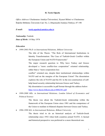 H. Tarık Oğuzlu Office Address: Uluslararası Antalya Üniversitesi, Siyaset Bilimi ve Uluslararası İlişkiler Bölümü, Üniversite Cad. No. 2, Döşemealtı/Antalya-Türkiye, 07 190 E-mail: tarı[email protected] Nationality: Turkish Date of Birth: 14 May 1974 Education 1999-2003 Ph.D. in International Relations, Bilkent University The title of the Thesis: “The Role of International Institutions in Identity Transformation: The Case of Turkish-Greek Conflict within the European Union and NATO Frameworks” The major research question is: Why have Turkey and Greece developed a “more conflict-less cooperation” oriented relationship, rather than a “more cooperation-less conflict” oriented one, despite their institutional relationships within NATO and on the margins of the European Union? The dissertation explores the role of NATO and the EU in the (re) construction of selfhelp based security relationship between Greece and Turkey. My dissertation is accessible in pdf format through the address below: http://www.thesis.bilkent.edu.tr/0002381.pdf 1999-2000 MSc. in International Relations, London School of Economics and Political Science The thesis was about the Turkish-Greek relationship within the framework of the European Union since 1981 and the competence of the Union to mediate in bilateral disputes between Greece and Turkey. 1996-1998 MA. in International Relations, Bilkent University The thesis tried to do an historical analysis of Turkish-Greek relationship since 1952 when both countries joined NATO. A factual and historical perspective was preferred to a more theoretical one. 1 1992-1996 BA. in International Relations, Bilkent University I was on full scholarship during the entire undergraduate period. Areas of Interests International Relations Theories Foreign Policy Analysis Security studies European Union, European Union foreign, security and defense policies Turkish-Greek relations, Turkey-US relations, The Cyprus dispute, Transatlantic relations and NATO Turkey’s relations with NATO and the European Union Middle East Politics, Iraq, northern Iraq, Turkomans English, fluent in writing, reading and speaking German, fluent in reading and writing, intermediate in speaking Greek, intermediate in reading Languages Working experience Chair of the Department of Political Science and International Relations at Antalya International University, Director of the Center for Social, Economic and Political Research at Antalya International University (SEPAM, sepam.antalya.edu.tr) Since March 2013 working as full professor in Antalya International University February 2012-March 2013, Associate Professor in the Department of Political Science and International Relations at Antalya International University 2 From January 2008 onwards, acting as Associate Professor. This title was granted to him by the Higher Education Council in Turkey. February 2006-January 2012, Assistant Professor in International Relations at Bilkent University, Ankara, Turkey February 2005-December 2005, Teaching International Relations at the Turkish Military Academy as part of military service February 2004-January 2006: Assistant Professor in the Department of International Relations at Bilkent University October 2003-December 2004, Visiting Senior Fellow at the Centre for European Integration Studies of the University of Bonn, Germany. Research Assistant at Bilkent University, 1996-2002 Full Scholarship during the entire university education Awarded the Jean Monnet Scholarship of the European Union for Rewards the academic year of 1999-2000 Visited the State University of New York at Binghamton as a Levin Fellow in September 16-October 6, 2009 Publications Books Turkey’s Rise as an Emerging Power, eds. Paul Kubicek, Emel Parlar Dal and H. Tarık Oğuzlu, London and New York: Routledge, 2015 Tarık Oğuzlu (ed.), Değişen Küresel Dengeler ve Bölgesel Gelişmeler Işığında Türk Dış Politikası, Antalya: Uluslararası Antalya Üniversitesi Yayınları, 2014. Tarık Oğuzlu (ed.), Güncel Gelişmeler Işığında Türk Dış Politikası: Zorluklar ve Fırsatlar Sempozyumu, Antalya: Uluslararası Antalya Üniversitesi Yayınları, 2013 3 Refereed journals, Social Science Citation Index (SCCI) “The Clash of Security Identities: The Question of Turkey's Membership in the European Union,” International Journal, Vol. 57, No. 4, 2002, pp: 579-603. “An Analysis of Turkey’s Prospective Membership in the European Union from a ‘Security’ Perspective’”, Security Dialogue, Vol. 34, No. 3, 2003, pp: 285-299. “Changing Dynamics of Turkey’s U.S. and EU Relations,” Middle East Policy Vol. XI, No. 1, February 2004, pp: 98-105. “The Changing Turkish Approach towards the European Union after 9/11,” International Journal, Vol. 61, No. 1, Winter 20052006, pp. 83-104. “Soft Power in Turkish Foreign Policy,” Australian Journal of International Affairs, Vol. 61, No.1. March 2007, 81-97. “Middle Easternization of Turkey’s Foreign Policy: Does Turkey Dissociate from the West?” Turkish Studies, Vol. 9, No. 1, 2008, pp. 3-20. With Mustafa Kibaroglu, “Incompatibilities in Turkish and European security cultures diminish Turkey’s Prospects of EU membership,” Middle Eastern Studies, November 2008, Vol. 44. No. 6, pp. 945-962. With Burak Bilgehan Ozpek, “Turkey’s Europeanization,” International Journal, Vol. 63, No. 4, Autumn 2008, pp. 991-1009. “The Importance of Being European: Turkey, the EU and the Middle East” Book Review, Turkish Studies, Vol. 9, No. 3, September 2008, pp. 529-534. With Mustafa Kibaroglu, “Turkey and the US in the 21st Century: Friends or Foes?” Korean Journal of Defense Analysis, Vol. 20, No. 4, December 2008, pp. 357-372. “Tormented by History Nationalisms in Greece and Turkey” Book Review, Turkish Studies, Vol. 10, No. 3, September 2009, pp. 527532. 4 With Mustafa Kibaroğlu, ‘Is Westernization Process Losing Pace in Turkey: Who is to blame?