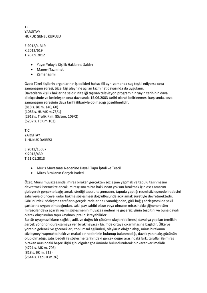 T.C YARGITAY HUKUK GENEL KURULU E:2012/4-319 K:2012/619 T:26.09.2012 Yayın Yoluyla Kişilik Haklarına Saldırı Manevi Tazminat Zamanaşımı Özet: Tüzel kişilerin organlarının işledikleri haksız fiil aynı zamanda suç teşkil ediyorsa ceza zamanaşımı süresi, tüzel kişi aleyhine açılan tazminat davasında da uygulanır. Davacıların kişilik haklarına saldırı niteliği taşıyan televizyon programının yayın tarihinin dava dilekçesinde ve kesinleşen ceza davasında 15.06.2003 tarihi olarak belirlenmesi karşısında, ceza zamanaşımı süresinin dava tarihi itibariyle dolmadığı gözetilmelidir. (818 s. BK m. 140, 60) (1086 s. HUMK m.75/1) (2918 s. Trafik K.m. 85/son, 109/2) (5237 s. TCK m.102) T.C YARGITAY 1.HUKUK DAİRESİ E:2012/13587 K:2013/439 T:21.01.2013 Muris Muvazaası Nedenine Dayalı Tapu İptali ve Tescil Miras Bırakanın Gerçek İradesi Özet: Muris muvazaasında, miras bırakan gerçekten sözleşme yapmak ve tapulu taşınmazını devretmek istemekte ancak, mirasçısını miras hakkından yoksun bırakmak için esas amacını gizleyerek gerçekte bağışlamak istediği tapulu taşınmazını, tapuda yaptığı resmi sözleşmede iradesini satış veya ölünceye kadar bakma sözleşmesi doğrultusunda açıklamak suretiyle devretmektedir. Görünürdeki sözleşme tarafların gerçek iradelerine uymadığından, gizli bağış sözleşmesi de şekil şartlarına uygun olmadığından, saklı pay sahibi olsun veya olmasın miras hakkı çiğnenen tüm mirasçılar dava açarak resmi sözleşmenin muvazaa nedeni ile geçersizliğinin tespitini ve buna dayalı olarak oluşturulan tapu kaydının iptalini isteyebilirler. Bu tür uyuşmazlıkların sağlıklı, adil, ve doğru bir çözüme ulaştırılabilmesi, davalıya yapılan temlikin gerçek yönünün duraksamaya yer bırakmayacak biçimde ortaya çıkarılmasına bağlıdır. Ülke ve yörenin gelenek ve görenekleri, toplumsal eğilimleri, olayların olağan akışı, miras bırakanın sözleşmeyi yapmakta haklı ve makul bir nedeninin bulunup bulunmadığı, davalı yanın alış gücünün olup olmadığı, satış bedeli ile sözleşme tarihindeki gerçek değer arasındaki fark, taraflar ile miras bırakan arasındaki beşeri ilişki gibi olgular göz önünde bulundurularak bir karar verilmelidir. (4721 s. MK m. 706) (818 s. BK m. 213) (2644 s. Tapu K.m.26) T.C YARGITAY 1.HUKUK DAİRESİ E:2013/639 K:2013/1858 T:13.02.2013 Elatmanın Önlenmesi ve Ecrimisil Davası Görevli Mahkeme Özet: Boşanma davasında önce davacı ile davalı tarafından ortak mesken olarak kullanılan mülkiyeti davacıya ait olan taşınmazda davalının oturması üzerine, davacı tarafından elatmanın önlenmesi ve ecrimisil davası açılmış olup, Türk Medeni Kanununun 683. Maddesinden kaynaklanan mülkiyet hakkına dayanan davanın aile mahkemesinde görülmeyip, genel mahkemelerde, çözüme kavuşturulması gerekir. Davalının kişisel bir hakkı var ise ayrı bir dava yolu ile isteyebilir. (4721 s. MK m.683) (6100 s. HMK m.26) (1086 s. HUMK m. 74) T.C YARGITAY 2.HUKUK DAİRESİ E:2012/3966 K:2013/5993 T:07.03.2013 Soybağının Reddi Gider Avansı-Delil Avansı Hâkimin Re’sen Araştırma İlkesi Özet: Davacı, nüfus kayıtlarında babası görünen kişinin babası olmadığını ileri sürerek soybağının reddini talep etmiş, mahkemece davacının gider avansını süresinde yatırmaması nedeniyle davanın usulden reddine karar verilmiş ise de, yatırılması istenen avans, DNA testi için gereken giderler olup, delil avansı niteliğindedir. Delil avansı dava şartlarından olmadığından, süresinde yatırılmamasının yaptırımı, o delilden vazgeçilmiş sayılmaktır. Ayrıca, kamu düzenine ilişkin olan bu tür davalarda, hâkim maddi olguları re’sen araştırır ve kanıtları serbestçe takdir eder. Re’sen yapılması emredilen işlemin gerektirdiği masrafın, iki taraftan birinin veya her ikisinin ödemesine karar verildiğin halde, tayin olunan süre içinde yatırılmaması durumunda, ilerde haksız çıkan taraftan alınmak üzere Devlet hazinesinden karşılanmasına karar verilir. (4721 s. MK m. 286,284) (6100 s. HMK m.324,325) T.C YARGITAY 2.HUKUK DAİRESİ E:2012/14579 K:2013/6846 T:13.03.2013 Velayetin Kaldırılması Re’sen Araştırma İlkesi Basit Yargılama Usulü Savunma ve İspat Hakkının Tanınmaması Özet: Velayete ilişkin davalar, basit yargılama usulüne tabi olup, mahkeme mümkün olan hallerde, tarafları duruşmaya davet etmeden dosya üzerinden karar verir. Ancak, basit yargılama usulüne tabi bir işin duruşmasız incelenebilmesi öncelikle kanunen mümkün olmalıdır. Velayete ilişkin davalar kamu düzeniyle doğrudan ilgili olduğundan, re’sen araştırma ilkesi geçerli olup, davanın bu niteliği, duruşmalı inceleme yapılmasını, delil toplanmasını ve ayrıntılı araştırmayı gerektirir. Mahkemece, velayetin kaldırılmasına lüzum bulunup bulunmadığına ilişkin vesayet makamının ihbar yazısı ve tensip tutanağı, velayet hakkına sahip olan davalı babaya tebliğ edilmiş, davalı iki haftalık cevap müddeti içinde davaya cevap vermiştir. Başka yer mahkemesi vasıtasıyla verilen cevap dilekçesinin mahkemeye ulaşması beklenmeden dosya ele alınıp, duruşma açılmadan ve davalıya savunma ve savunmasını ispat hakkı tanınmadan karar verilmesi yasaya aykırıdır. (6100 s. HMK m.382,320,317,27) T.C YARGITAY 3.HUKUK DAİRESİ E:2012/22679 K:2013/1036 T:23.01.2013 İtirazın İptali Gider Avansı-Delil İkamesi Avansı Dava Şartı Kesin Süre Özet:6100 sayılı Kanun hükümleri, tamamlanmış işlemleri etkilememek kaydıyla derhal yürürlüğe girmiştir. Gider avansı dava şartlarından olup, davanın açılması sırasında alınması şart olmadığından mahkeme, sonradan da bu eksikliği kesin süre vererek ikmal ettirebilir. Bu süre içinde dava şartı eksikliği tamamlanmaz ise dava