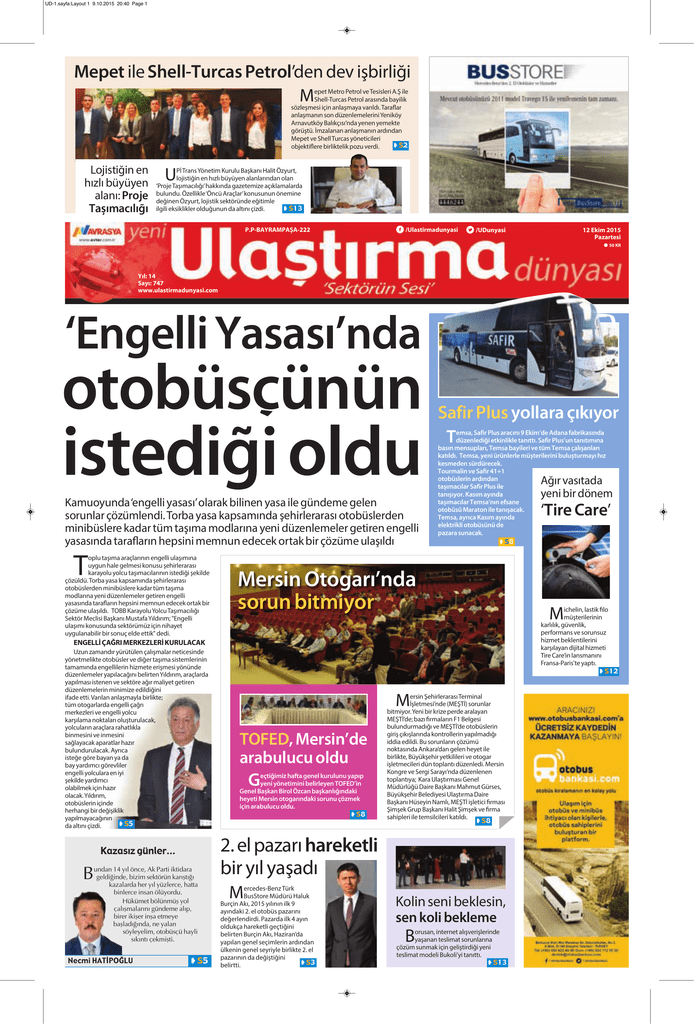 UD-1.sayfa:Layout 1 9.10.2015 20:40 Page 1 Mepet ile Shell-Turcas Petrol’den dev işbirliği M epet Metro Petrol ve Tesisleri A.Ş ile Shell-Turcas Petrol arasında bayilik sözleşmesi için anlaşmaya varıldı. Taraflar anlaşmanın son düzenlemelerini Yeniköy Arnavutköy Balıkçısı’nda yenen yemekte görüştü. İmzalanan anlaşmanın ardından Mepet ve Shell Turcas yöneticileri ç S2 objektiflere birliktelik pozu verdi. Lojistiğin en hızlı büyüyen alanı: Proje Taşımacılığı U Pİ Trans Yönetim Kurulu Başkanı Halit Özyurt, lojistiğin en hızlı büyüyen alanlarından olan ‘Proje Taşımacılığı’ hakkında gazetemize açıklamalarda bulundu. Özellikle ‘Öncü Araçlar’ konusunun önemine değinen Özyurt, lojistik sektöründe eğitimle ç S13 ilgili eksiklikler olduğunun da altını çizdi. P.P-BAYRAMPAŞA-222 f /Ulastirmadunyasi l /UDunyasi 12 Ekim 2015 Pazartesi l 50 KR Y›l: 14 Say›: 747 www.ulastirmadunyasi.com ‘Engelli Yasası’nda otobüscünün istediği oldu Kamuoyunda ‘engelli yasası’ olarak bilinen yasa ile gündeme gelen sorunlar çözümlendi. Torba yasa kapsamında şehirlerarası otobüslerden minibüslere kadar tüm taşıma modlarına yeni düzenlemeler getiren engelli yasasında tarafların hepsini memnun edecek ortak bir çözüme ulaşıldı T oplu taşıma araçlarının engelli ulaşımına uygun hale gelmesi konusu şehirlerarası karayolu yolcu taşımacılarının istediği şekilde çözüldü. Torba yasa kapsamında şehirlerarası otobüslerden minibüslere kadar tüm taşıma modlarına yeni düzenlemeler getiren engelli yasasında tarafların hepsini memnun edecek ortak bir çözüme ulaşıldı. TOBB Karayolu Yolcu Taşımacılığı Sektör Meclisi Başkanı Mustafa Yıldırım; "Engelli ulaşımı konusunda sektörümüz için nihayet uygulanabilir bir sonuç elde ettik" dedi. Safir Plus yollara çıkıyor T emsa, Safir Plus aracını 9 Ekim’de Adana fabrikasında düzenlediği etkinlikle tanıttı. Safir Plus’un tanıtımına basın mensupları, Temsa bayileri ve tüm Temsa çalışanları katıldı. Temsa, yeni ürünlerle müşterilerini buluşturmayı hız kesmeden sürdürecek. Tourmalin ve Safir 41+1 otobüslerin ardından taşımacılar Safir Plus ile tanışıyor. Kasım ayında taşımacılar Temsa’nın efsane otobüsü Maraton ile tanışacak. Temsa, ayrıca Kasım ayında elektrikli otobüsünü de pazara sunacak. ç S8 Mersin Otogarı’nda sorun bitmiyor ENGELLİ ÇAĞRI MERKEZLERİ KURULACAK Uzun zamandır yürütülen çalışmalar neticesinde yönetmelikte otobüsler ve diğer taşıma sistemlerinin tamamında engellilerin hizmete erişmesi yönünde düzenlemeler yapılacağını belirten Yıldırım, araçlarda yapılması istenen ve sektöre ağır maliyet getiren düzenlemelerin minimize edildiğini ifade etti. Varılan anlaşmayla birlikte; tüm otogarlarda engelli çağrı merkezleri ve engelli yolcu karşılama noktaları oluşturulacak, yolcuların araçlara rahatlıkla binmesini ve inmesini sağlayacak aparatlar hazır bulundurulacak. Ayrıca isteğe göre bayan ya da bay yardımcı görevliler engelli yolculara en iyi şekilde yardımcı olabilmek için hazır olacak. Yıldırım, otobüslerin içinde herhangi bir değişiklik yapılmayacağının ç S5 da altını çizdi. Kazasız günler... B undan 14 yıl önce, Ak Parti iktidara geldiğinde, bizim sektörün karıştığı kazalarda her yıl yüzlerce, hatta binlerce insan ölüyordu. Hükümet bölünmüş yol çalışmalarını gündeme alıp, birer ikişer inşa etmeye başladığında, ne yalan söyleyelim, otobüsçü hayli sıkıntı çekmişti. Necmi HATİPOĞLU ç S5 M TOFED, Mersin’de arabulucu oldu G eçtiğimiz hafta genel kurulunu yapıp yeni yönetimini belirleyen TOFED’in Genel Başkan Birol Özcan başkanlığındaki heyeti Mersin otogarındaki sorunu çözmek için arabulucu oldu. ç S8 ersin Şehirlerarası Terminal İşletmesi’nde (MEŞTİ) sorunlar bitmiyor. Yeni bir krize perde aralayan MEŞTİ’de; bazı firmaların F1 Belgesi bulundurmadığı ve MEŞTİ’de otobüslerin giriş çıkışlarında kontrollerin yapılmadığı iddia edildi. Bu sorunların çözümü noktasında Ankara’dan gelen heyet ile birlikte, Büyükşehir yetkilileri ve otogar işletmecileri dün toplantı düzenledi. Mersin Kongre ve Sergi Sarayı’nda düzenlenen toplantıya; Kara Ulaştırması Genel Müdürlüğü Daire Başkanı Mahmut Gürses, Büyükşehir Belediyesi Ulaştırma Daire Başkanı Hüseyin Namlı, MEŞTİ işletici firması Şimşek Grup Başkanı Halit Şimşek ve firma sahipleri ile temsilcileri katıldı. ç S8 2. el pazarı hareketli bir yıl yaşadı M ercedes-Benz Türk BusStore Müdürü Haluk Burçin Akı, 2015 yılının ilk 9 ayındaki 2. el otobüs pazarını değerlendirdi. Pazarda ilk 4 ayın oldukça hareketli geçtiğini belirten Burçin Akı, Haziran’da yapılan genel seçimlerin ardından ülkenin genel seyriyle birlikte 2. el pazarının da değiştiğini ç S3 belirtti. Kolin seni beklesin, sen koli bekleme B orusan, internet alışverişlerinde yaşanan teslimat sorunlarına çözüm sunmak için geliştirdiği yeni teslimat modeli Bukoli’yi tanıttı. ç S13 Ağır vasıtada yeni bir dönem ‘Tire Care’ M ichelin, lastik filo müşterilerinin karlılık, güvenlik, performans ve sorunsuz hizmet beklentilerini karşılayan dijital hizmeti Tire Care’in lansmanını Fransa-Paris'te yaptı. ç S12 UD-2.sayfa:Layout 1 10.10.2015 21:40 Page 1 2 GÜNCEL 12 Ekim 2015 Pazartesi Mepet ile Shell-Turcas Petrol’den dev işbirliği Mepet Metro Petrol ve Tesisleri A.Ş ile ShellTurcas Petrol arasında bayilik sözleşmesi için anlaşmaya varıldı ‘Sokakta İlk Adımlar’ 1 milyon 789 bin çocuğa ulaştı Türkiye’nin en uzun soluklu yol güvenliği eğitim projesi Sokakta İlk Adımlar, 14 yılda 1 milyon 789 bin çocuğa ulaştı. Projede hedef; 5 milyon öğrenciye y