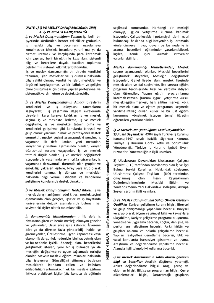 İş ve Meslek Danışmanlığının Hedef Kitlesi: İş ve meslek danışmanlığının hedef kitlesi, meslek seçimi aşamasında olan gençler, işsizler ve iş hayatında kariyerlerinin değişik aşamalarında bulunan her seviyedeki kişiler olarak tanımlanabilir. İş danışmanlığı hizmetlerinden ; İlk defa iş piyasasına giren ve henüz mesleği olmayan gençler ve yetişkinler, Uzun süre işsiz kalanlar, İşverene dört ya da dörtten fazla gönderildiği halde işe giremeyenler, Özelleştirme, işyeri kapanması veya ekonomik durgunluk nedeniyle işini kaybetmiş olan ve bu nedenle işsizlik ödeneği alan, becerilerini geliştirmek isteyen, yeni bir iş bulmada ya da mesleğini değiştirme ve uyum sağlamada zorluğu olanlar, Mevcut mesleki eğitim imkanları hakkında bilgi isteyenler, Güncelliğini yitirmeye başlayan mesleklerde istihdam edilen ve istihdam edilebilirliğini artırmak için ek bir mesleki eğitime ihtiyacı olabilecek kişiler (söz konusu ek eğitimin HÜSEYİN SALUR http://tr-tr.facebook.com/groups/danismanlar/ İş ve Meslek Danışmanlığının Amacı: bireylerin kendilerini ve iş dünyasını tanımalarını sağlayarak; iş yaşamının değişik evrelerinde bireylerin karşı karşıya kaldıkları iş ve meslek seçimi, iş ve meslekte ilerleme, iş ve meslek değiştirme, iş ve meslekte tatmin olma ve kendilerini geliştirme gibi konularda bireysel ve grup olarak yardımcı olmak ve profesyonel destek vermektir. meslek seçimi aşamasındaki gençler, iş yaşamına ilk defa katılan yeni mezunlar, kariyerinin yükselme aşamasında olanlar, kariyer düzleşmesi sorunu yaşayanlar, iş ve meslek tatmini düşük olanlar, iş ve meslek değiştirmek isteyenler, iş yaşamında ayrımcılığa uğrayanlar, iş yaşamında dezavantajlı durumda olan gruplar ve emekliliği yaklaşan kişilere, birey veya grup olarak kendilerini tanıma, iş dünyası ve meslekler hakkında bilgi verme, istihdam ve kendilerini geliştirme konularında destek olmaktır. HÜSEYİN SALUR http://tr-tr.facebook.com/groups/danismanlar/ ÜNİTE-1) İŞ VE MESLEK DANIŞMANLIĞINA GİRİŞ A. İŞ VE MESLEK DANIŞMANLIĞI İş ve Meslek Danışmanlığının Tanımı: İş, belli bir işyerinde sürdürülen benzer etkinlikler grubudur. İş mesleki bilgi ve becerilerin uygulamaya konulmasıdır. Meslek, insanlara yararlı mal ya da hizmet üretmek ve karşılığında para kazanmak için yapılan, belli bir eğitimle kazanılan, sistemli bilgi ve becerilere dayalı, kuralları toplumca belirlenmiş sistemli etkinlikler bütünüdür. İş ve meslek danışmanlığı; bir bireyin kendisini tanıması, işler, meslekler ve iş dünyası hakkında bilgi sahibi olması; kendisi ile işler, meslekler ve örgütleri karşılaştırması ve bir istihdam ve gelişim planı oluşturması için bireye yapılan profesyonel ve sistematik yardım etme ve destek sürecidir. 1 seçilmesi konusunda), Herhangi bir mesleği olmayıp, işgücü yetiştirme kursuna katılmak isteyenler, Çalışabilecekleri potansiyel işlerin nasıl bulunacağı hakkında bilgi isteyenler, İş aramada yönlendirmeye ihtiyaç duyan ve bu nedenle iş arama becerileri eğitiminden yararlanabilecek kişiler, Kendi işini kurmak isteyenler yararlanabilirler. Meslek danışmanlığı hizmetlerinden; Meslek seçme aşamasında olanlar, Mesleki becerilerini geliştirmek isteyenler, Mesleğini değiştirmek isteyenler, Genel lisede alan, meslek lisesinde meslek alanı ve dal seçiminde, lise sonrası eğitim programı tercihlerinde bilgi ve yardıma ihtiyacı olan öğrenciler, Yaygın eğitim programlarına katılmak isteyen (Kurum işgücü yetiştirme kursu, mesleki eğitim merkezi, halk eğitim merkezi vb.), bir meslek alanı ve eğitim programını seçmede yardıma ihtiyaç duyan kişiler ile bir üst eğitim kurumuna yönelmek isteyen temel öğretim öğrencileri yararlanabilirler. İş ve Meslek Danışmanlığının Yasal Dayanakları 1)Ulusal Dayanaklar: 4904 sayılı Türkiye İş Kurumu Kanunu,4447 sayılı İşsizlik Sigortası Kanunu, Türkiye İş Kurumu Görev Yetki ve Sorumluluk Yönetmeliği,, Türkiye İş Kurumu İşgücü Uyum Hizmetleri Yönetmeliğinin ilgili kısımları. 2) Uluslararası Dayanaklar: Uluslararası Çalışma Teşkilatı (ILO) tarafından onaylanmış olan İş ve İşçi Bulma Servisi Kurulması Hakkındaki sözleşme, Uluslararası Çalışma Teşkilatı (ILO) tarafından onaylanmış olan İnsan Kaynaklarının Değerlendirilmesinde Mesleki Eğitim ve Yönlendirmenin Yeri Hakkındaki sözleşme, Avrupa Sosyal şartının ilgili kısımları. İş ve Meslek Danışmanının Sahip Olması Gereken Özellikler: Kariyer geliştirme kuramı bilgisi, Bireysel ve grup danışmanlığı yapabilme becerisi, Bireysel ve grup olarak ölçme ve güncel bilgi ve kaynaklara ulaşabilme, Kariyer geliştirme programı oluşturma, yönetme ve uygulama becerisi, Koçluk, danışma, ve performans iyileştirme becerisi, Farklı kültür ve grupları anlama ve onlarla çalışabilme becerisi, Yapılan faaliyetleri denetleme becerisi, Etik ve yasal konularda hassasiyet gösterme ve uyma, Araştırma ve değerlendirme yapabilme becerisi, Alanıyla ilgili teknolojiyi kullanma becerisi. iş ve meslek danışmanının sahip olması gereken bilgi ve beceriler: Analitik düşünme yeteneği, Anket değerlendirme bilgisi, Araç, gereç ve ekipman bilgisi, Bilgisayar programları bilgisi, Çevre düzenlemeleri bilgisi, Dezavantajlı grupların İş ve Meslek Danışmanlığı İlkeleri: Her birey seçme özgürlüğüne sahiptir,İnsan saygıya değer bir varlıktır, İş ve meslek danışmanlığı hizmetlerinden yararlanmak isteğe bağlıdır , İş ve meslek danışmanlığı hayat boyu yararlanılabilecek bir hizmettir, İş ve meslek danışmanlığı hizmetlerinde gizlilik esastır, İş ve meslek danışmanlığı tüm bireylere açık bir hizmettir, HÜSEYİN SALUR http://tr-tr.faceboo