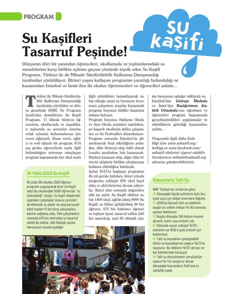 PROGRAM Su Kaşifleri Tasarruf Peşinde! Dünyanın dört bir yanından öğrencileri, okullarında ve toplumlarındaki su meselelerine karşı birlikte eyleme geçme yönünde teşvik eden Su Kaşifi Programı, Türkiye’de de Mikado Sürdürülebilir Kalkınma Danışmanlığı tarafından yürütülüyor. Birinci yaşını kutlayan programın yarattığı farkındalığı ve kazanımları İstanbul ve İzmir’den iki okulun öğretmenleri ve öğrencileri anlattı... T ürkiye’de Mikado Sürdürülebilir Kalkınma Danışmanlığı tarafından yürütülen ve dünya genelinde HSBC Su Programı tarafından desteklenen Su Kaşifi Programı, 11 ülkede binlerce öğrencinin, okullarında ve yaşadıkları toplumda su sorunları üzerine ortak eylemde bulunmalarına izin veren eğlenceli, ilham verici, eğitici ve web tabanlı bir program. 8-14 yaş grubu öğrencilerin suyla ilgili farkındalığını artırmayı amaçlayan program kapsamında her okul suyla İlk Yılda 2500 Su Kaşifi İlk yılda 100 okulda, 2500 öğrenci programı uygulayarak birer Su Kaşifi oldu! Bu okullardaki 5000 öğrencide “su farkındalığı” oluştu. Su Kaşifi ekiplerinin yaptıkları çalışmalar sonucu çevreleri de etkilendi ve aileler ile okul personeli dahil toplam 15 bin birey çalışmalara katılım sağlamış oldu. Tüm çalışmaların sonunda 670 bin metreküp su tasarruf edildi! Bu miktar, 260 Olimpik yüzme havuzunun suyuna eşdeğer. ilgili etkinlikleri tamamlayarak sahip olduğu sanal su havzasını korumaya çalışırken, puanlar kazanarak program boyunca ödüller kazanma imkanı buluyor. Program boyunca Haftanın Okulu ve Ayın Okulu seçimleri yapılırken, en başarılı okullarda atölye çalışmaları ve Su Festivalleri düzenleniyor. Program sonunda İstanbul’da düzenlenecek final etkinliğinin ardından, ülke birincisi ekip ödül olarak Londra seyahatine hak kazanacak. Böylece kazanan ekip, diğer ülke birincisi ekiplerle birlikte uluslararası kutlama etkinliğine katılacak. Şubat 2015’te başlayan programın ilk yılı geride kalırken, ikinci yılında programa yaklaşık 200 okul kayıt oldu ve aktivitelerine devam ediyorlar. İkinci yılın sonunda öngörülen etki ise şöyle: Su Kaşifi ekibine sahip 1400 okul, eğitim almış 9000 Su Kaşifi, su bilinci geliştirilmiş 90 bin öğrenci, 475 bin katılımcı öğrenci ve toplum üyesi, tasarruf edilen 240 bin metreküp, yani 95 olimpik yüz- me havuzuna eşdeğer miktarda su. İstanbul’dan Göztepe İlkokulu ve İzmir’den Başöğretmen Atatürk Ortaokulu’nun öğretmen ve öğrencileri program kapsamında gerçekleştirdikleri uygulamalar ve etkinliklerin getirdiği kazanımları anlattı… Programla ilgili daha fazla bilgi için: www.sukasifi.org/ turkiye ve www.facebook.com/ sukasifi sitelerini ziyaret edebilir. Sorularınızı [email protected] adresine gönderebilirsiniz. Rakamlarla Tatlı Su WWF Türkiye’nin verilerine göre; b Dünyadaki büyük şehirlerin üçte biri, içme suyu için doğal rezervlere bağımlı. b 2030’da küresel tatlı su talebinin, bugün arz edilen miktarı % 40 oranında aşması bekleniyor. b Bugün dünyada 768 milyon insanın güvenli, temiz suya erişimi yok. b Dünyada suyun yaklaşık %70’i, enerjinin ise %30’u gıda üretimi için kullanılıyor. b Tatlı su kaynakları gezegendeki bütün su kaynaklarının sadece %2,5’ini oluşturur. Bu miktarın %70’i de buz ve kar kütlelerinde tutuluyor. b Tatlı su ekosistemleri yeryüzünün sadece % 1’ini oluşturur ancak dünyadaki hayvanların %10’una ev sahipliği yapar. “Kocaman bir Su Ailesi Olduk” Başöğretmen Atatürk Ortaokulu öğretmeni Nilgün Avcı Engüdar Program kapsamında yürüttüğünüz çalışmalardan ve kullandığınız yöntemlerden bahseder misiniz? Su Kaşifi Programı’nda yer alan etkinlik yönergelerini öğrencilerimizle birlikte değerlendirip ne kadar çok kişiye ulaşabiliriz, insanların dikkatini nasıl çekeriz diye düşünüp etkinlikleri ve sunumları ona göre hazırlıyoruz. Belediyemizi, velilerimizi, okul çalışanlarını ve komşularımızı projeye dahil ettik. 20 öğrenci ve bir öğretmenken şimdi kocaman bir su ailesi olduk. Öğrencilerin programa ve çevre konularına karşı ilgileri nasıl? Su Kaşifi ekibimiz 4. ve 6. sınıf öğrencilerinden oluşan 20 kişilik bir ekip. Ancak okulumuzdaki her öğrenci kendini bir Su Kaşifi olarak görüyor ve çalışıyor. Program konularıyla ilgili daha ne yapabilirler diye araştırıyor ve benimle paylaşıyorlar. Programa katılan öğrencilerinizde şimdiden herhangi bir değişim gözlemlediniz mi? Öncelikle işbirliği yapmayı, kendi aralarında iletişim kurup organize olmayı öğrendiler. Aldıkları sorumlulukları yerine getirip sonucunu görünce daha çok çalışmak istediler. Suyu verimli kullanmak hayat felsefeleri oldu. Dünyamızın Suyu etkinliğinde belki de hiç dikkatlerini çekmeyecek ülkelerin yerlerini öğrendiler. Kağıtların geridönüşümüne daha çok dikkat eder oldular. Her bir etkinlik su damlaları şeklinde beyinlerine ve kalplerine birikti. Öğretmenlerimiz de program konularını takip edip Su Kaşifi olma yolunda ilerliyorlar. Çalışmalarınız sırasında size ilginç gelen sahneler yaşandı mı? “Kahve yerine çay iç!” panolarını hazırladığımızda öğretmenlerimiz ve öğrencilerimiz bunun yanlış olduğu- 10 Dilde “Temiz Su İstiyorum” Başöğretmen Atatürk Ortaokulu öğrencisi Yağmur Gül İlk olarak temiz suya ulaşımı en az olan 10 ülkeyi araştırıp öğrendik. Atık malzemelerden bir dünya haritası yapıp bu ülkeleri harita üzerinde belirttik, 10 dilde “Temiz su istiyorum” demeyi öğrendik. Okul bahçemizde kendi sebzelerimizi yetiştirmek için belediyemizden toprak istedik. Bahçemizde soğanlar, tereler ve maydanozlar yetiştirdik. Bir değiş-tokuş partisi yaptık. Bu partide aynı zamanda büyüyen 