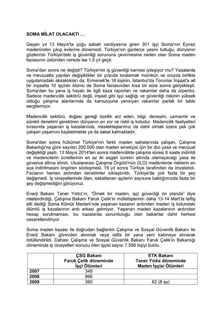 SOMA MİLAT OLACAKTI … Geçen yıl 13 Mayıs'ta çoğu sabah vardiyasına giren 301 işçi Soma'nın Eynez madeninden çıkıp evlerine dönemedi. Türkiye'nin günlerce yasını tuttuğu, dünyanın gözlerinin Türkiye'deki iş güvenliği sorununa çevirmesine neden olan Soma maden faciasının üstünden nerede ise 1,5 yıl geçti. Soma'dan sonra ne değişti? Türkiye'nin iş güvenliği karnesi iyileşiyor mu? Yasalarda ve mevzuatta yapılan değişiklikler bir çırpıda sıralamak mümkün ve onunla birlikte uygulamadaki aksaklıkları da. Ermenek'te 18 kişinin, İstanbul'da Torunlar İnşaat'a ait bir inşaatta 10 işçinin ölümü de Soma faciasından kısa bir süre sonra gerçekleşti. Soma’dan bu yana iş hayatı ile ilgili kaza raporları ve rakamlar daha da ürpertici. Sadece madencilik sektörü değil, inşaat gibi işçi sağlığı ve güvenliği riskinin yüksek olduğu çalışma alanlarında da kamuoyuna yansıyan rakamlar parlak bir tablo sergilemiyor. Madencilik sektörü, doğası gereği özellik arz eden, bilgi, deneyim, uzmanlık ve sürekli denetimi gerektiren dünyanın en zor ve riskli iş koludur. Madencilik faaliyetleri sırasında yaşanan iş kazalarında, meslektaşlarımız da dahil olmak üzere pek çok çalışan yaşamını kaybetmekte ya da sakat kalmaktadır. Soma'dan sonra hükümet Türkiye'nin farklı maden sahalarında çalışan, Çalışma Bakanlığı'na göre sayıları 200.000 olan maden emekçisi için bir dizi yasa ve mevzuat değişikliği yaptı. 13 Mayıs 2014'ten sonra madencilikte çalışma süresi 6 saate indirildi ve madencilerin ücretlerinin en az iki asgari ücretin altında olamayacağı yasa ile güvence altına alındı. Uluslararası Çalışma Örgütü'nün (ILO) madenlerde risklerin en aza indirilmesini öngören sözleşmesi, 19 yıl sonra Türkiye tarafından da imzalandı. Facianın hemen ardından denetimler sıklaştırıldı. Türkiye'de çok fazla bir şey değişmedi. İş cinayetlerinde ölen, sakatlanan işçilerin sayısına baktığımızda fazla bir şey değişmediğini görüyoruz. Enerji Bakanı Taner Yıldız’ın, “Örnek bir maden, işçi güvenliği ön planda” diye nitelendirdiği, Çalışma Bakanı Faruk Çelik’in müfettişlerinin daha 13-14 Mart’ta teftiş etti dediği Soma Kömür Madeni’nde yaşanan kazanın ardından maden iş kolundaki ölümlü iş kazalarının ardı arkası gelmiyor. Yaşanan maden kazalarının ardından hesap sorulmaması, bu kazalarda sorumluluğu olan bakanlar dahil herkesi cesaretlendiriyor. Soma maden kazası ile doğrudan bağlantılı Çalışma ve Sosyal Güvenlik Bakanı ile Enerji Bakanı görevden alınmak veya istifa bir yana yeni kabineye alınarak ödüllendirildi. Dahası Çalışma ve Sosyal Güvenlik Bakanı Faruk Çelik’in Bakanlığı döneminde iş cinayetleri sonucu ölen işçisi sayısı 7.596 kişiyi buldu. 2007 2008 2009 ÇSG Bakanı Faruk Çelik döneminde İşçi Ölümleri 348 866 390 ETK Bakanı Taner Yıldız döneminde Maden İşçisi Ölümleri 62 (8 ay) 2010 2011 2012 2013 2014 2015 TOPLAM 855 (6 ay) 878 1.235 1.886 1.138 (8 ay) 7.596 105 77 61 95 386 39 (8 ay) 825 Son olarak, "Geçici Hükümet" tarafından 4 Ağustos 2015 tarihli Resmi Gazete`de yayınlanan madenlere ait kararname ile ATEX standartları olarak adlandırılan ve denetimlerde eksiklikler nedeni ile 66 yeraltı kömür ocağının kapatılmasına neden olan uluslararası standartlar ülkemiz ocaklarında 2020 yılına kadar uygulanmayacak. 13 Mayıs 2014 tarihinde Soma’da 301 maden emekçinin ölümü ile sonuçlanan kazanın ardından yaşanan ölümlü maden kazalarında beklenildiği gibi en fazla ölümlü kaza, yeraltı kömür işletmelerinde meydana gelmiştir. Yeraltı maden işletmelerinde toplam 37 maden emekçisi iş kazalarında yaşamını yitirirken, bunu sırasıyla 15 ölümlü iş kazası ile agrega ve kum ocakları, 12 ölüm ile mermer ocakları, 11 ölüm ile krom, demir ve boksit gibi metal madeni işletmeleri, açık kömür ocakları, endüstriyel hammadde işletmeleri, sondaj çalışmaları ve tünelcilik faaliyetleri izledi. Elimizde bulunan verilerle madenlerde yaşanan ölümlü iş kazalarının nedenlerini kesin olarak belirlemek çok zor. İşçi Sağlığı İş Güvenliği Meclisi verileri ve medyada yer alan haberler değerlendirildiğinde Soma’daki maden faciasından sonra yaşanan maden kazalarının çeşitleri aşağıda gösterilmektedir. Teknik Neden Göçük Suda Boğulma Makinalara bağlı kazalar Kamyonlara bağlı kazalar Ezilme Oksijen yetersizliği Kişi 42 19 16 8 7 7 Teknik Neden Trafik Kazası Elektrik çarpması Kalp Krizi Patlatma çalışmaları Tespit edilemeyen TOPLAM Kişi 7 4 3 2 1 116 Bu tablodan da görüldüğü gibi yeraltı çalışmaları sonucu oluşan göçükler, en fazla ölümlü iş kazalarına neden olan maden kazaları olmakla birlikte maden ve iş makinalarına bağlı olan ve mermer ocakları, kum ocakları ve açık maden ocaklarında yaşanan ölümlü maden kazaları da oldukça yoğundur. Bu tablodan da açıkça görülebileceği gibi yaşanan maden kazalarının çok önemli bir bölümü “önlenebilir iş kazaları”ndan kaynaklanmaktadır. Soma faciasından bu yana yitirdiğimiz 116 maden emekçisi toplam 38 ilimizde ve 86 maden kazasında yaşamlarını yitirmiştir. Bu iş cinayetlerinden ikisi Soma’da, 301 canımızı yitirdiğimiz ocağa komşu maden ocaklarında meydana gelmiştir. Bundan da anlaşılacağı gibi yaşanan kazalardan Soma’da bulunan maden işletmecileri dahi gerekli dersi çıkarmamışlardır. Ölümlü maden kazalarının yaşandığı bölgeler değerlendirildiğinde ise yine karşımıza yeraltı kömür madenciliğine ilişkin illerimiz ön plana çıkmaktadır. 1 Mayıs 2014’den bu yana yaşanan 116 ölümlü iş kazalarının 20’si Zonguldak ve Bartın gibi taşkömürü havzasında meydana gelen kazalardır. Kömür madenciliğini