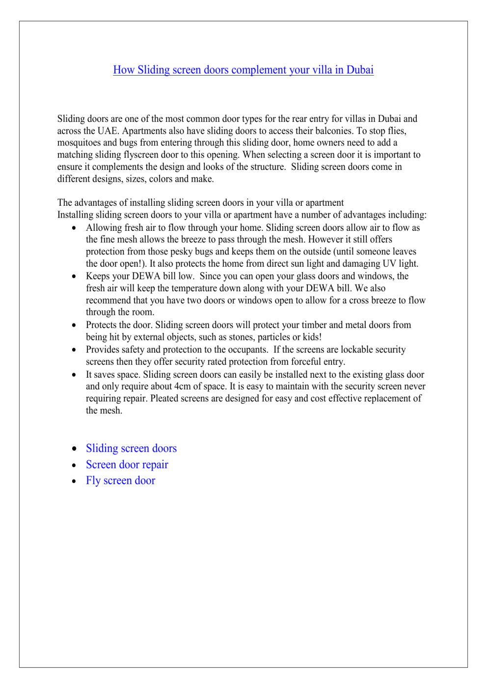 How Sliding screen doors complement your villa in Dubai Sliding doors are one of the most common door types for the rear entry for villas in Dubai and across the UAE. Apartments also have sliding doors to access their balconies. To stop flies, mosquitoes and bugs from entering through this sliding door, home owners need to add a matching sliding flyscreen door to this opening. When selecting a screen door it is important to ensure it complements the design and looks of the structure. Sliding screen doors come in different designs, sizes, colors and make. The advantages of installing sliding screen doors in your villa or apartment Installing sliding screen doors to your villa or apartment have a number of advantages including: Allowing fresh air to flow through your home. Sliding screen doors allow air to flow as the fine mesh allows the breeze to pass through the mesh. However it still offers protection from those pesky bugs and keeps them on the outside (until someone leaves the door open!). It also protects the home from direct sun light and damaging UV light. Keeps your DEWA bill low. Since you can open your glass doors and windows, the fresh air will keep the temperature down along with your DEWA bill. We also recommend that you have two doors or windows open to allow for a cross breeze to flow through the room. Protects the door. Sliding screen doors will protect your timber and metal doors from being hit by external objects, such as stones, particles or kids! Provides safety and protection to the occupants. If the screens are lockable security screens then they offer security rated protection from forceful entry. It saves space. Sliding screen doors can easily be installed next to the existing glass door and only require about 4cm of space. It is easy to maintain with the security screen never requiring repair. Pleated screens are designed for easy and cost effective replacement of the mesh. Sliding screen doors Screen door repair Fly screen door Factors to consider in choosing your sliding screen doors: a. Style. Style is one factor to be considered in choosing the best sliding screen doors. It should follow the characteristics of the premise and match the colour of the existing frame. b. The brand. By selecting a quality and reputable brand, you know the screen is designed to last. A strong warranty is also a mark of a brand that stands behind its product. c. The design. The design must be match with the design of the existing door or window. d. The frame. There many types of frame material. In Dubai and the UAE we find aluminium and uPVC are the most common. We recommend aluminium flyscreen frames in most circumstances. e. The price. Often one of the main factors when selecting a screen although one that often sends people looking for a cheap solution that may not last or meet their needs. f. Warranty. The product must come with a complete warranty. For more information visit here… https://safetyscreens.ae/ Where can you buy a sliding screen door? Sliding screen doors are available from a few different providers across the UAE. Screens such as a stainless steel mesh security screen are only available from one manufacturer in the UAE, Safety Screens Metal Doors LLC. You can find further product related information on their website: www.safetyscreens.ae. They also assist clients in designing their insect protection solution and offer an obligation free measure and quote.