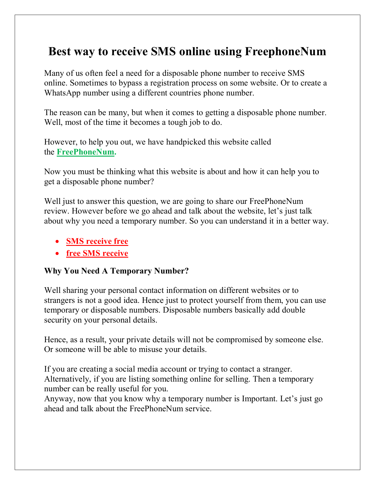 Best way to receive SMS online using FreephoneNum Many of us often feel a need for a disposable phone number to receive SMS online. Sometimes to bypass a registration process on some website. Or to create a WhatsApp number using a different countries phone number. The reason can be many, but when it comes to getting a disposable phone number. Well, most of the time it becomes a tough job to do. However, to help you out, we have handpicked this website called the FreePhoneNum. Now you must be thinking what this website is about and how it can help you to get a disposable phone number? Well just to answer this question, we are going to share our FreePhoneNum review. However before we go ahead and talk about the website, let’s just talk about why you need a temporary number. So you can understand it in a better way. SMS receive free free SMS receive Why You Need A Temporary Number? Well sharing your personal contact information on different websites or to strangers is not a good idea. Hence just to protect yourself from them, you can use temporary or disposable numbers. Disposable numbers basically add double security on your personal details. Hence, as a result, your private details will not be compromised by someone else. Or someone will be able to misuse your details. If you are creating a social media account or trying to contact a stranger. Alternatively, if you are listing something online for selling. Then a temporary number can be really useful for you. Anyway, now that you know why a temporary number is Important. Let’s just go ahead and talk about the FreePhoneNum service. For More Information Visit Here :- https://freephonenum.com Introduction: Starting with the introduction, Well FreePhoneNum is one of the best websites to receive SMS online. The site offers around 113 numbers from different countries. These countries include the United States, United Kingdom, Spain, Sweden and many others. Even using the website is a super easy task. Moreover, the site is completely free to use, and you do not need to download an app for this. It is a complete web-based service which can help you to receive SMS online. It also lets you choose a number from a bunch of numbers of a specific country. Even you can use different numbers at the same time as a particular location. This means if you can sign up on a website with a specific number and at the same time you can use another number for a different site. Even you can manage both of these numbers at the same time which is a really amazing feature of the FreePhoneNum. Also on the website, you will find the old verification number of a specific location. Another useful feature of the website is that it even lets you send free SMS. But the sad part is that as of now you can only send a free SMS to USA and Canada Numbers. However, it is mentioned that they will soon allow users to send a free SMS to other locations as well. So that was a small introduction to the FreePhoneNum website. Now to give you a better idea about this web-based receive SMS online service. Let us talk about some of the top features of the website. So here we go: Top Features of FreePhoneNum: Disposable Numbers: First of all, the website offers disposable or temporary numbers to anyone on the internet. The website generates new numbers on weekly basis and makes sure that you are getting the top notch services. FreePhoneNum’s system automatically generates free numbers on the basis of their user base. Receive SMS online: FreePhoneNum is one of the best ways to Receive SMS online. You can easily receive an SMS on one of the listed numbers on the website. Even you can use the number to verify for any services online. Such as you can use the numbers for Facebook, Google, Gmail, WhatsApp, Viber, Line and other websites. But, as of now, the website is not offering a bunch of numbers from a different location. However, they are going to expand their database for other countries as well. Send Free SMS Another feature that offered by this website is the send free SMS. There are often times when we do feel a need of sending a free SMS. Maybe we are going to text a stranger with whom we do not want to share our personal number. In such cases, the send free SMS feature of FreePhoneNum comes in handy. Simply go to their website and type the receiver’s phone number and the text that you wish to send and you are done. So those were the top features that FreePhoneNum is offering. Now Let’s just go ahead and talk about how to use FreePhoneNum for receiving and sending SMS. How to receive SMS online using FreePhoneNum First of all, go to the FreePhoneNum website. After that, you will get to see different country names. Simply click on your preferred country. Then on the next page, you will find a list of a bunch of numbers. Simply click one of the numbers from then. After that simply copy and paste the number wherever you to use. Once done, you will find an SMS under that number window. Then follow the screen instructions and get done with your job. How to send free SMS using FreePhoneNum At first, go to the FreePhoneNum site. Then from the navigation menu select Send Text. After that, you need to enter a phone number along with the country code. (Make sure it’s a Canada or USA number) Then type the text that you wish to send. In the end, simply fill a captcha and click on the send button. Also over here, you will find a view replies option which you can use to see the replies to your texts. So that was all for the tutorials and FreePhoneNum review. Now it’s your call to give the website a try to receive SMS online. Also for any questions, you can feel free to leave a comment below, and we will surely reply to you.