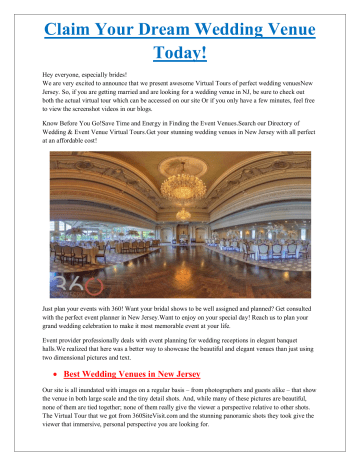 Claim Your Dream Wedding Venue Today! Hey everyone, especially brides! We are very excited to announce that we present awesome Virtual Tours of perfect wedding venuesNew Jersey. So, if you are getting married and are looking for a wedding venue in NJ, be sure to check out both the actual virtual tour which can be accessed on our site Or if you only have a few minutes, feel free to view the screenshot videos in our blogs. Know Before You Go!Save Time and Energy in Finding the Event Venues.Search our Directory of Wedding & Event Venue Virtual Tours.Get your stunning wedding venues in New Jersey with all perfect at an affordable cost! Just plan your events with 360! Want your bridal shows to be well assigned and planned? Get consulted with the perfect event planner in New Jersey.Want to enjoy on your special day! Reach us to plan your grand wedding celebration to make it most memorable event at your life. Event provider professionally deals with event planning for wedding receptions in elegant banquet halls.We realized that here was a better way to showcase the beautiful and elegant venues than just using two dimensional pictures and text. Best Wedding Venues in New Jersey Our site is all inundated with images on a regular basis – from photographers and guests alike – that show the venue in both large scale and the tiny detail shots. And, while many of these pictures are beautiful, none of them are tied together; none of them really give the viewer a perspective relative to other shots. The Virtual Tour that we got from 360SiteVisit.com and the stunning panoramic shots they took give the viewer that immersive, personal perspective you are looking for. The virtual tours cover all of the important aspects of these New Jersey wedding venues, and most importantly gives brides the best view of the venue possible. You can stay right where you are, wherever that may be, and visit the many venues which could very well be where you host the wedding or special event you’re planning for yourself or planning for brides and grooms who are looking for the perfect wedding venue for their best day ever. It’s that easy and convenient because of 360sitevisit.com! These ultra-high-quality 360 virtual tours take you throughout every one of these wedding venues. From outside to inside, and room to room, you can experience for yourself these wedding venues at any time and place. Each and every virtual tour takes you through the wedding ceremony and wedding reception. The rooms and areas of every venue on 360sitevisit.com are always available for you 24/7 and 365 days a year.From rustic chic to classic elegance to modern sophistication and so much more, these virtual tours will take you there. Magazine and website pictures don’t tell enough of the story… Just go to 360sitevisit.com and be taken to these venues so you can see them for yourself. These wedding venue virtual tours are like tickets or invitations to venues without having to get to all of them. It’s like a VIP pass but better because brides and grooms have free access to these wedding venue virtual tours 24/7. You can go wherever you want, whenever you want to find your perfect wedding venue. Why flip through the pages of those wedding magazines with pretty pictures when you can virtually walk through these 360 virtual tours to see for yourself what every one of them has to offer! Save time and visit wedding venues virtually by visiting http://360sitevisit.com.